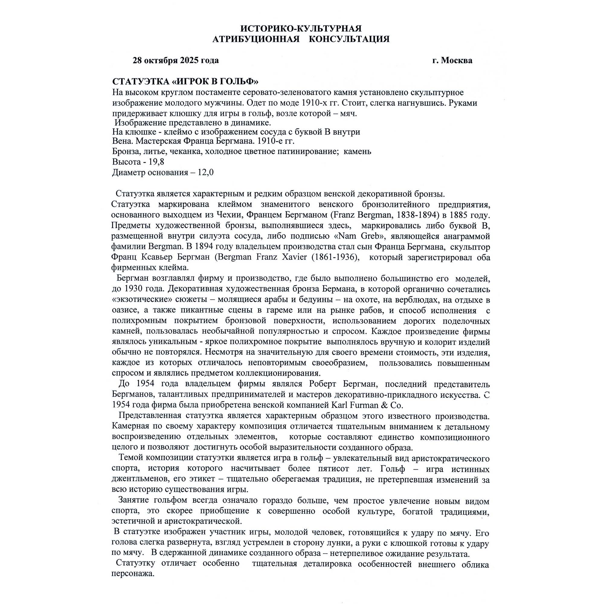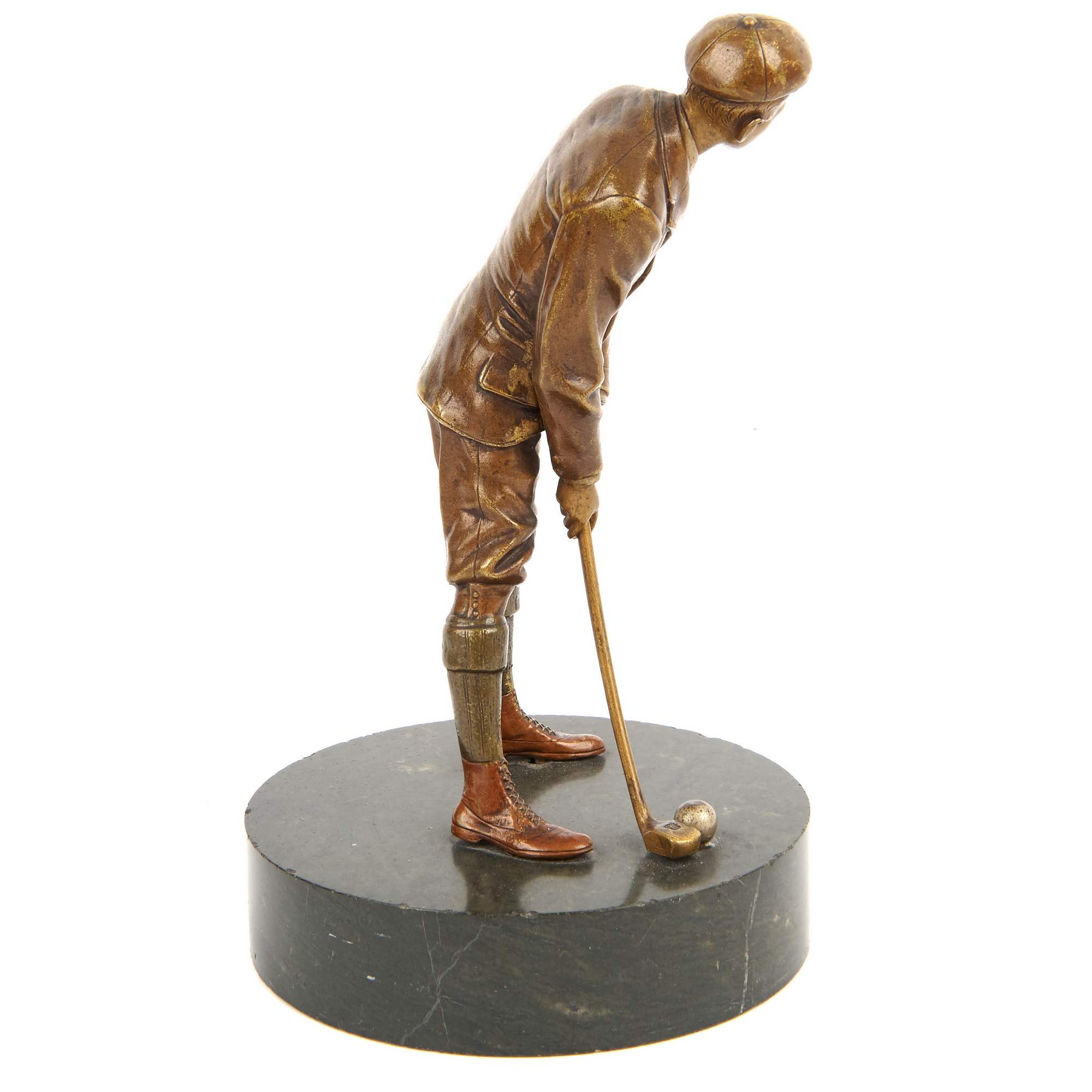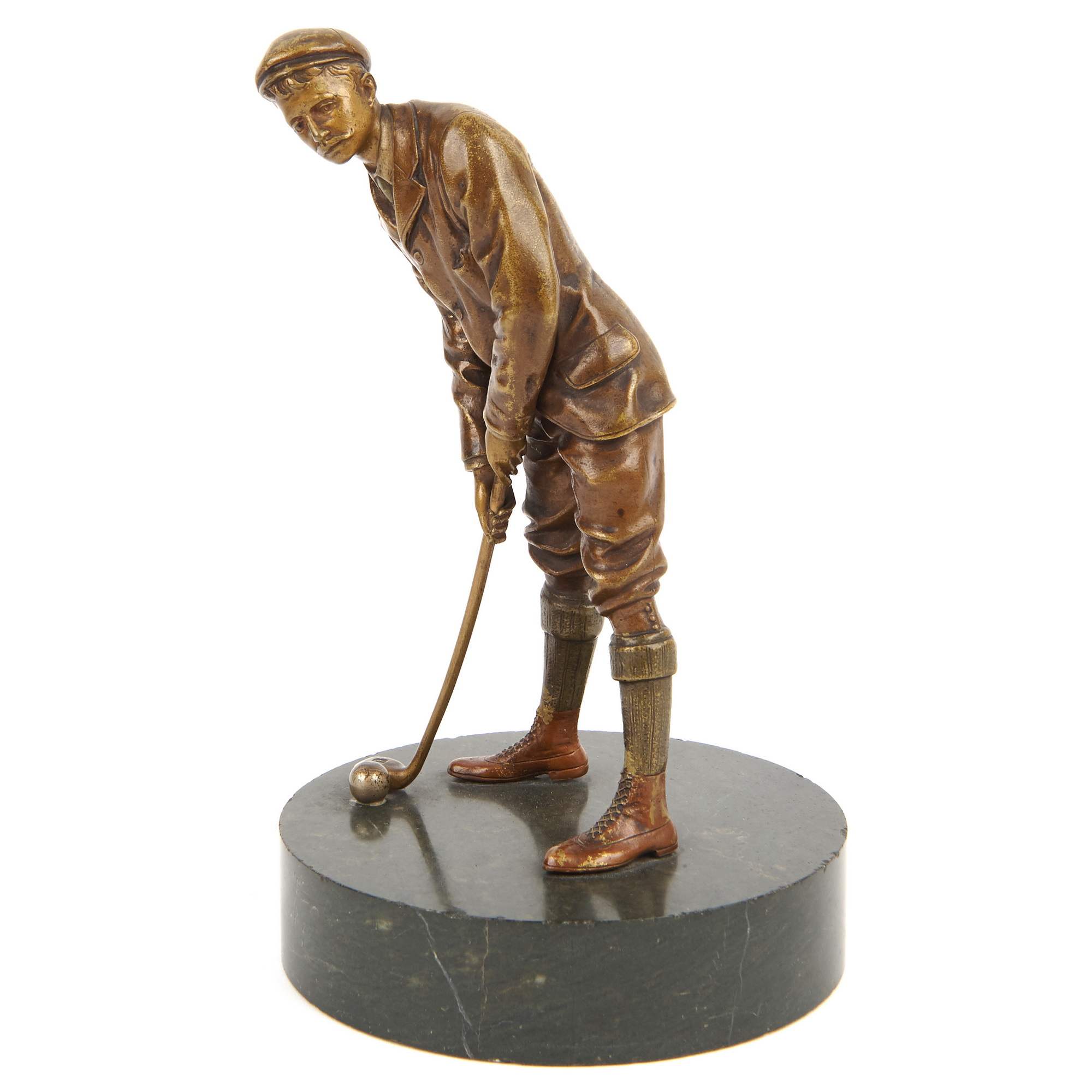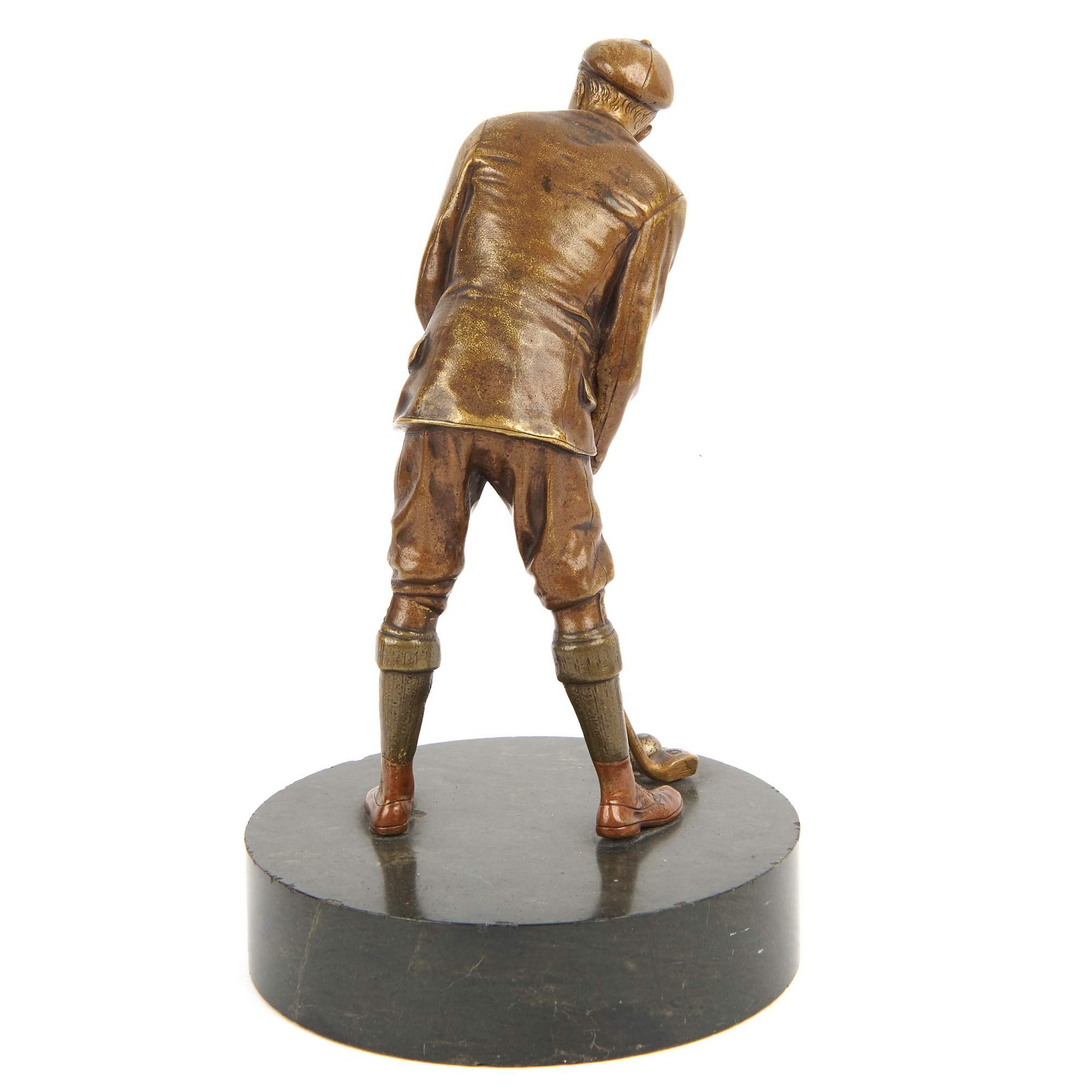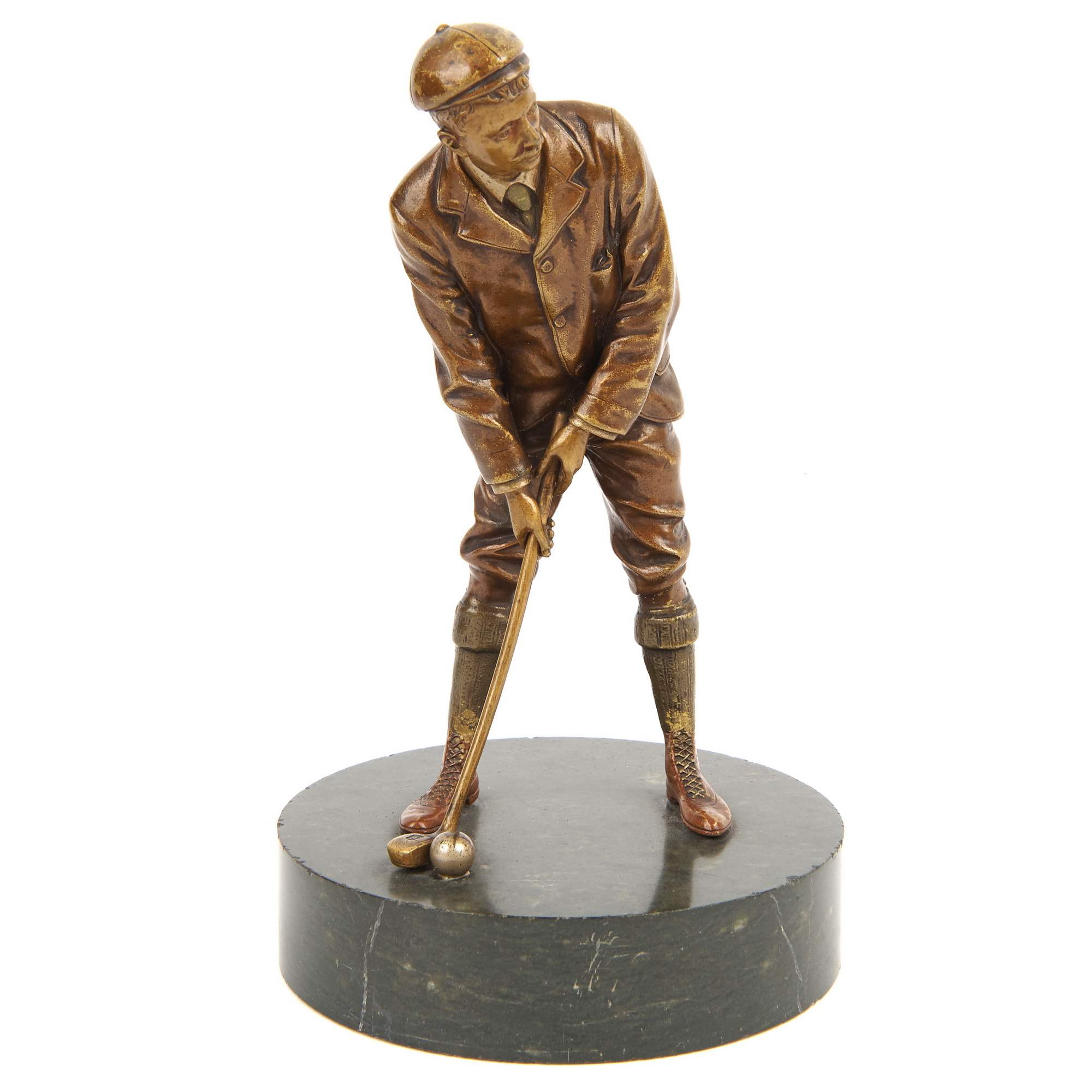 Красивая бронзовая статуэтка игрока в гольф на высоком постаменте серовато-зеленого камня. Камерная композиция исполнена с большим вниманием к деталям. Обаятельный и хорошо одетый молодой человек готовится к удару по мячу. Руки крепко держат клюшку, выверена поза. Но несмотря на кажущуюся холодную сосредоточенность на ударе, по взгляду мужчины отчетливо видно - он в азарте, ему уже не терпится увидеть результат. В бронзе грамотно продемонстрирован момент увлеченной игры в гольф. Этот вид спорта существует уже более пятисот лет. Издавна он считался изысканным развлечением для истинных джентельменов, а его этикет - тщательно оберегаемая традиция, не перетерпевшая изменений за всю свою историю. Занятие гольфом всегда означало нечто большее, чем просто спорт. Это считалось приобщением к совершенно особой культуре - аристократической и эстетичной. Исполнена статуэтка на знаменитом венском бронзолитейном предприятии Бергмана. Его декоративная художественная бронза отличалась не только разнообразием сюжетов и высоким качеством литья, но и ярким полихромным покрытием, выполнявшимся вручную. Благодаря этому, колорит изделий не повторялся, делая каждое произведение уникальным. Фигуры, подобные этой, редки для ассортимента изделий венского предприятия. Немаловажно упомянуть и хорошую сохранность статуэтки и постамента, что почти не встречается. Художественная бронза Бергмана в настоящее время является предметом особенно увлеченного коллекционирования.