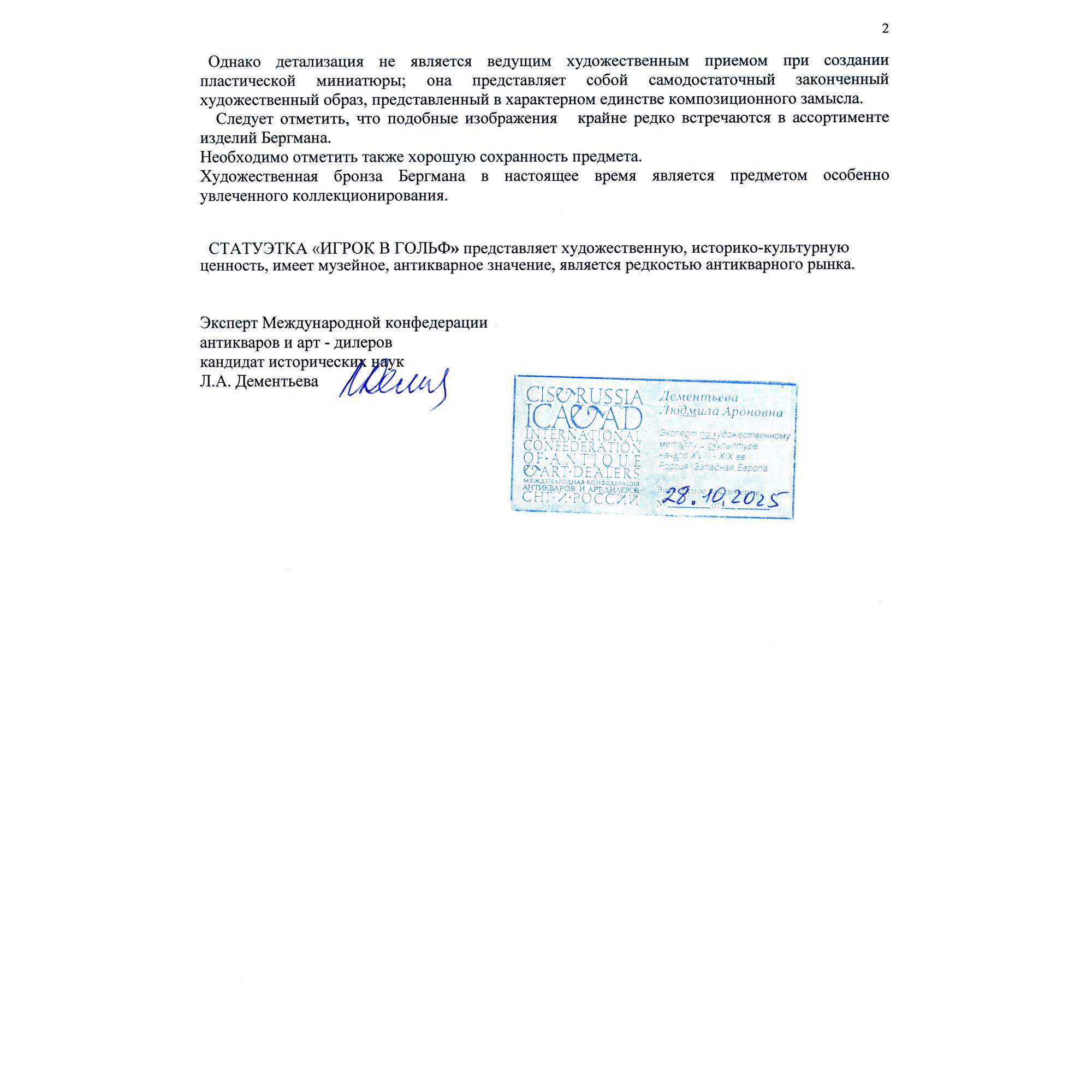 Экспертное заключение: заведующая отделом металла ГИМ хранитель коллекции бронзы, эксперт по культурным ценностям Росохранкультуры, кандидат исторических наук Л. А. Дементьева.