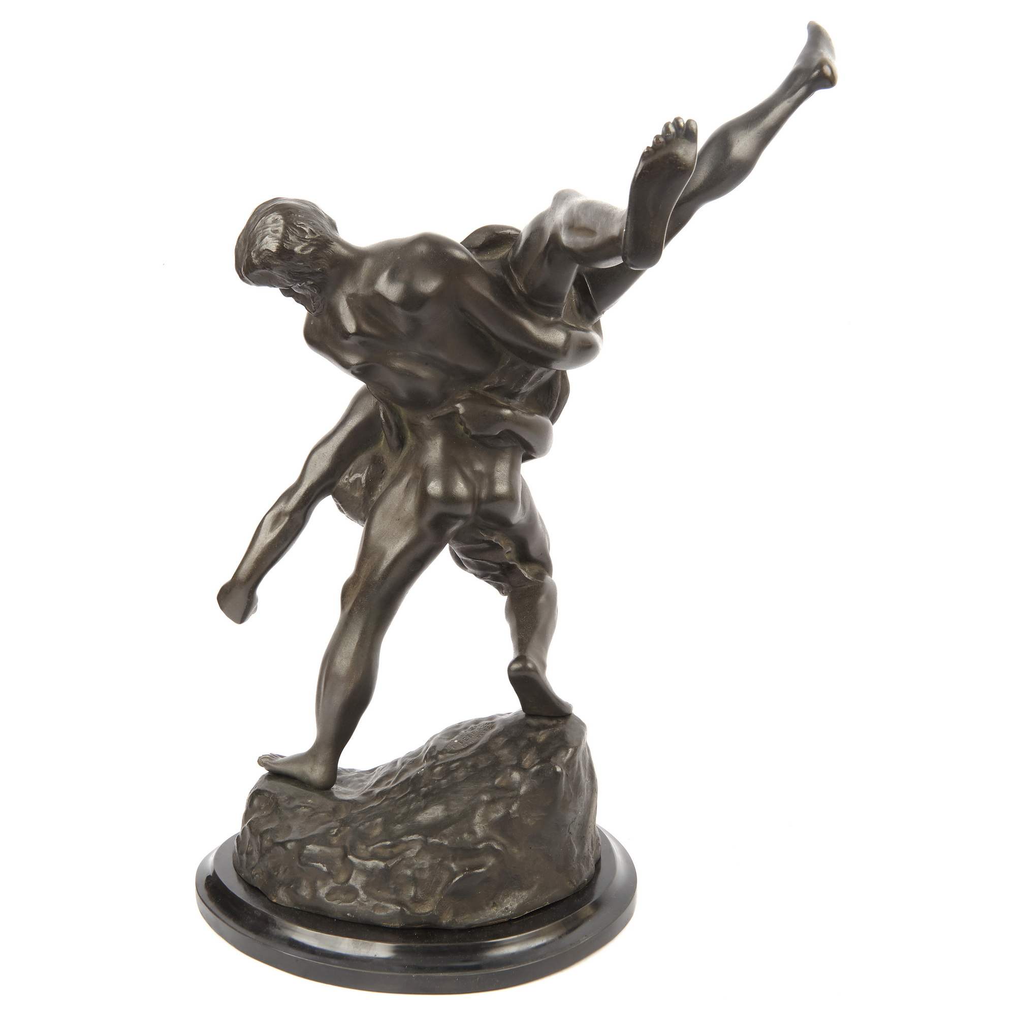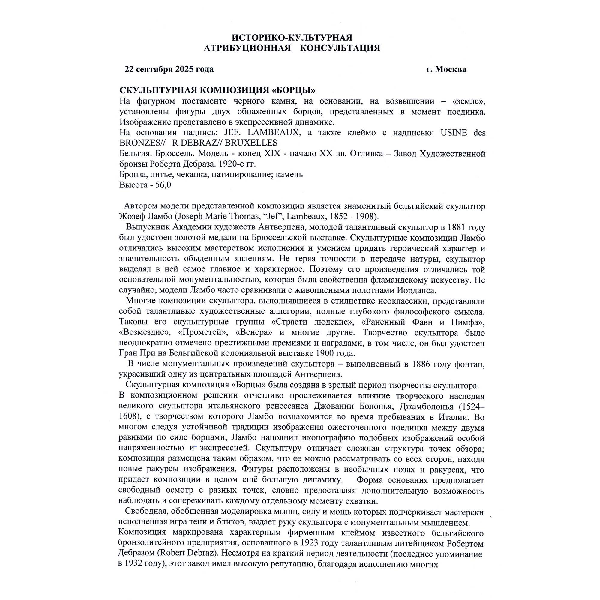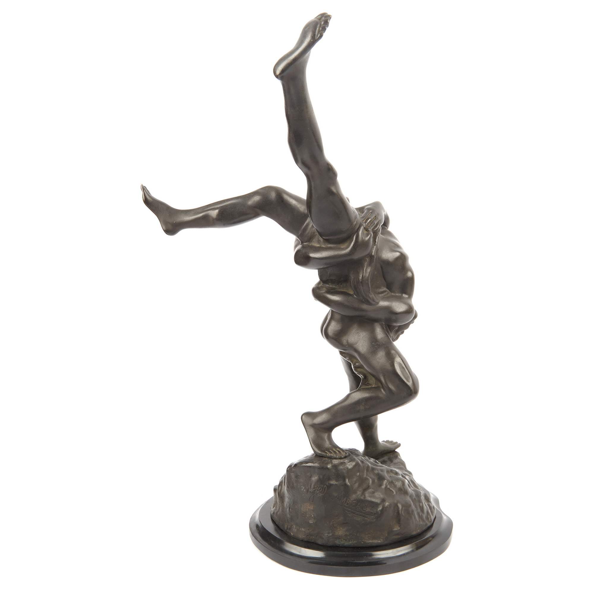Замечательная, мощная, старинная бронзовая скульптура двух борцов, на красивом каменном постаменте. Свободная моделировка мышц подчеркивает силу и мощь атлетов. Мужественные лица напряжены, но в то же время полны монументальной воли и стремления к победе. Вместе с большой динамикой в композиции отчетливо чувствуется экспрессия. Темная плотная патина придает фигурам борцов еще большей выразительности. Безусловно заметно, как автор модели умело придает героический характер и значительность, казалось бы, обыденному явлению. Исполнена скульптура по модели знаменитого бельгийского скульптора Жозефа Ламбо. Он был выпускником престижной Академии художеств Антверпена. Первый успех и похвалу зрителей снискал еще совсем молодым, удостоившись золотой медали на Брюссельской выставке. Творчество Ламбо неоднократно отмечалось высокими наградами, в том числе, Гран При на Бельгийской колониальной выставке 1900 года. Славился он не только кабинетными моделями, но и монументальными композициями. Например, Жозеф Ламбо выполнил в 1886 году фонтан на одной из центральных площадей Антверпена. Не менее примечателен и отливщик представленной модели. Согласно подлинному фирменному клейму, отливку выполняло известное бельгийское бронзолитейное предприятие, основанное Робертом Дебразом. Завод имел высокую репутацию, благодаря высококачественным произведениям, ассортимент которых был весьма велик.