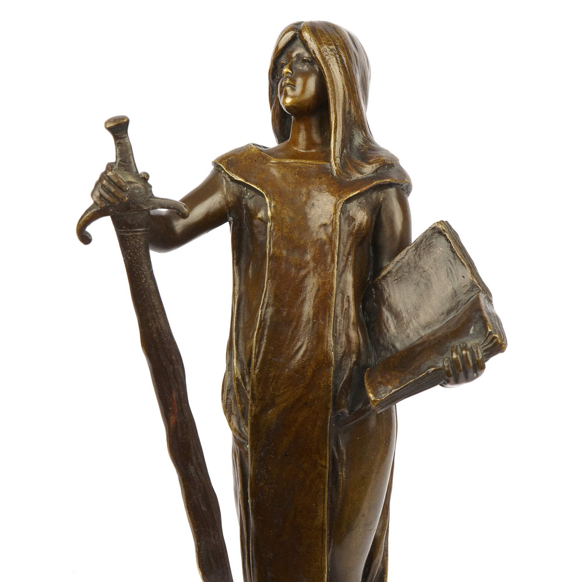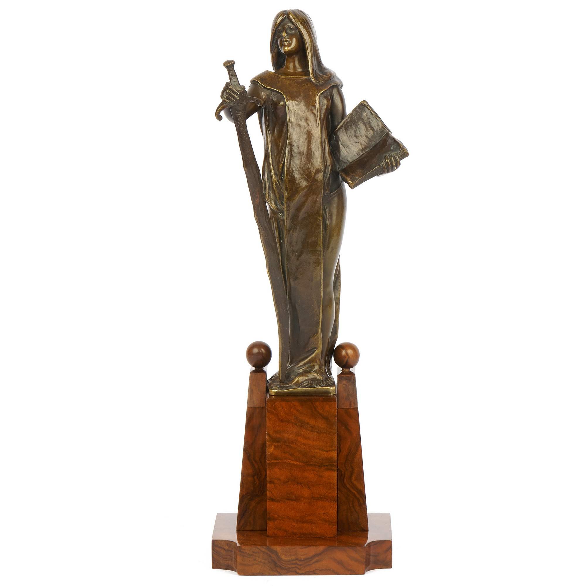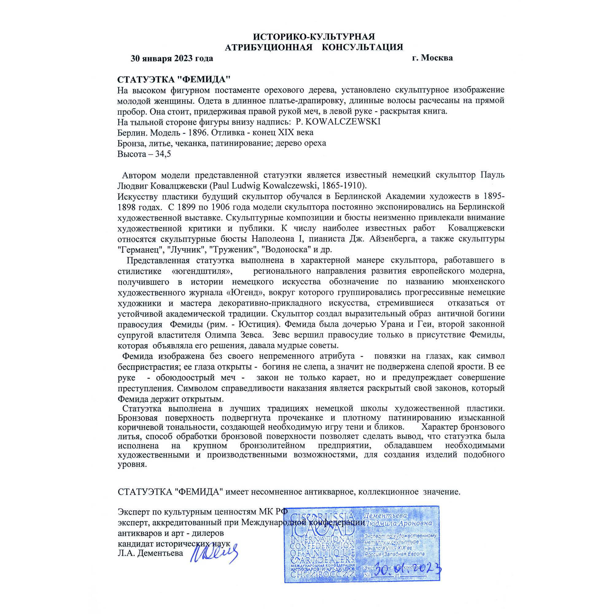 Завораживающая своей самобытностью статуэтка Юстиции, исполненная в Германии в конце XIX века. Ковалцжевский – известный немецкий скульптор (1865 – 1910), получивший блестящее образование в одном из лучших учебных заведений Европы – Берлинской Академии художеств. Его работы экспонировались на Берлинской художественной выставке, неизменно привлекая зрителей и критиков высоким уровнем исполнения и народной тематикой: главными героями его произведений стали рабочие, немецкие герои, этносы Германии и аллегории. К числу последних относится и представленная статуэтка. Образ античной богини справедливости и порядка Юстиции (греч. Фемида), созданный Ковалцжевским уникален. Во-первых, сам по себе югендштиль, в рамках которого исполнена скульптура, неповторимое национальное явление модерна, прославившее немецких скульпторов на весь мир. Во—вторых, Фемида предстает перед нами в совершенно неклассическом виде: вместо традиционного греческого хитона она облачена в сюрко, немецкую средневековую одежду, примечательную тем, что ее носили и рыцари и женщины; в руках она держит меч в длинных сыромятных ножнах, вероятно ландскнехт, форма которого, изогнутая, неаккуратная, напоминает варварскую – следует отметить, что именно такими «неаккуратными» мечами варвары победили сильнейшую империю мира – Римскую, образовав на ее обломках свои государства; вместо весов Фемида держит в руке книгу – свод законов, как бы говорящий зрителю, что новое мерило справедливости не мистический артефакт, а свод законов; и самое примечательное – глаза богини больше не завязаны, она уверенно и грозно взирает вдаль, выражая множество противоречивых, но волнующих смыслов. Таким образом, скульптор создает новый уникальный образ античной богини, сменившей свои атрибуты, но не изменившей своей сути – справедливости. Благодаря великолепной работе скульптора, качеству изделия, национальному направлению модерна и уникальному внутреннему смыслу скульптура обладает культурным и историческим значением и представляет большую ценность для антикварного рынка. Хорошая сохранность, мраморная подставка. Антиквариат.