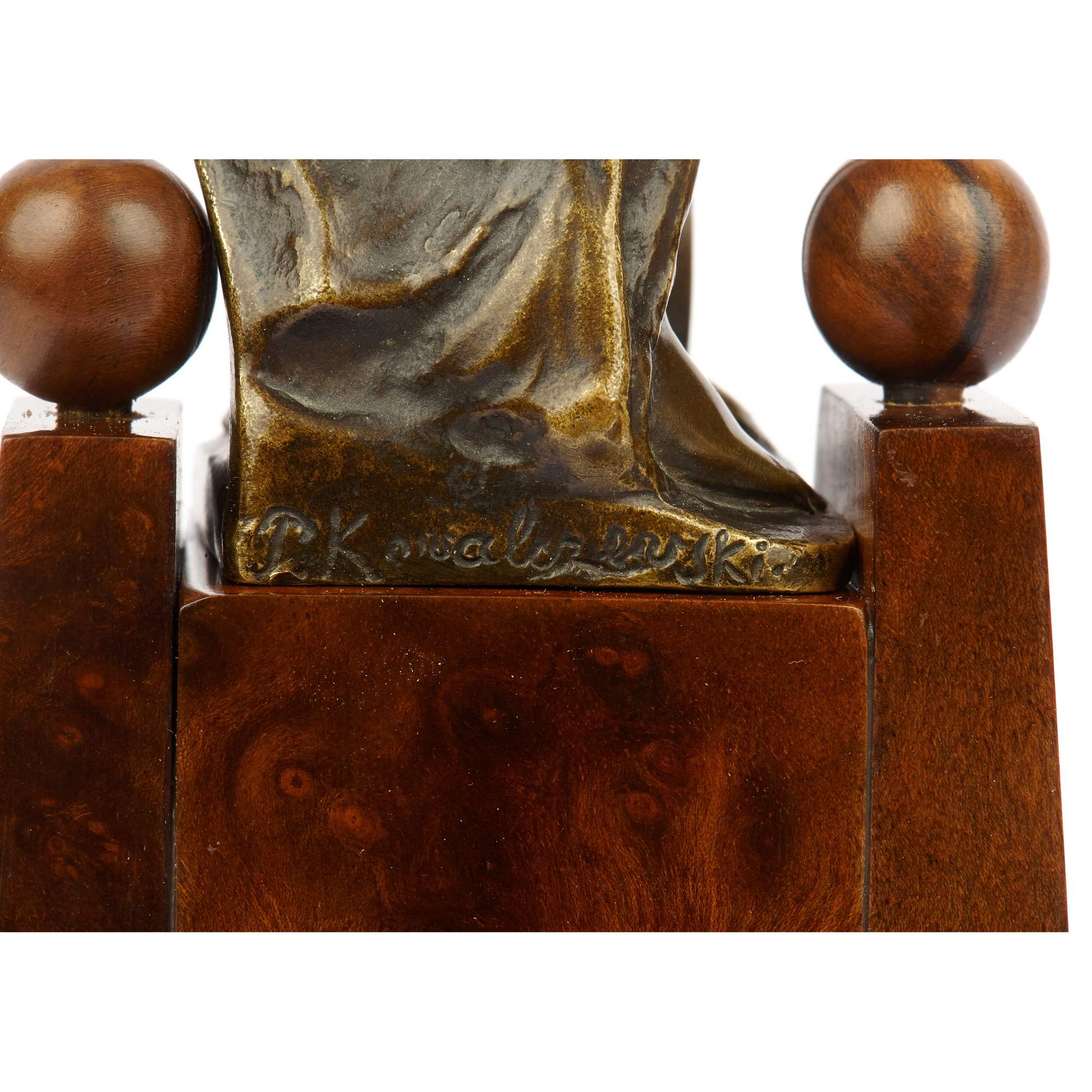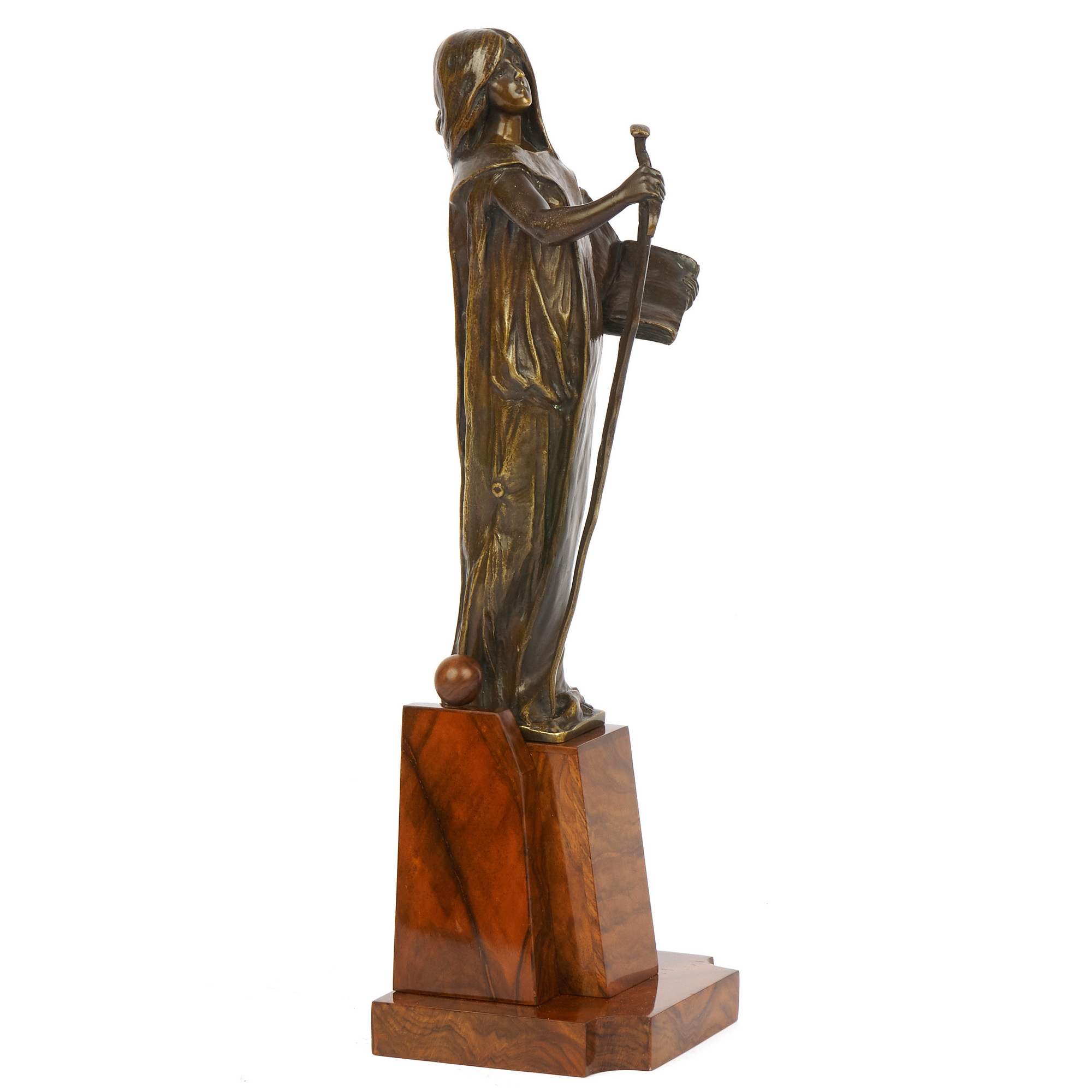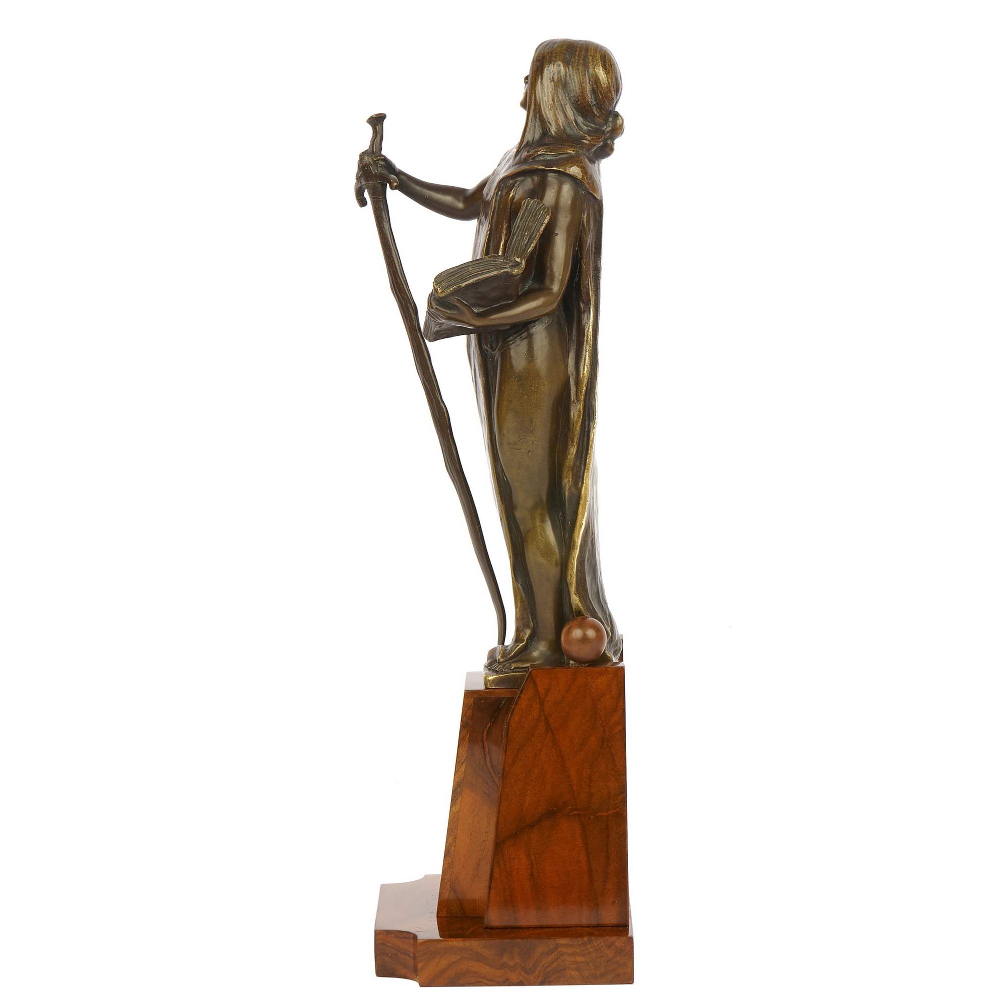 Завораживающая своей самобытностью статуэтка Юстиции, исполненная в Германии в конце XIX века. Ковалцжевский – известный немецкий скульптор (1865 – 1910), получивший блестящее образование в одном из лучших учебных заведений Европы – Берлинской Академии художеств. Его работы экспонировались на Берлинской художественной выставке, неизменно привлекая зрителей и критиков высоким уровнем исполнения и народной тематикой: главными героями его произведений стали рабочие, немецкие герои, этносы Германии и аллегории. К числу последних относится и представленная статуэтка. Образ античной богини справедливости и порядка Юстиции (греч. Фемида), созданный Ковалцжевским уникален. Во-первых, сам по себе югендштиль, в рамках которого исполнена скульптура, неповторимое национальное явление модерна, прославившее немецких скульпторов на весь мир. Во—вторых, Фемида предстает перед нами в совершенно неклассическом виде: вместо традиционного греческого хитона она облачена в сюрко, немецкую средневековую одежду, примечательную тем, что ее носили и рыцари и женщины; в руках она держит меч в длинных сыромятных ножнах, вероятно ландскнехт, форма которого, изогнутая, неаккуратная, напоминает варварскую – следует отметить, что именно такими «неаккуратными» мечами варвары победили сильнейшую империю мира – Римскую, образовав на ее обломках свои государства; вместо весов Фемида держит в руке книгу – свод законов, как бы говорящий зрителю, что новое мерило справедливости не мистический артефакт, а свод законов; и самое примечательное – глаза богини больше не завязаны, она уверенно и грозно взирает вдаль, выражая множество противоречивых, но волнующих смыслов. Таким образом, скульптор создает новый уникальный образ античной богини, сменившей свои атрибуты, но не изменившей своей сути – справедливости. Благодаря великолепной работе скульптора, качеству изделия, национальному направлению модерна и уникальному внутреннему смыслу скульптура обладает культурным и историческим значением и представляет большую ценность для антикварного рынка. Хорошая сохранность, мраморная подставка. Антиквариат.