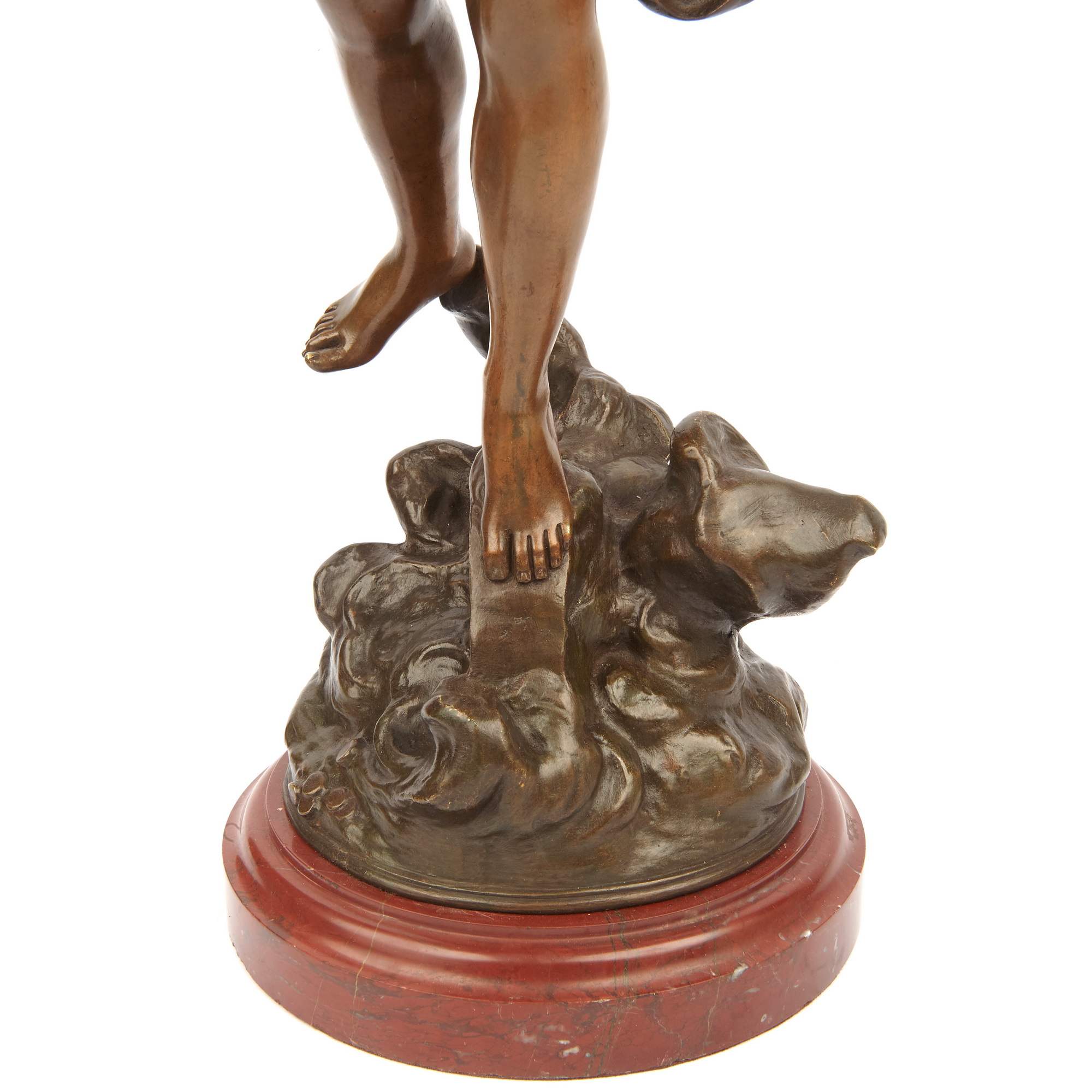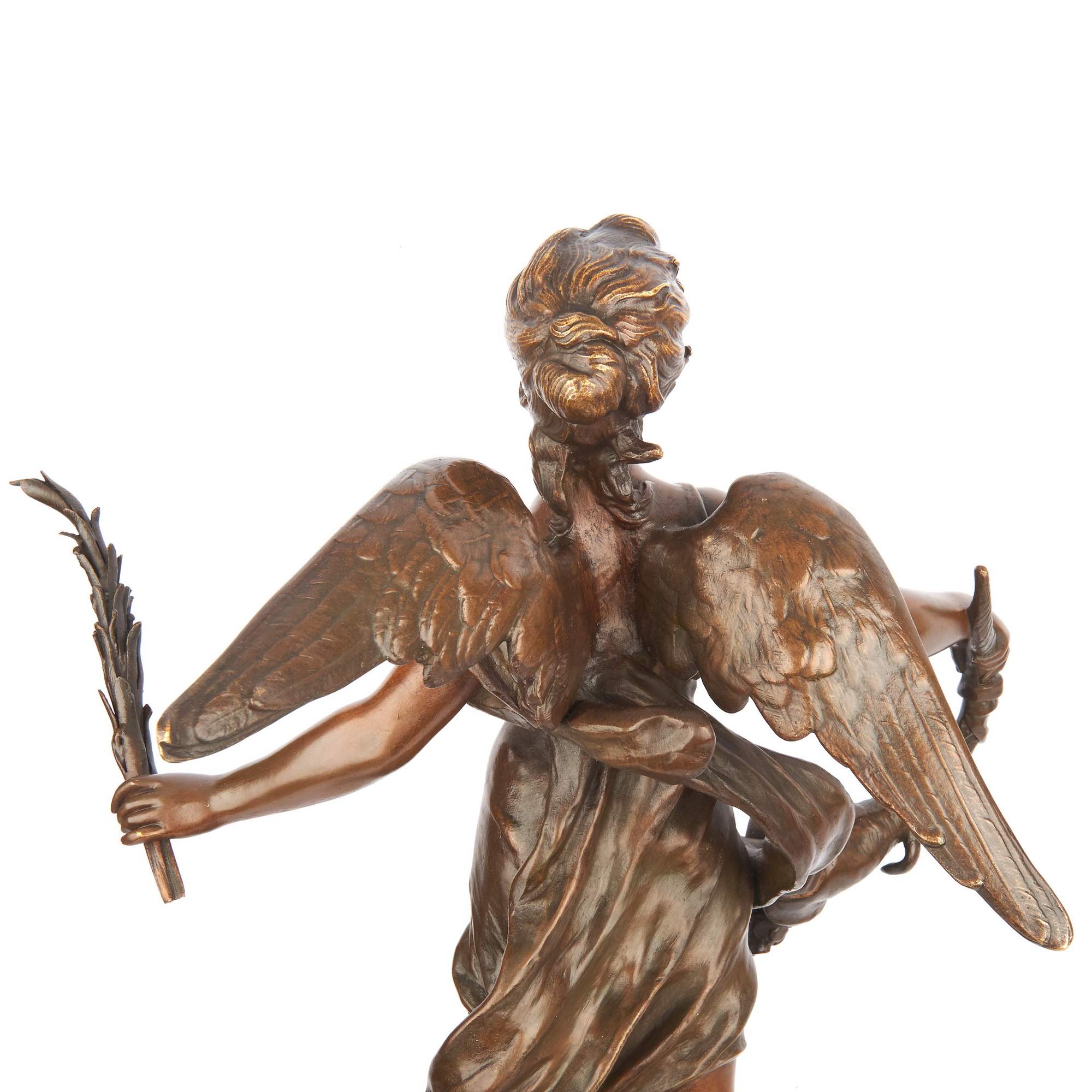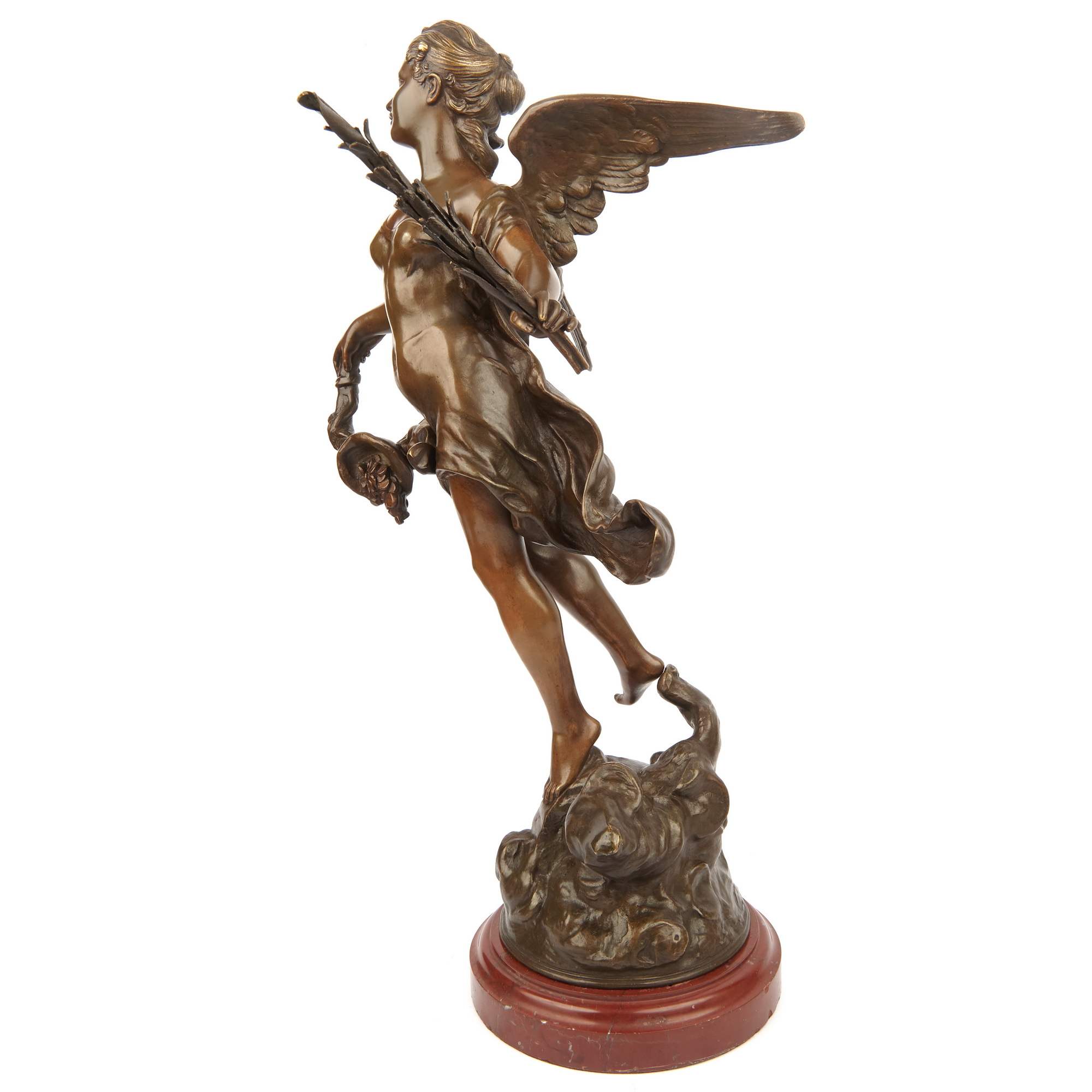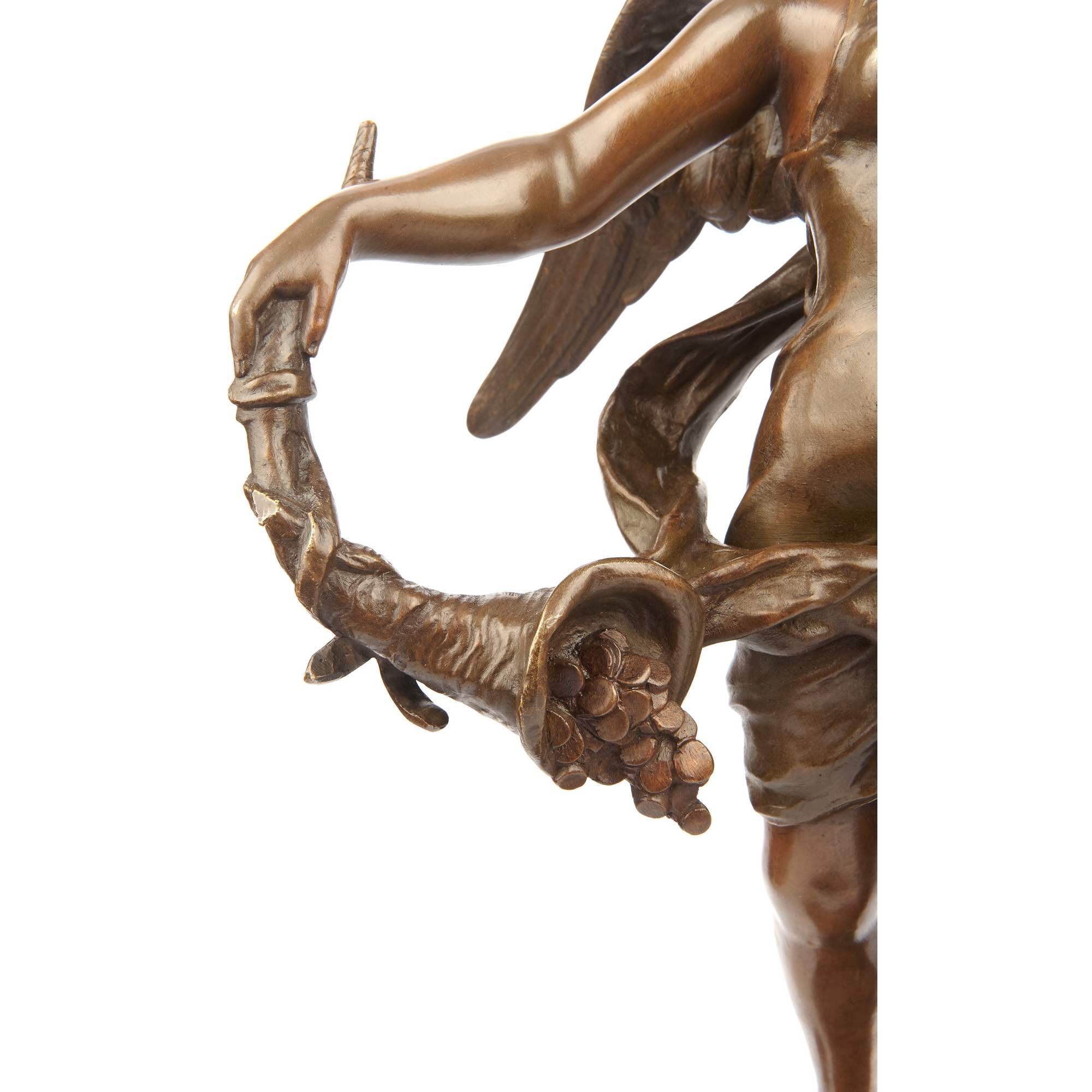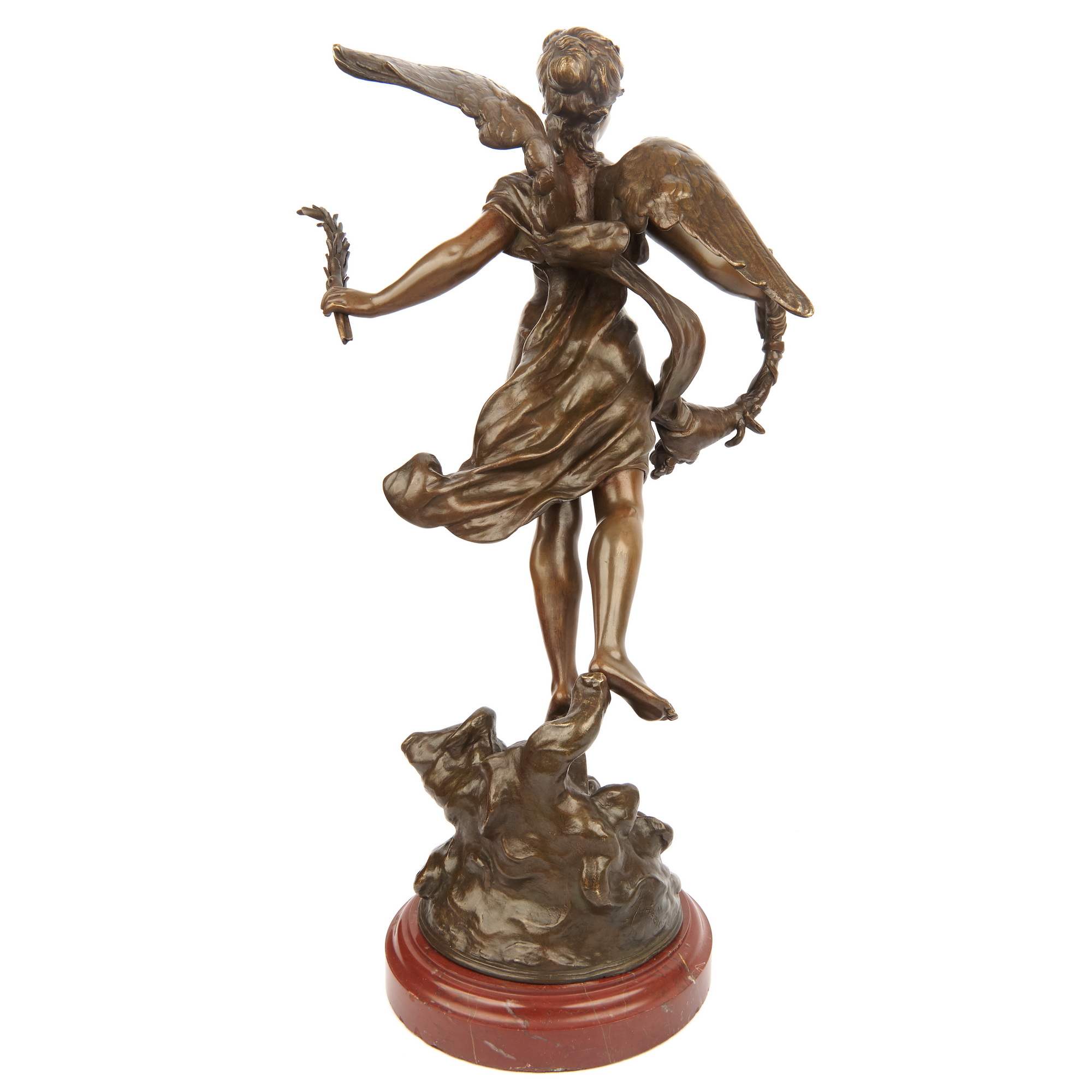 Прекрасная и изящная бронзовая скульптура на красивом постаменте дорогого красного мрамора. В образе грациозной изящной девушки показана античная богиня удачи - Фортуна. В одной руке она держит рог изобилия, из которого к «нам льются» монеты, как символ богатства и успеха, в другой - лавровую ветвь, которую, согласно традиции, вручали победителю. Фортуна была одной из наиболее почитаемых богинь античного пантеона, считалась покровительницей общественных и частных дел, корпораций, коллегий, фамилий. В искусстве ее образ часто ассоциируется именно с коммерческим успехом. Ведь Фортуна была символом удачи и благополучия, а успех коммерческого предприятия во многом зависит от удачных сделок. Еще один ее знаковый атрибут - рог изобилия с монетами - символизирует финансовый и материальный достаток. Интересно, что своей изящной ножкой богиня стоит на колесе вращая его - это также важный символ, известный нам как «Колесо Фортуны». Он является напоминанием о том, что судьба переменчива, а успех требует благоразумия и осторожности. Скульптору удалось создать чарующий и выразительный образ, который кажется легким и воздушным, как и приходящая незаметно удача. Исполнена «Фортуна» по модели одного из представителей знаменитой династии французских скульпторов Моро. Обширное творческое наследие этой известной фамилии охватывает почти целое столетие французской скульптуры. Их произведения можно встретить в крупнейших музейных собраниях и частных коллекциях по всему миру. Такие работы особенно высоко ценятся в тех случаях, когда есть подтвержденная авторская подпись. Антиквариат. Отличная сохранность. Следы бытования.
