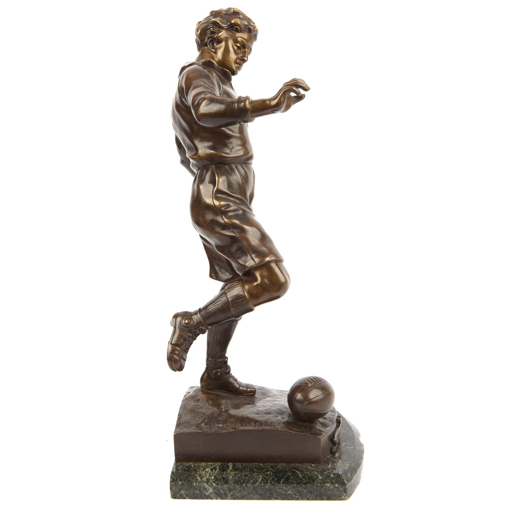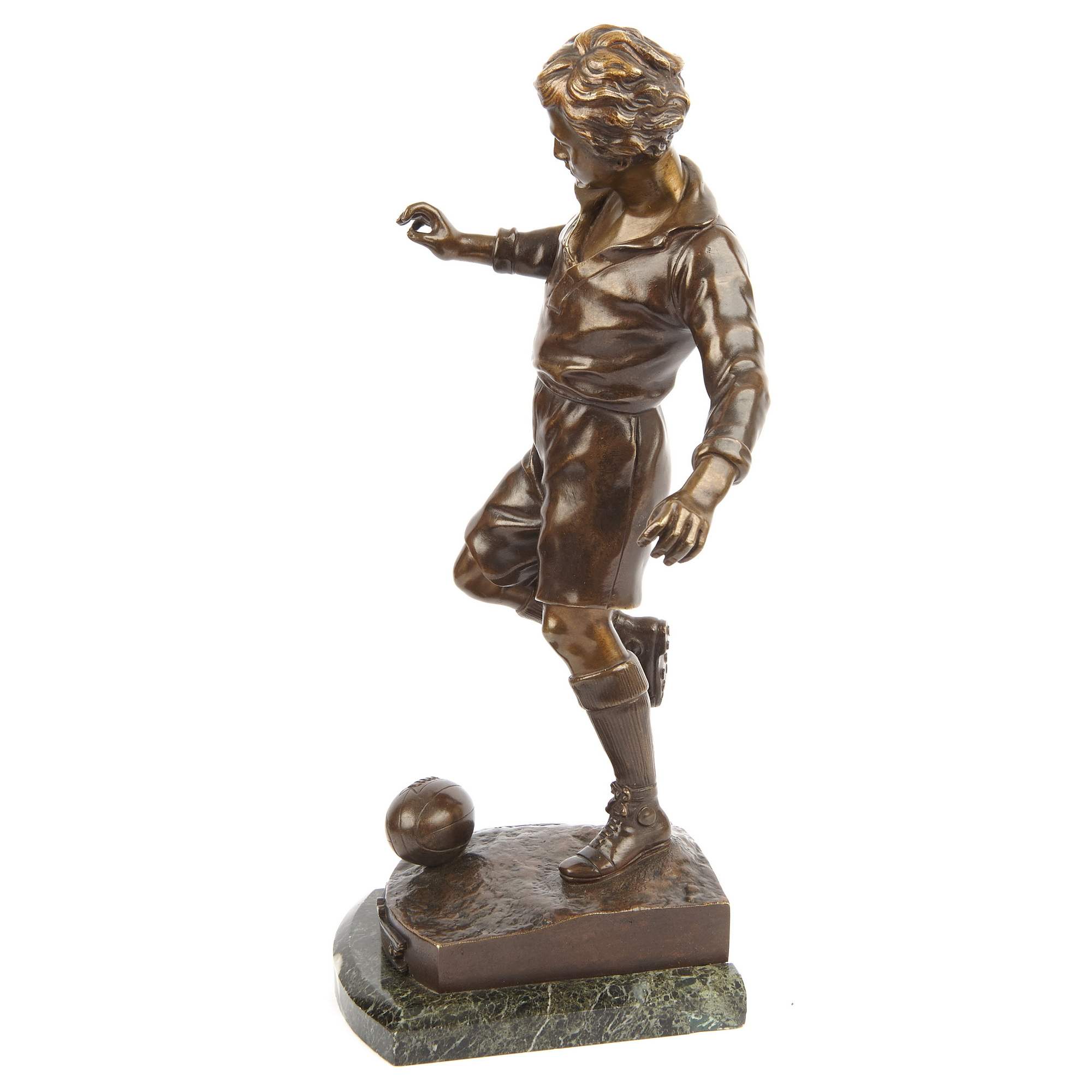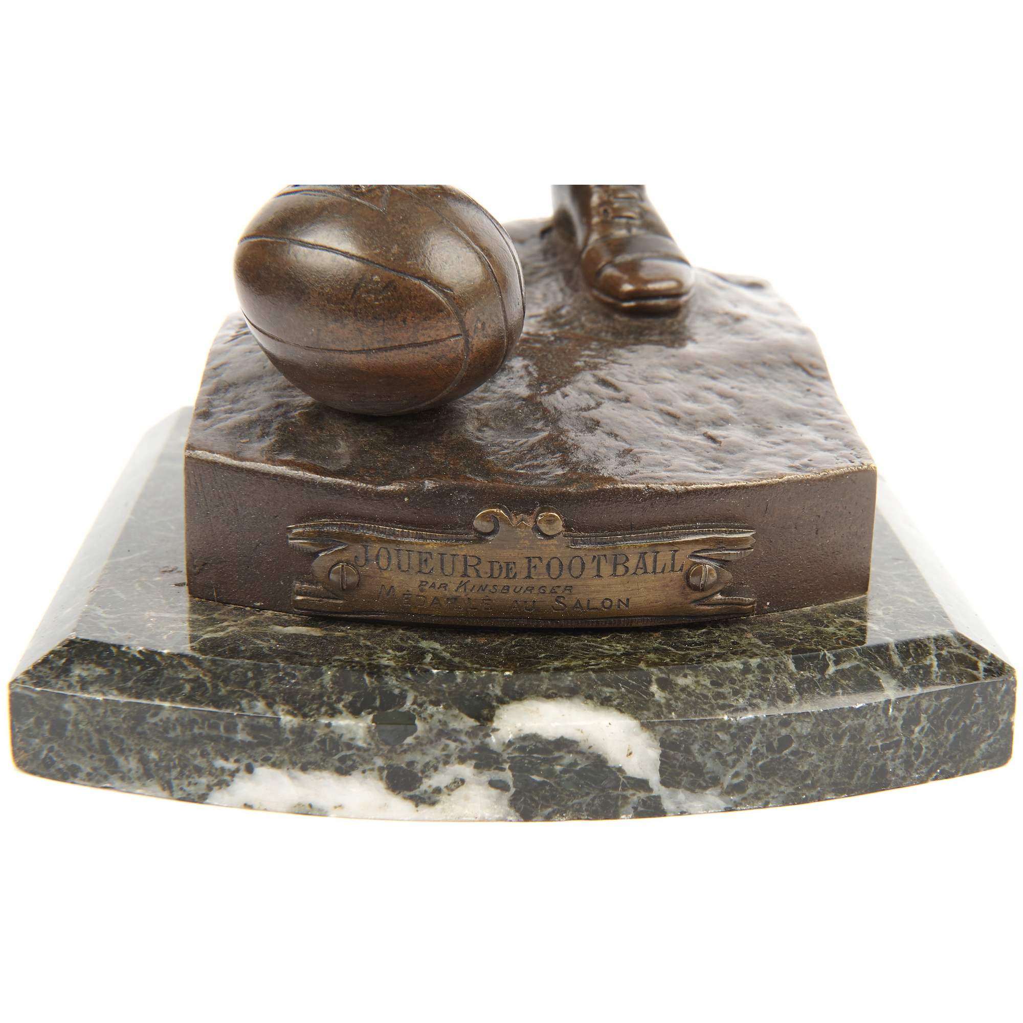 Превосходная старинная бронзовая скульптура футболиста. Спортсмен изображен в острый и напряженный момент - вот-вот последует стремительный и мощный удар. При помощи мастерской моделировки фигуры отчетливо передана экспрессия. Автор модели грамотно показывает уверенность игрока в победе, его стремительность и упорство, готовность преодолеть любые препятствия и преграды. Удачно выбранный лаконичный художественный язык позволяет создать образ, полный скрытой динамики и силы. Стоит отметить также превосходное качество литья, выполненного в лучших традициях французского бронзолитейного искусства. В скульптуре тщательная прочеканка поверхности сочетается с плотным патинированием, добавляющим фигуре выразительности. Исполнена скульптура по модели известного и талантливого французского скульптора Сильвиана Кинсвургера. Он получил блестящее образование в знаменитой Школе Изящных искусств Парижа, где учился под руководством Александра Дюмона - одного из известнейших скульпторов Франции XIX века. Кинсвургер выставлялся на Парижском Салоне, и даже участвовал на Всемирных выставках 1889 и 1900 годов, где был удостоен медалей. Модель, по которой была отлита данная скульптура футболиста, была создана Кинсвургером в 1912 году, представлена на выставке Общества французских художников, где удостоилась престижной медали, о чем свидетельствует надпись на шильде.