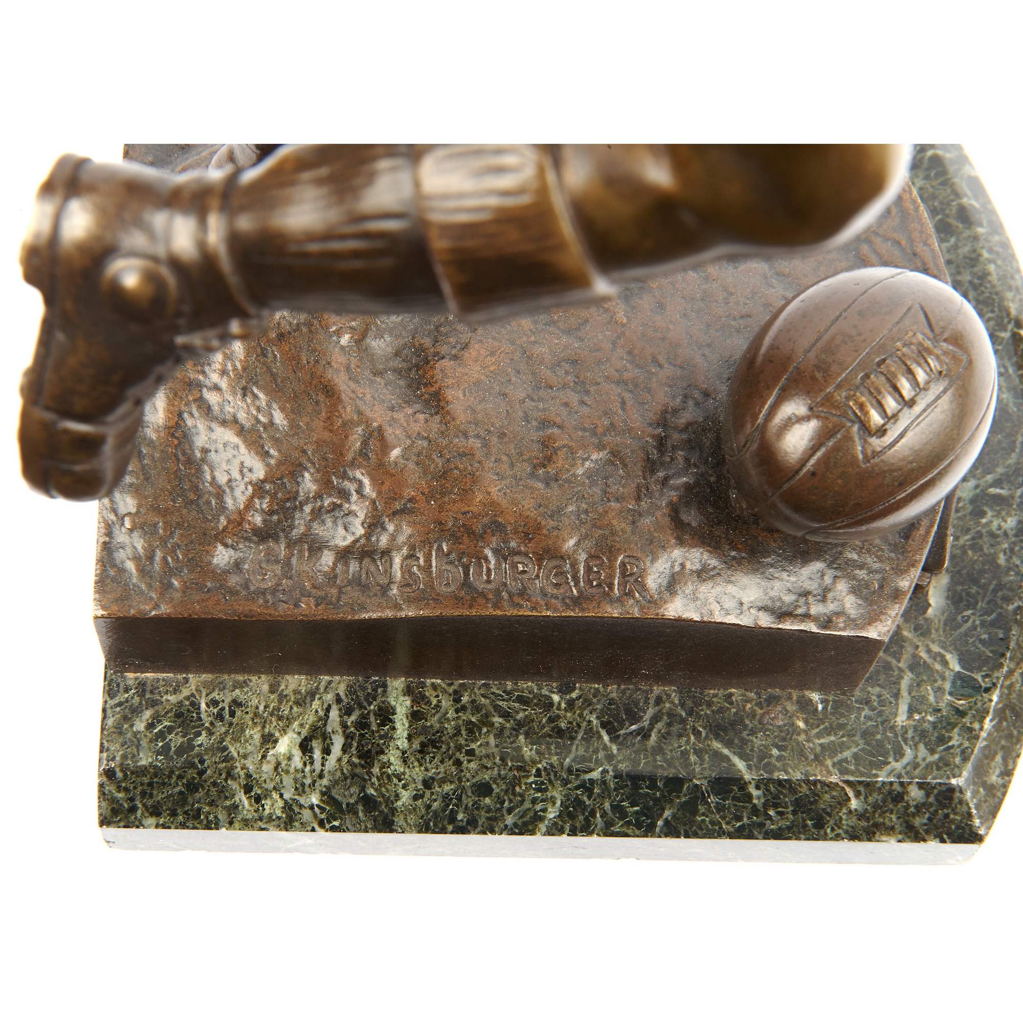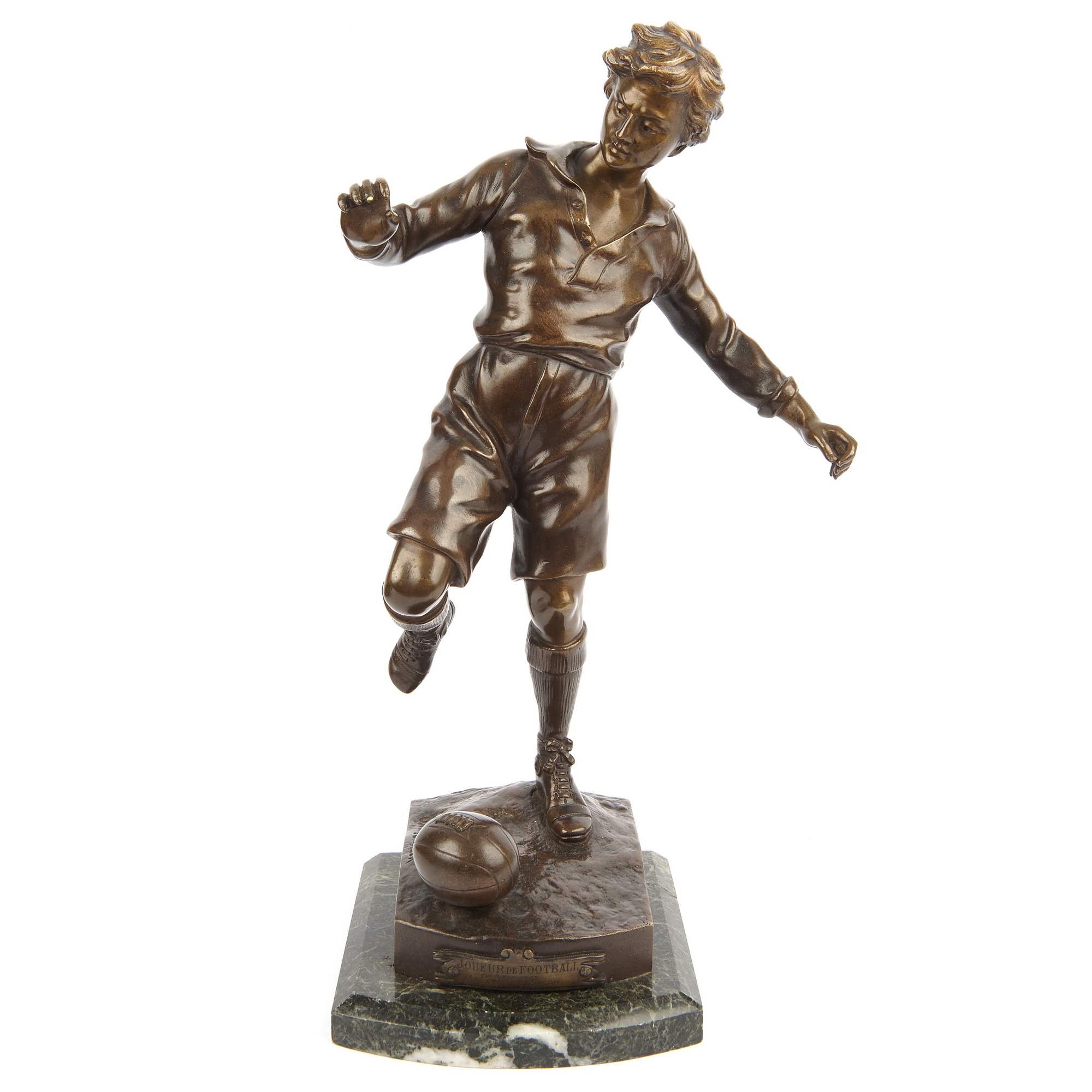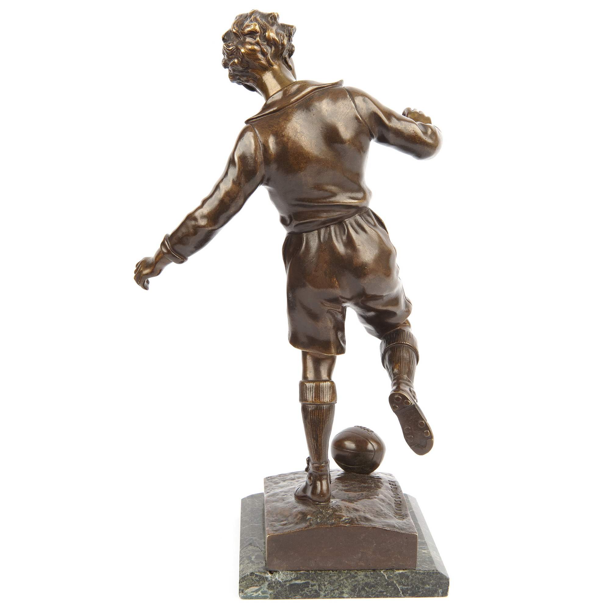 Превосходная старинная бронзовая скульптура футболиста. Спортсмен изображен в острый и напряженный момент - вот-вот последует стремительный и мощный удар. При помощи мастерской моделировки фигуры отчетливо передана экспрессия. Автор модели грамотно показывает уверенность игрока в победе, его стремительность и упорство, готовность преодолеть любые препятствия и преграды. Удачно выбранный лаконичный художественный язык позволяет создать образ, полный скрытой динамики и силы. Стоит отметить также превосходное качество литья, выполненного в лучших традициях французского бронзолитейного искусства. В скульптуре тщательная прочеканка поверхности сочетается с плотным патинированием, добавляющим фигуре выразительности. Исполнена скульптура по модели известного и талантливого французского скульптора Сильвиана Кинсвургера. Он получил блестящее образование в знаменитой Школе Изящных искусств Парижа, где учился под руководством Александра Дюмона - одного из известнейших скульпторов Франции XIX века. Кинсвургер выставлялся на Парижском Салоне, и даже участвовал на Всемирных выставках 1889 и 1900 годов, где был удостоен медалей. Модель, по которой была отлита данная скульптура футболиста, была создана Кинсвургером в 1912 году, представлена на выставке Общества французских художников, где удостоилась престижной медали, о чем свидетельствует надпись на шильде.