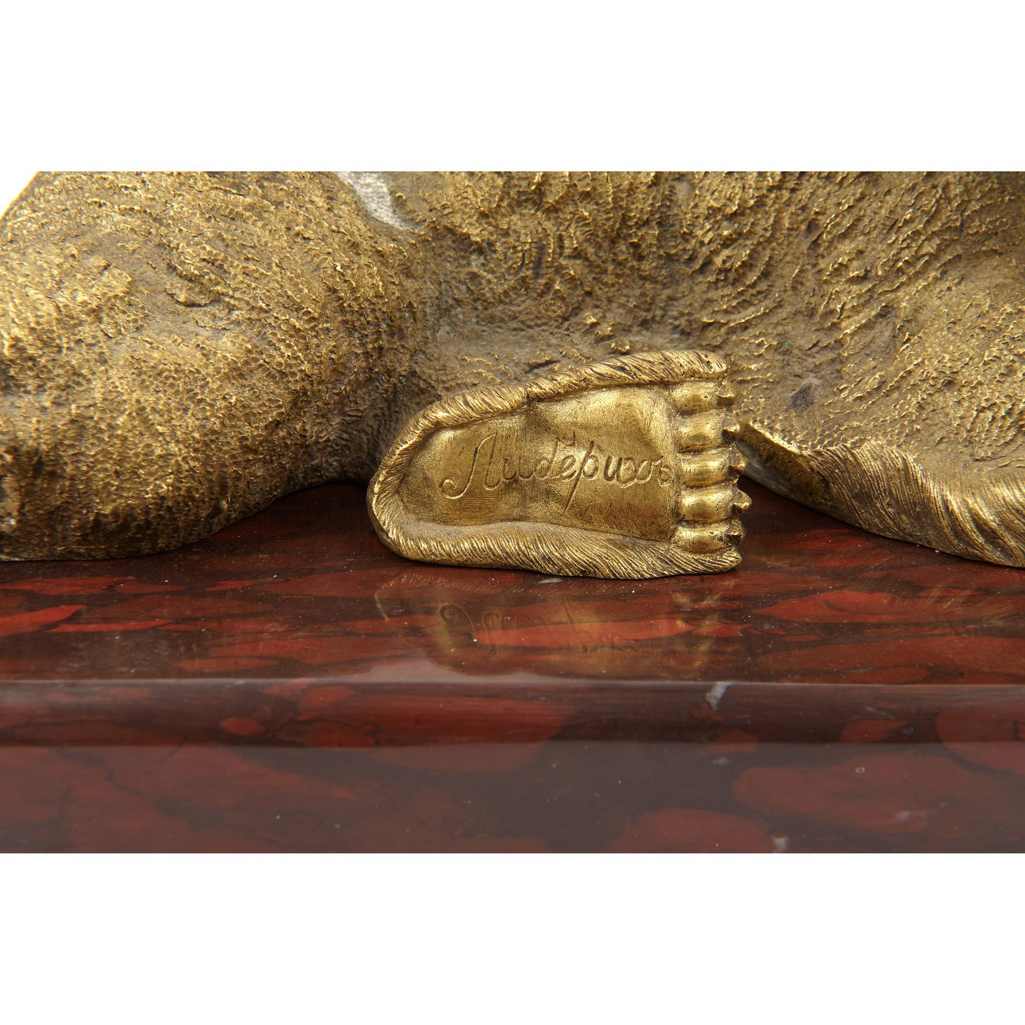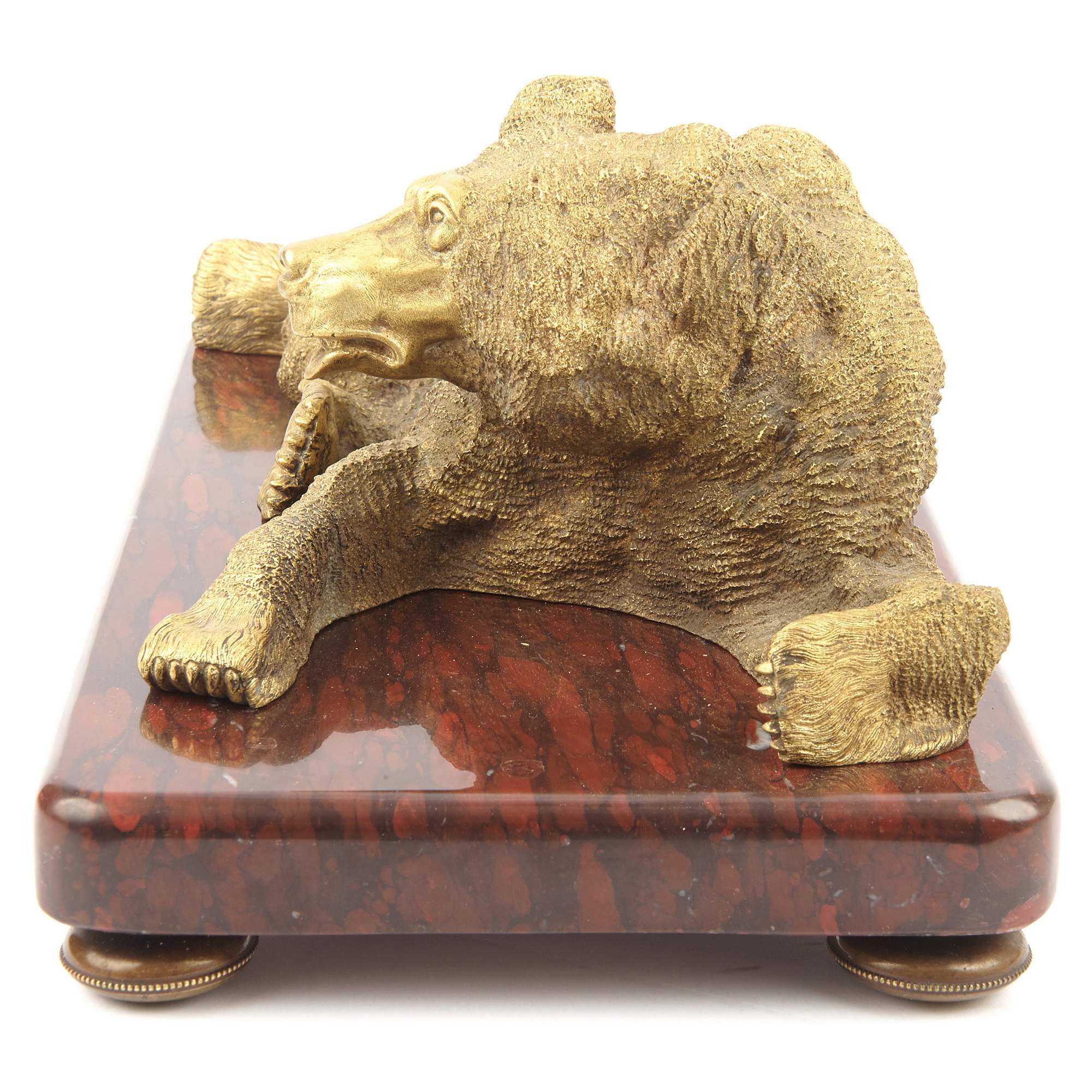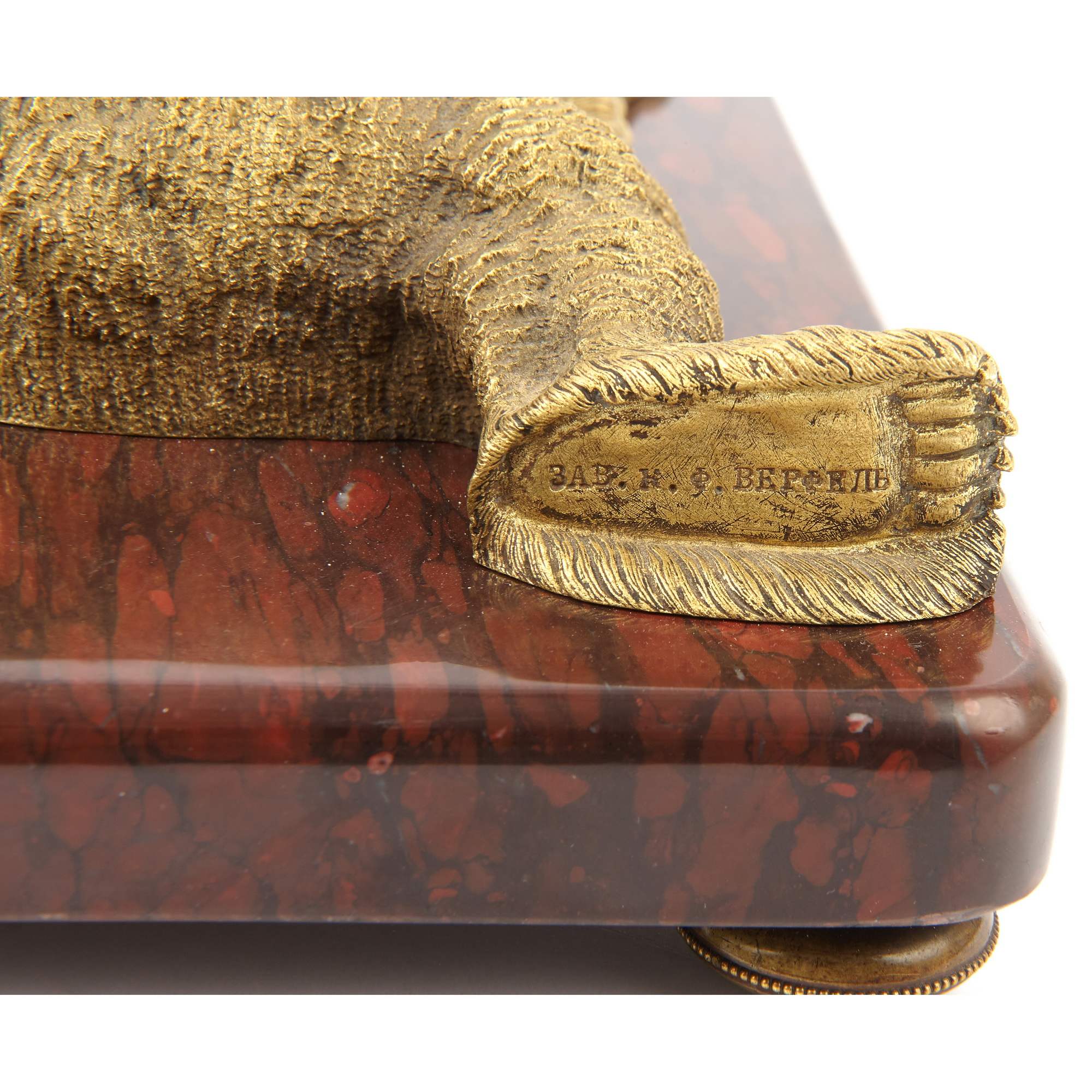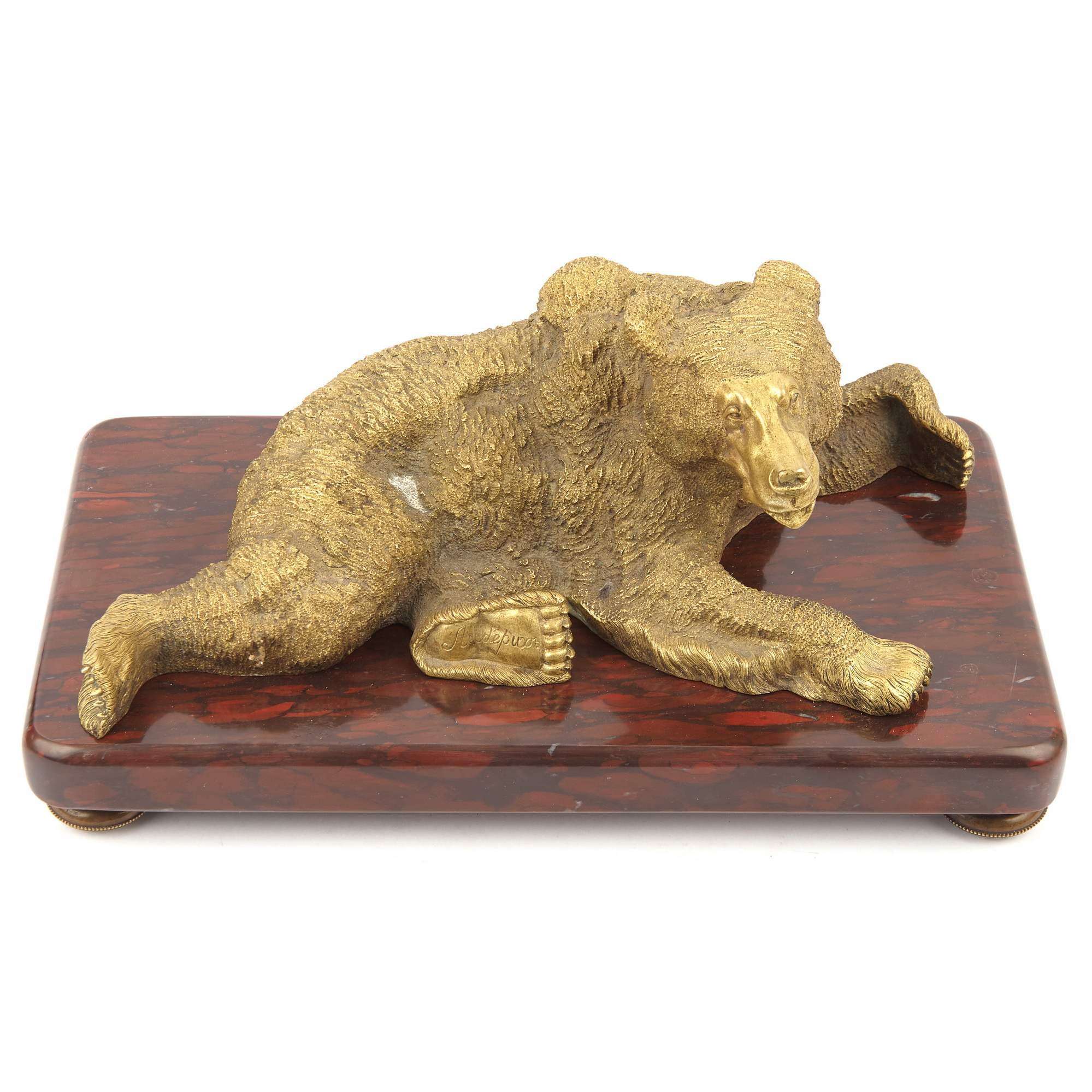 Великолепная скульптурная композиция с изображением лежащей медведицы. Облик могучего животного воспроизведен с натуралистической точностью. Реалистическая его трактовка достигнута особенно тщательной проработкой бронзовой поверхности и виртуозной прочеканкой, максимально правдоподобно передающей внешний вид зверя. Впечатляет искусное изображение в благородном металле как густой шерсти, так и мощных мышц. Золоченая бронзовая фигура гармонично контрастирует с хорошо сохранившимся красным мраморным постаментом. Выполнена скульптура по модели известнейшего русского скульптора-анималиста Николая Ивановича Либериха.