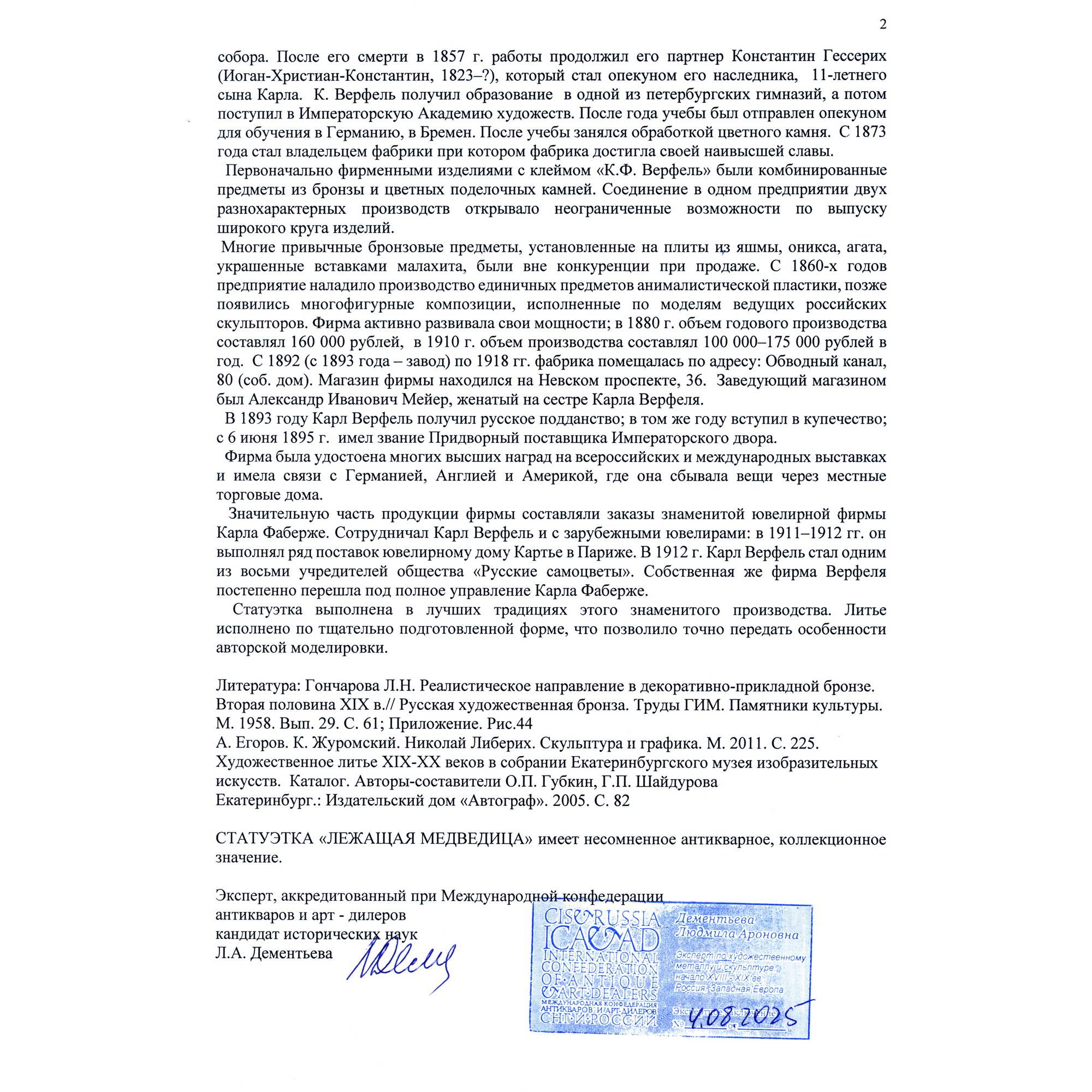 Экспертное заключение: заведующая отделом металла ГИМ хранитель коллекции бронзы, эксперт по культурным ценностям Росохранкультуры, кандидат исторических наук Л. А. Дементьева.