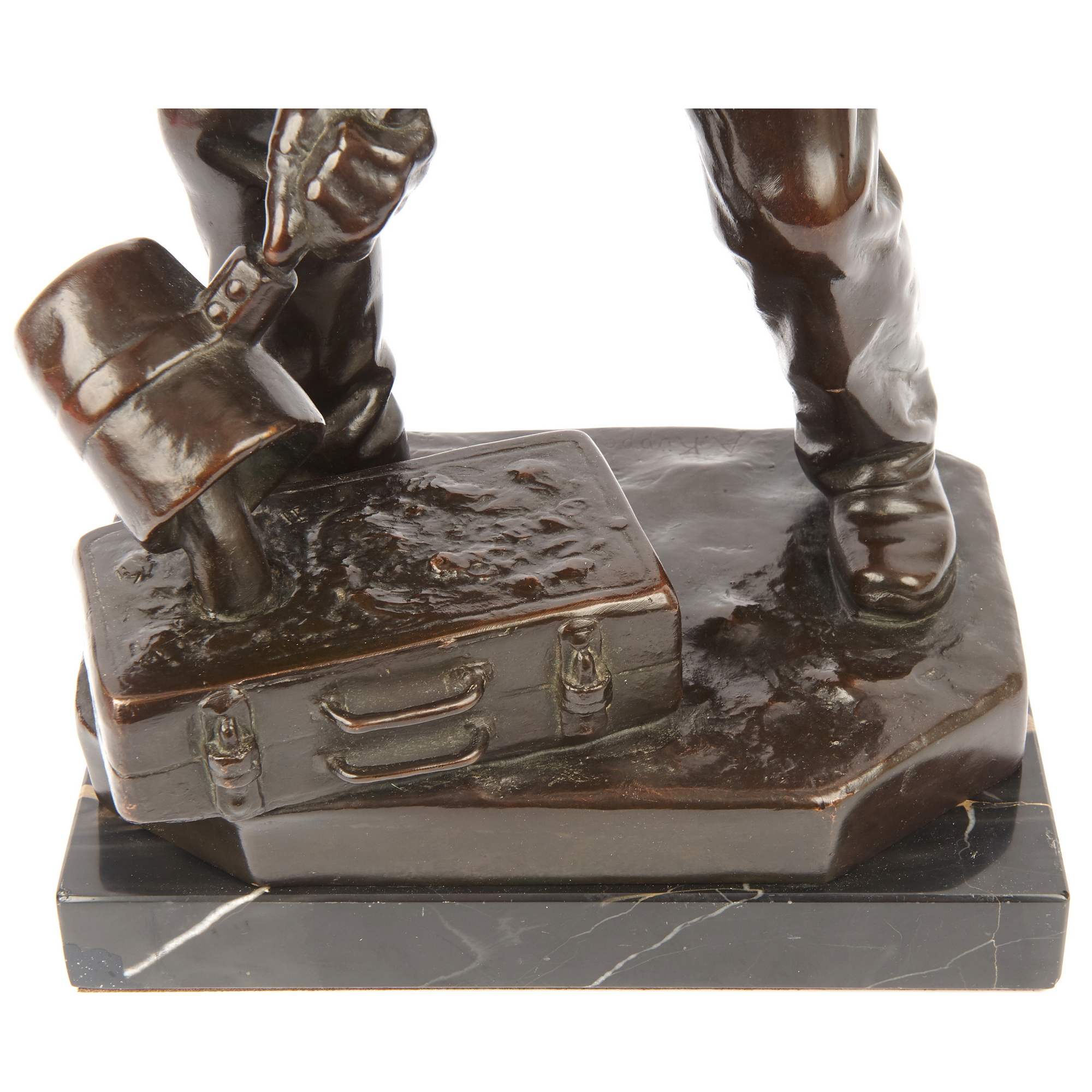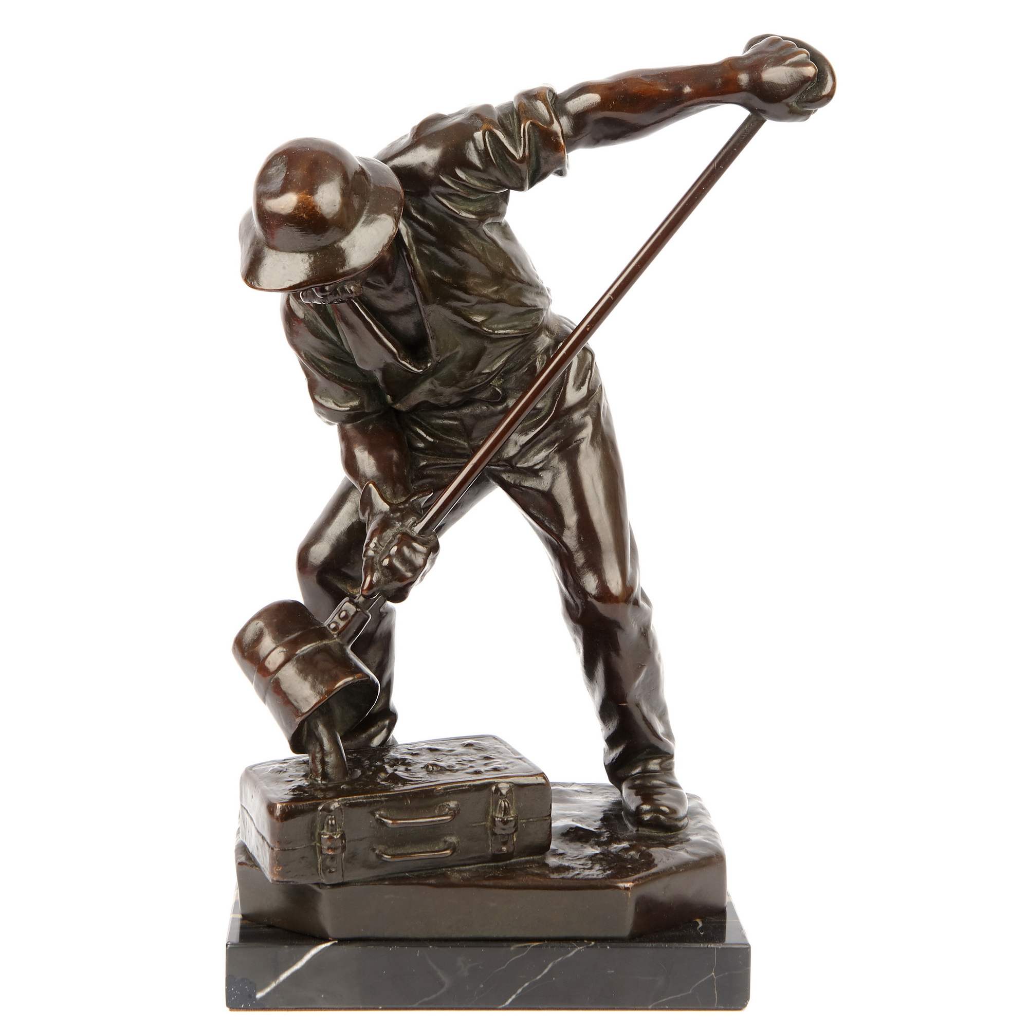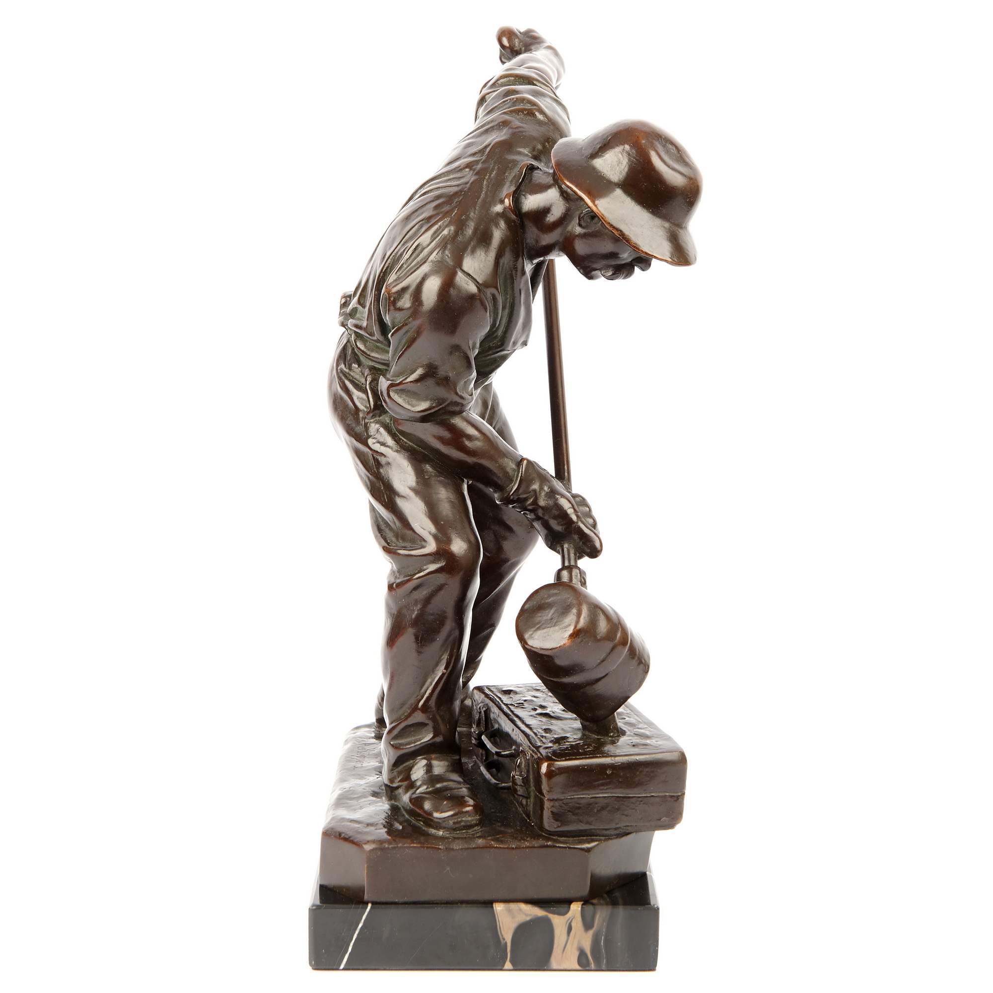Великолепная, основательная старинная скульптура литейщика на красивом мраморном постаменте. Подчеркнутая мускулатура напряженных рук, удерживающих тяжелый ковш, грамотно построенное положение фигуры и точность моделировки - все это сочетается в представленной композиции. Особой выразительности ей придает эффектное темное патинирование. В благородном металле запечатлена одна из самых ответственных операций в металлургическом процессе - заливка жидкого металла в "форму". Образ рабочего-литейщика был востребован с середины XIX века, отражая эстетику периода бурного развития промышленности. Такие скульптуры не только украшали пространства производств и фабрик, интерьеры промышленников, служили тематическим подарком, но и в целом служили прославлению человека труда, созидателя. Исполнена представленная фигура из высококачественной бронзы по модели известного немецкого скульптора Альберта Германа Кюпперса. Он получил блестящее образование, обучался и в знаменитой Берлинской Академии художеств, где его работы удостаивались престижных наград. В 1869 году Кюпперс выиграл большой приз Берлинской государственной академии за работу «Воскресение Лазаря». Он получил звание профессора искусства. Модель, послужившая для отливки «Литейщика» была создана Кюпперсом в зрелые годы его творчества, пользовалась заслуженной популярностью среди крупных европейских промышленников и предпринимателей. Стоит отметить, что высокое качество бронзового литья делает представленную скульптуру еще более редким образцом кабинетной пластики.