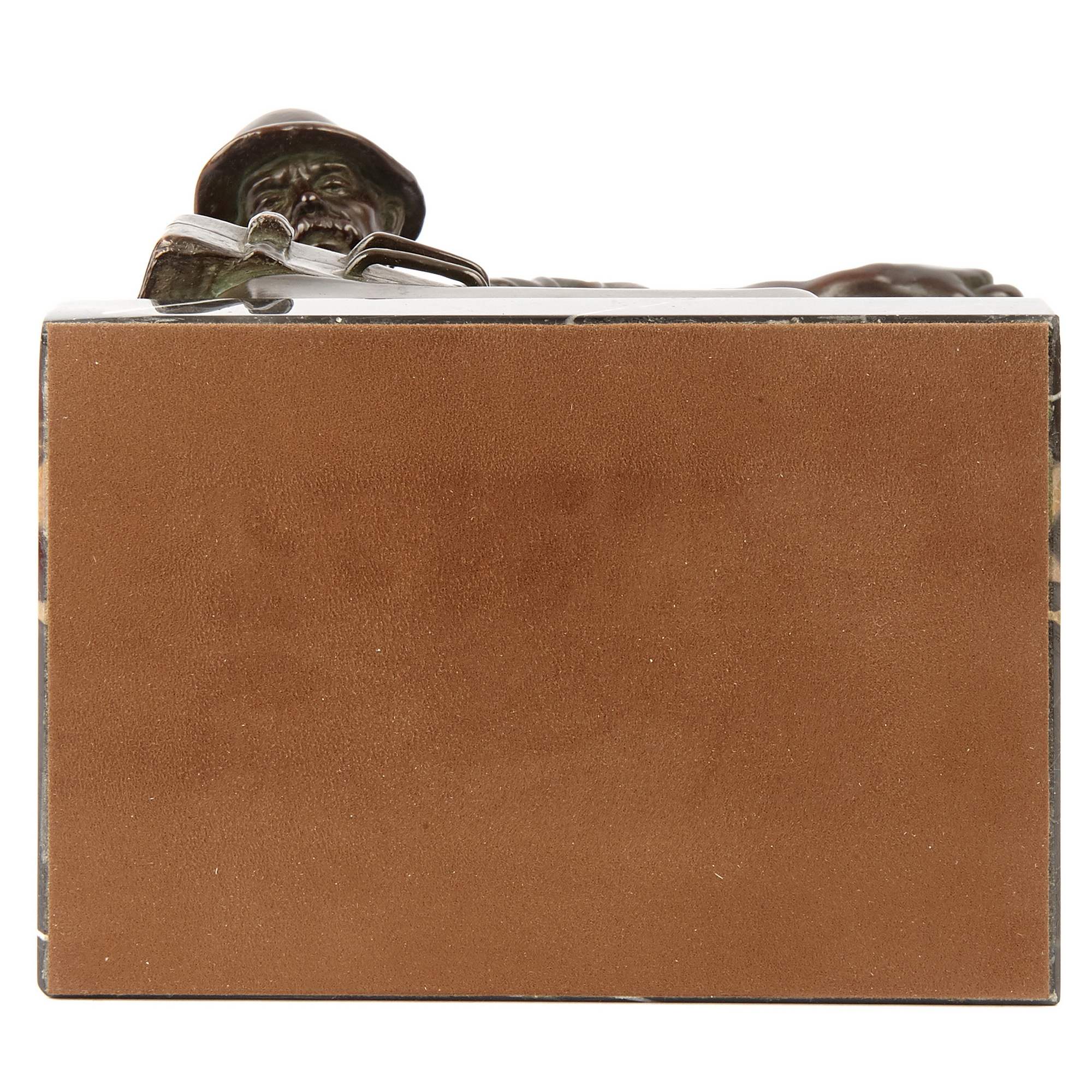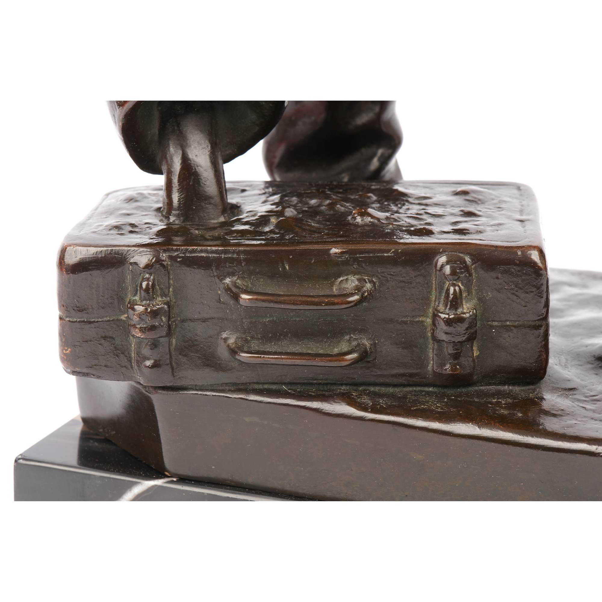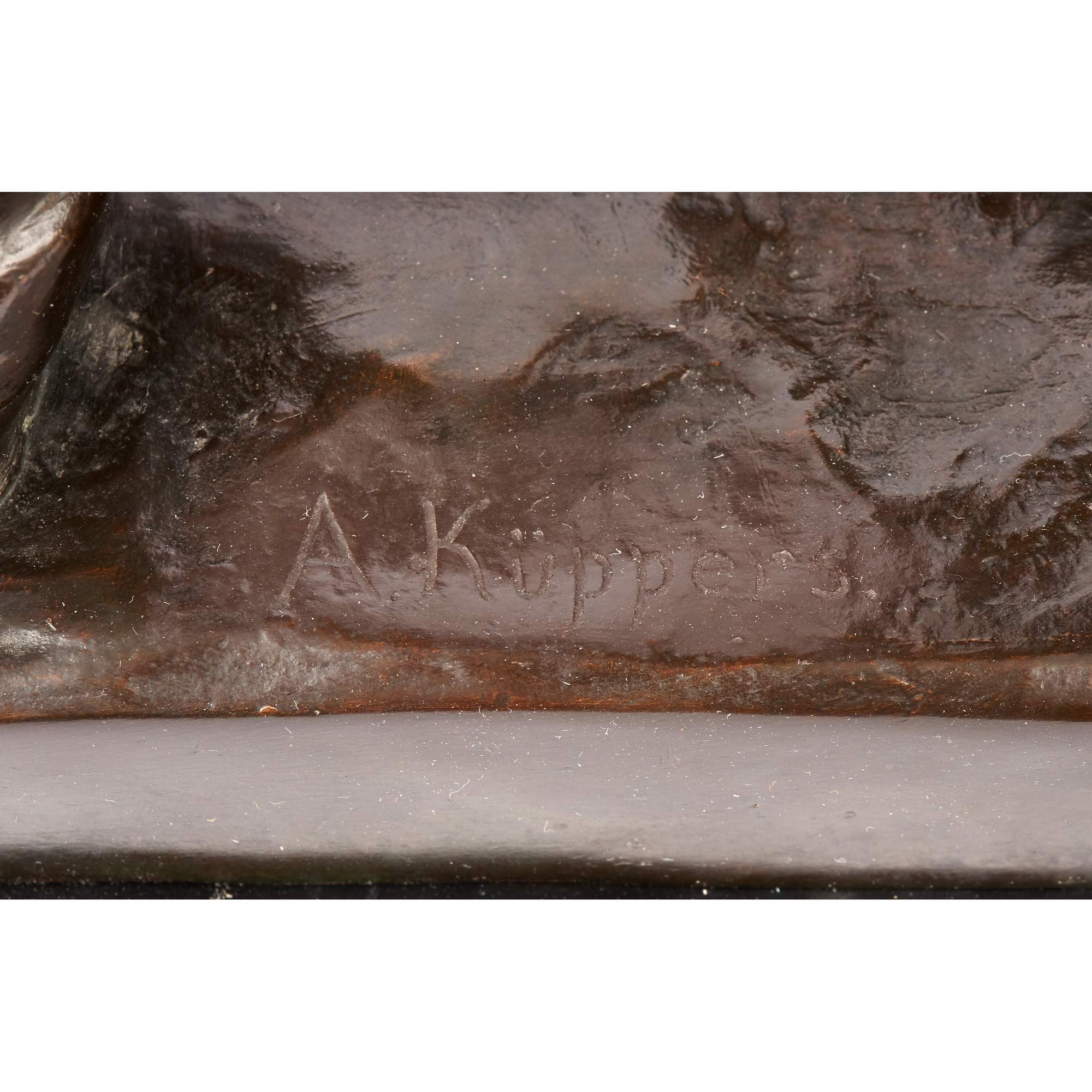 Великолепная, основательная старинная скульптура литейщика на красивом мраморном постаменте. Подчеркнутая мускулатура напряженных рук, удерживающих тяжелый ковш, грамотно построенное положение фигуры и точность моделировки - все это сочетается в представленной композиции. Особой выразительности ей придает эффектное темное патинирование. В благородном металле запечатлена одна из самых ответственных операций в металлургическом процессе - заливка жидкого металла в "форму". Образ рабочего-литейщика был востребован с середины XIX века, отражая эстетику периода бурного развития промышленности. Такие скульптуры не только украшали пространства производств и фабрик, интерьеры промышленников, служили тематическим подарком, но и в целом служили прославлению человека труда, созидателя. Исполнена представленная фигура из высококачественной бронзы по модели известного немецкого скульптора Альберта Германа Кюпперса. Он получил блестящее образование, обучался и в знаменитой Берлинской Академии художеств, где его работы удостаивались престижных наград. В 1869 году Кюпперс выиграл большой приз Берлинской государственной академии за работу «Воскресение Лазаря». Он получил звание профессора искусства. Модель, послужившая для отливки «Литейщика» была создана Кюпперсом в зрелые годы его творчества, пользовалась заслуженной популярностью среди крупных европейских промышленников и предпринимателей. Стоит отметить, что высокое качество бронзового литья делает представленную скульптуру еще более редким образцом кабинетной пластики.