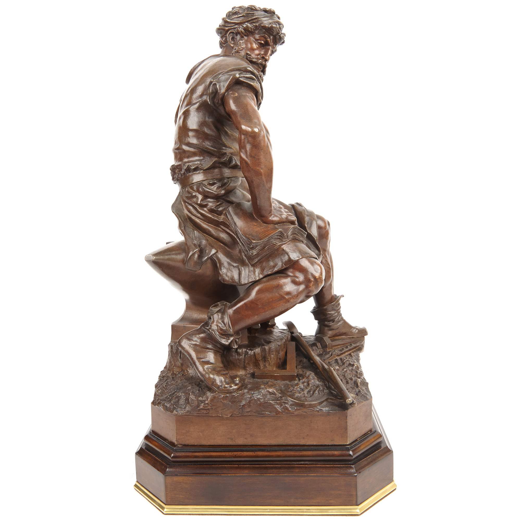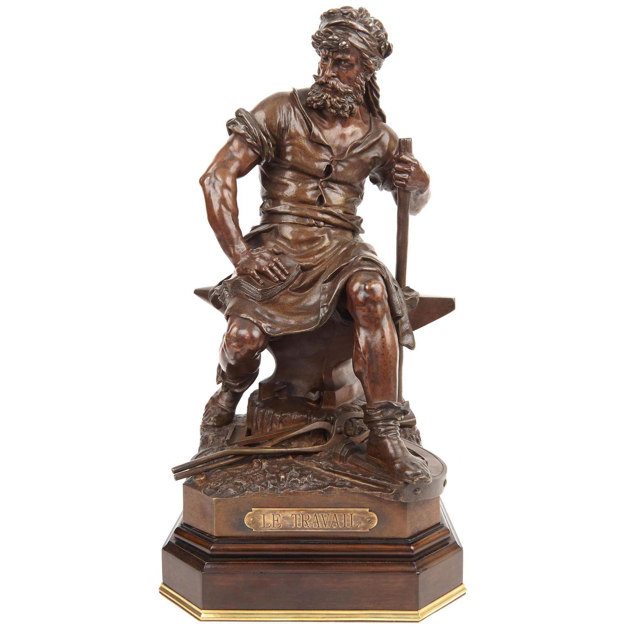 Красивейшая старинная скульптура «аллегория труда» изображен могучий мужчина в рабочей одежде со множеством символических деталей: и книга - как символ знаний, наковальня - как символ созидания и множество иных инструментов - как символ труда. Прекрасное литье и патина, замечательная компоновка скульптуры с деревянным основанием.