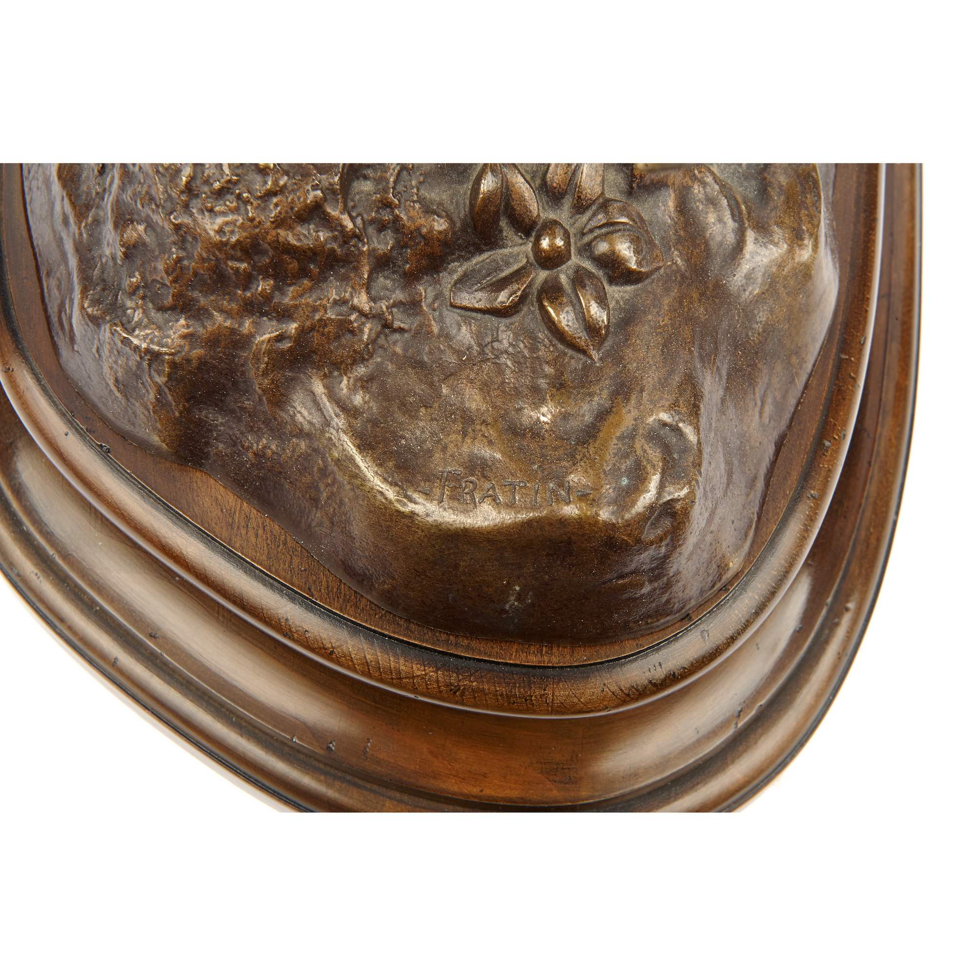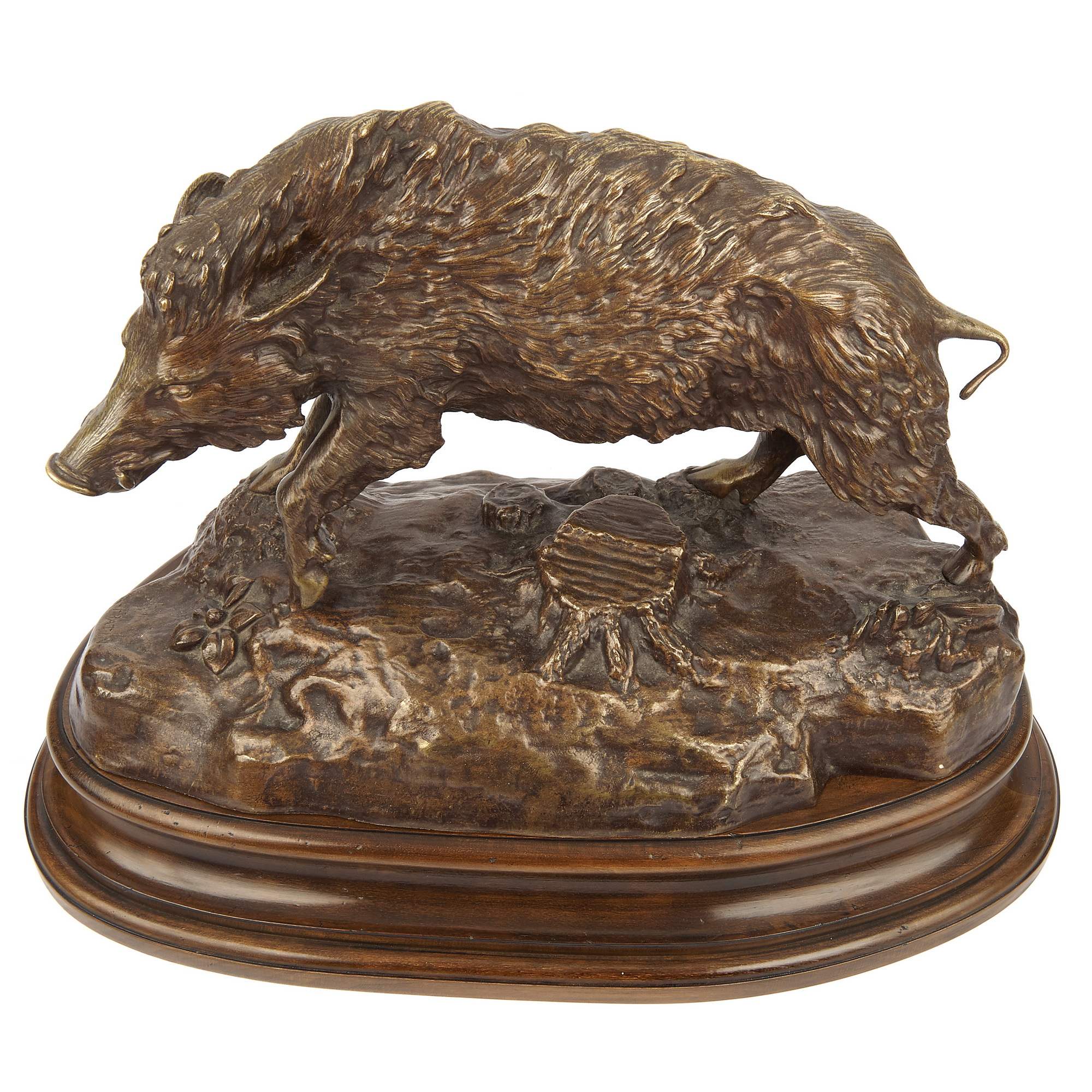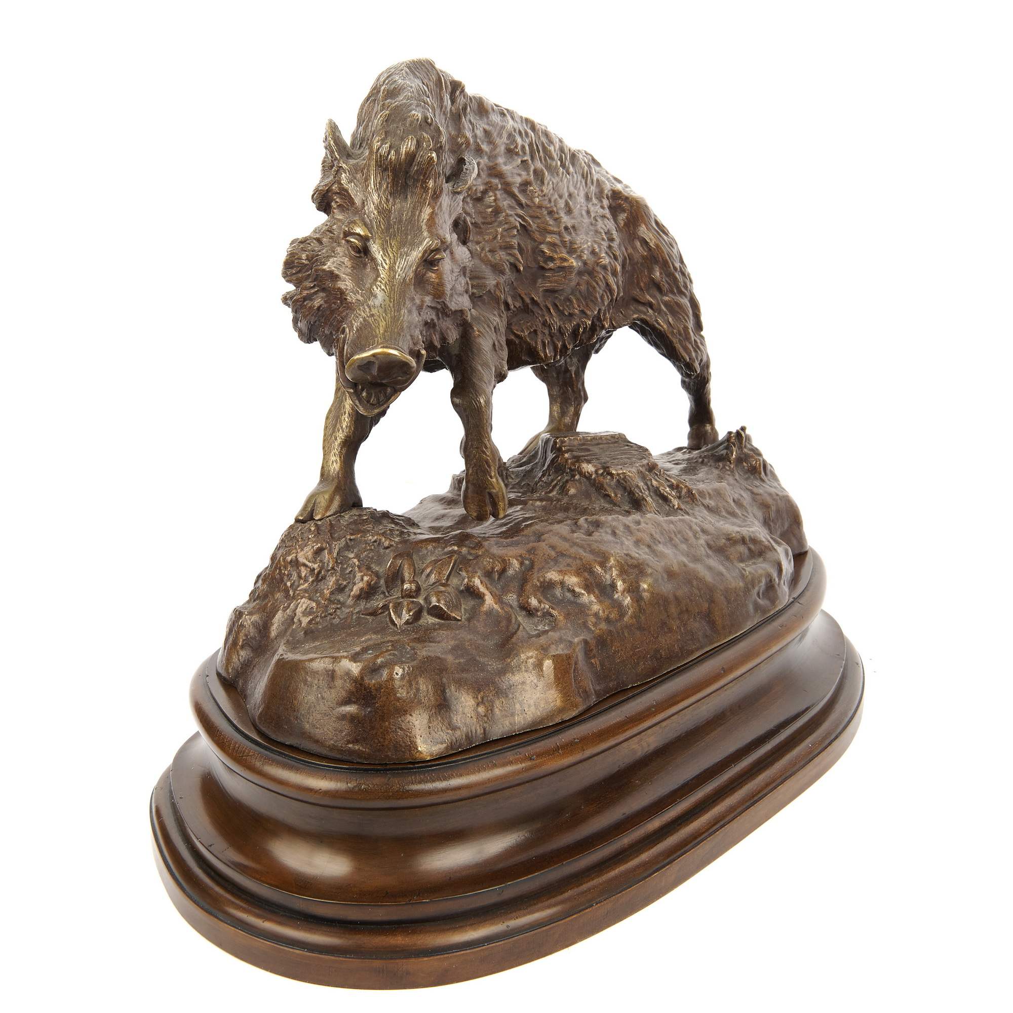 Замечательная старинная скульптура исполненная по модели одного из самых известных и заслуженных французских скульпторов-анималистов Кристофа Фратена. Мастер с детства увлекался анатомией животных, лепил фигурки и рисовал. Профессиональное образование получил в Париже в мастерских скульптора Жана Баптиса Пиоша и великого живописца романтизма Теодора Жерико. На протяжении жизни Фратена окружали талантливые и известные мастера, так на первом своем Парижском Салоне он выставлялся с Антуаном Луи Бари и Александром Жуйонне. Вместе они представили анималистические скульптуры. Особенное внимание зрителей и критиков привлекли блестяще исполненные английские породистые жеребцы Фратена, вдохновившегося картинами своего учителя Теодора Жерико. Скульптор являлся непременным экспонентом Парижского Салона, а мировую известность ему принесло участие на Всемирной выставке в Лондоне 1851 года. Уникальность представленной скульптуры состоит в том, что дикий зверь изображен не в момент напряженной охоты, не в составе скульптурной композиции, а обособленно, что встречается крайне редко. Скульптор виртуозно воссоздает в бронзе вепря, запечатлев его мощь и красоту. Удивительное внимание к деталям, превосходная глубокая патина, моделирующая текстуру шкуры зверя и земли, великолепная работа с металлом – свидетельствуют о высоком таланте и мастерстве скульптора. Его модели пользовались спросом и популярностью в Европе и Америке. Произведения Фратена в настоящий момент украшают многие знаменитые коллекции, собрания ведущих мировых музеев, а также известные публичные места: Ботанический сад в Метце, парк Сан-Сусси в Потсдаме, площадь Монруж в Париже и многие другие. Скульптура выполнена в лучших традициях французского бронзолитейного искусства XIX века. Обладает коллекционным значением и культурной ценностью. Безупречная сохранность и качество. Антиквариат.