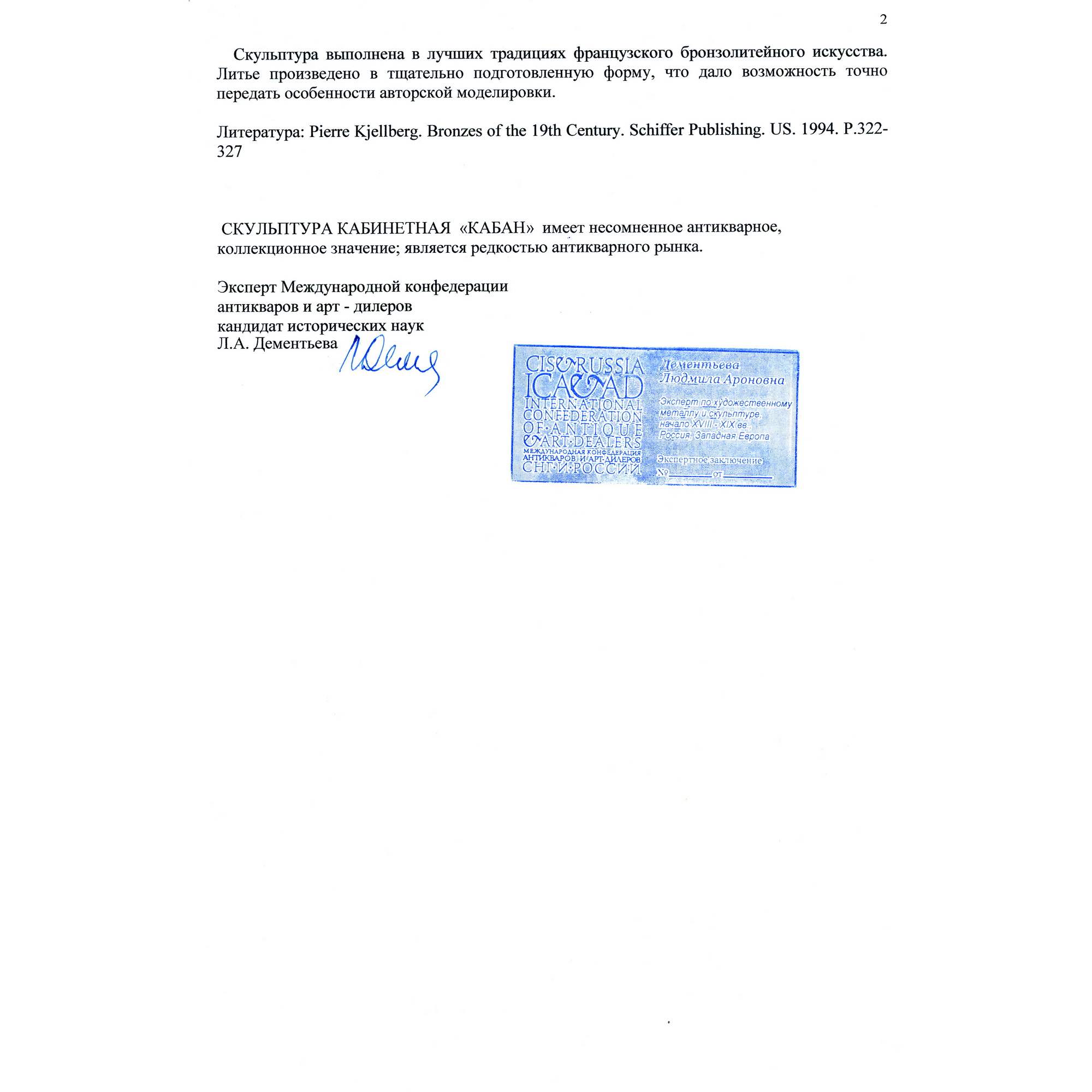 Экспертное заключение: заведующая отделом металла ГИМ, главный хранитель коллекции бронзы, эксперт по культурным ценностям Росохранкультуры, кандидат исторических наук Л.А. Дементьева.