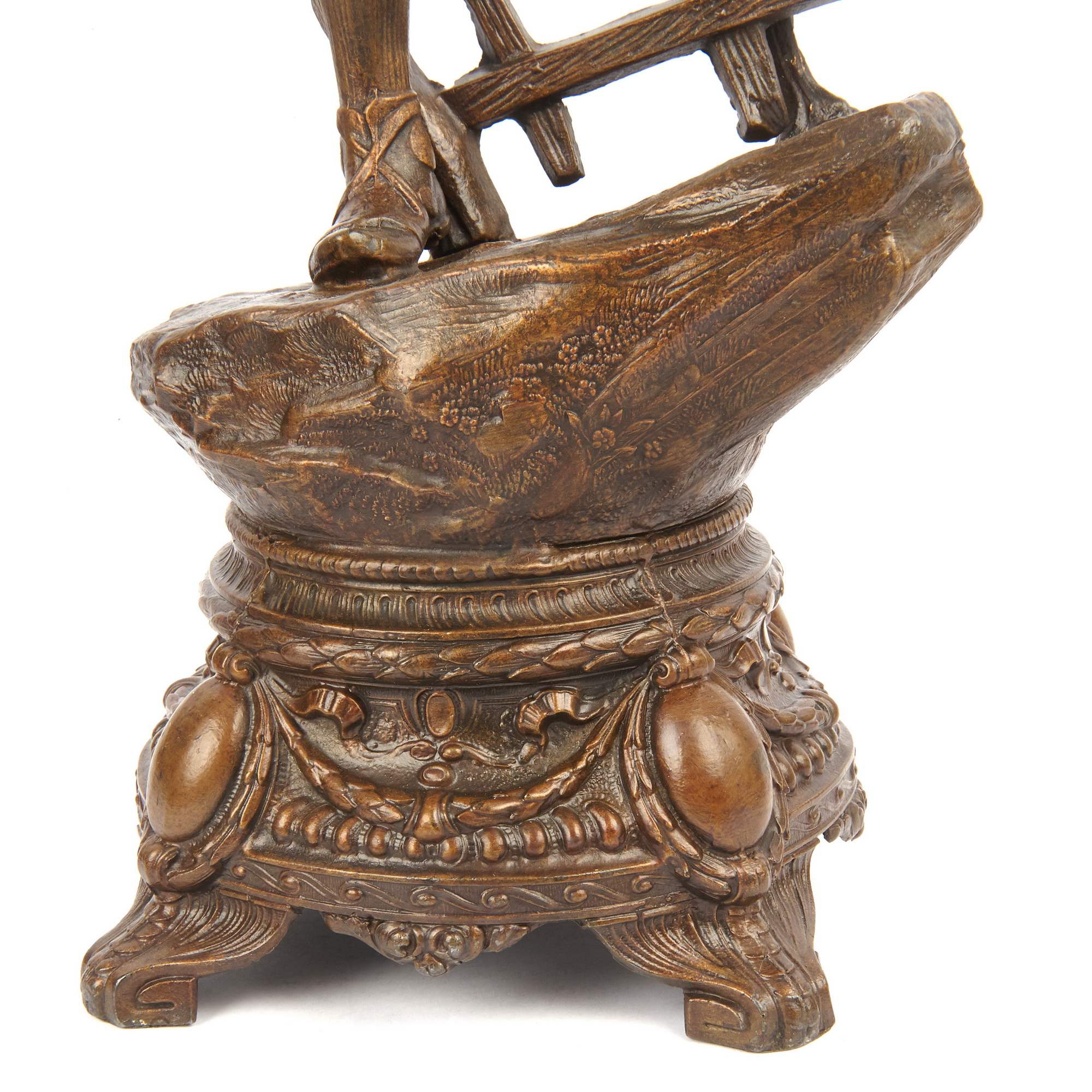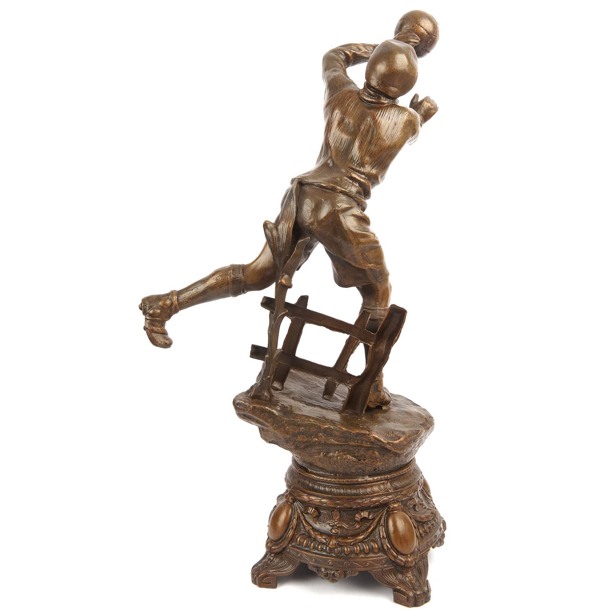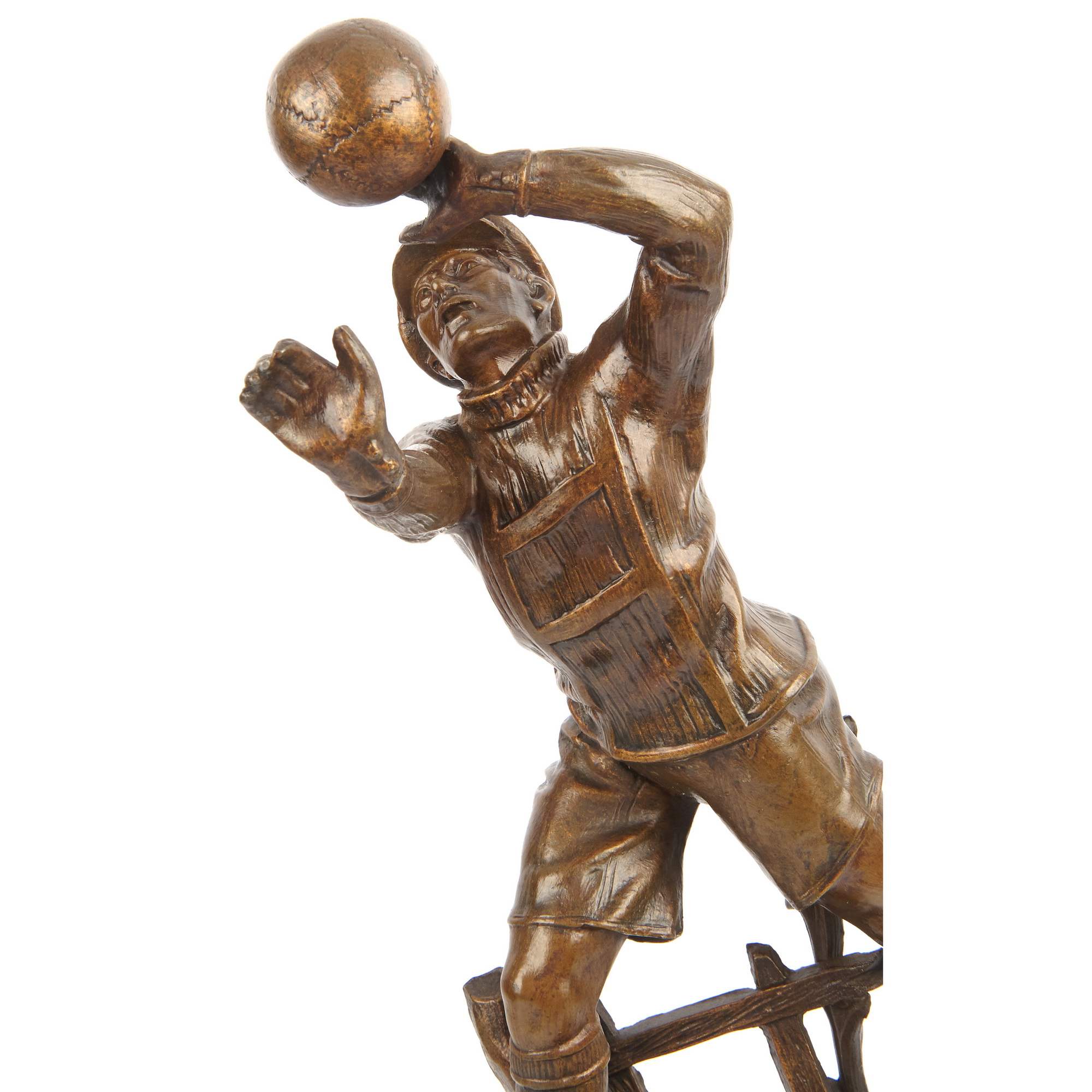 Эффектная старинная скульптура вратаря на красивом фигурном основании со стилизованной сеткой футбольных ворот. Запечатлен один из кульминационных моментов игры в футбол - решительному вратарю в стремительном прыжке удается отбить летящий мяч. Он изображен на грани баланса, словно вот-вот упадет, однако его смелость и быстрая реакция позволили защитить ворота. В бронзовой скульптуре показана самоотверженная борьба за победу своей команды, отражена экспрессия и невероятная динамика популярной игры. Сама фигура спортсмена исполнена весьма подробно. Качественная авторская моделировка и профессиональная прочеканка позволяют точно передать фактуру спортивной формы старого образца. Стоит отметить, что лицо персонажа также отличается подробнейшей проработкой, с тонкой разделкой волос и грамотно воспроизведенной мимикой. Автором модели представленной скульптуры является известный французский скульптор Эмиль Кориолан Ипполит Гиймен, ученик знаменитого Жана Жюля Салмсона, представителя академического направления французской пластики. В 1870 году он успешно дебютировал на Парижском Салоне, став регулярным участником этого престижного смотра художественных достижений Франции. В 1897 году был удостоен престижной премии. Его модели отливались на ведущих бронзолитейных предприятиях Франции, например, на знаменитой фирме Барбедьена. Отливки по его моделям находятся в крупных музеях, например, в Лувре, Музее Орсе и других крупных собраниях.