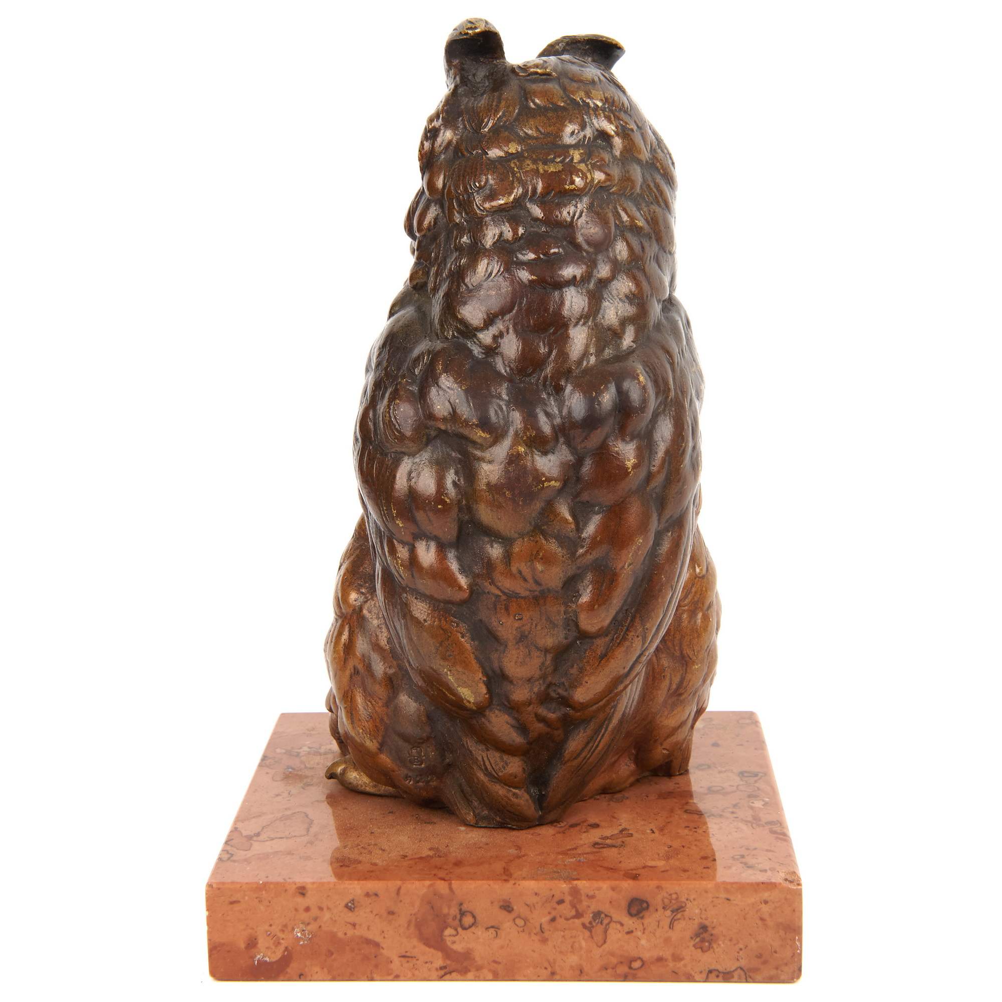Изумительная статуэтка Филина на красивом мраморном постаменте. Характер моделировки отчетливо демонстрирует доскональное знание скульптором внешнего облика изображаемой птицы. Грамотно передана фактура золотистого оперения. Глаза насыщенного желтого цвета выполнены из цветного стекла, что придает образу особую выразительность и правдоподобие. С глубокой древности филин является символом мудрости и познания. Способность этих птиц видеть в темноте издавна ассоциировалась с прозорливостью, умением заглянуть за завесу иллюзий и найти скрытые истины. Также считалось, что филин оберегает и укрепляет семейные отношения, поэтому его изображение нередко размещали в супружеской спальне.