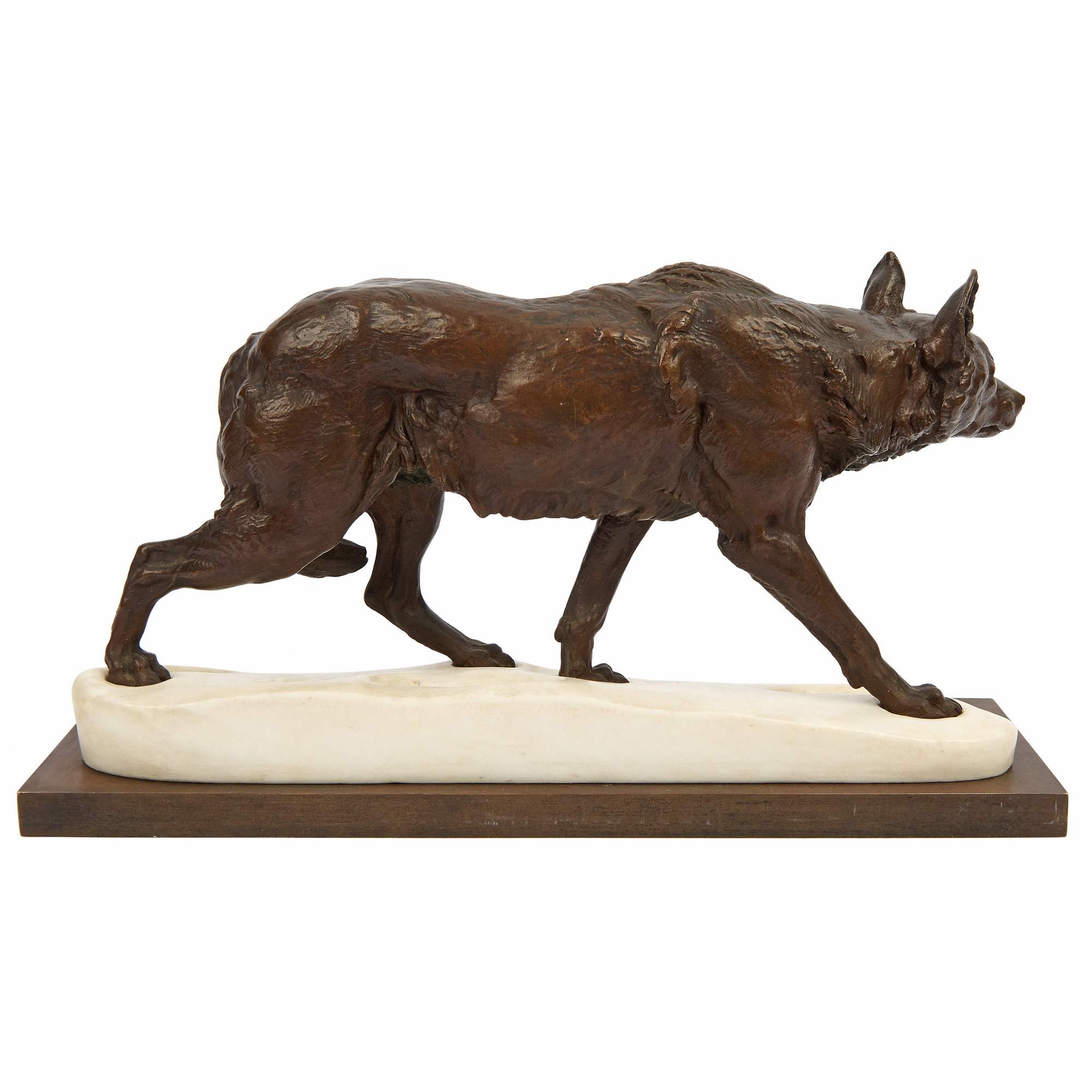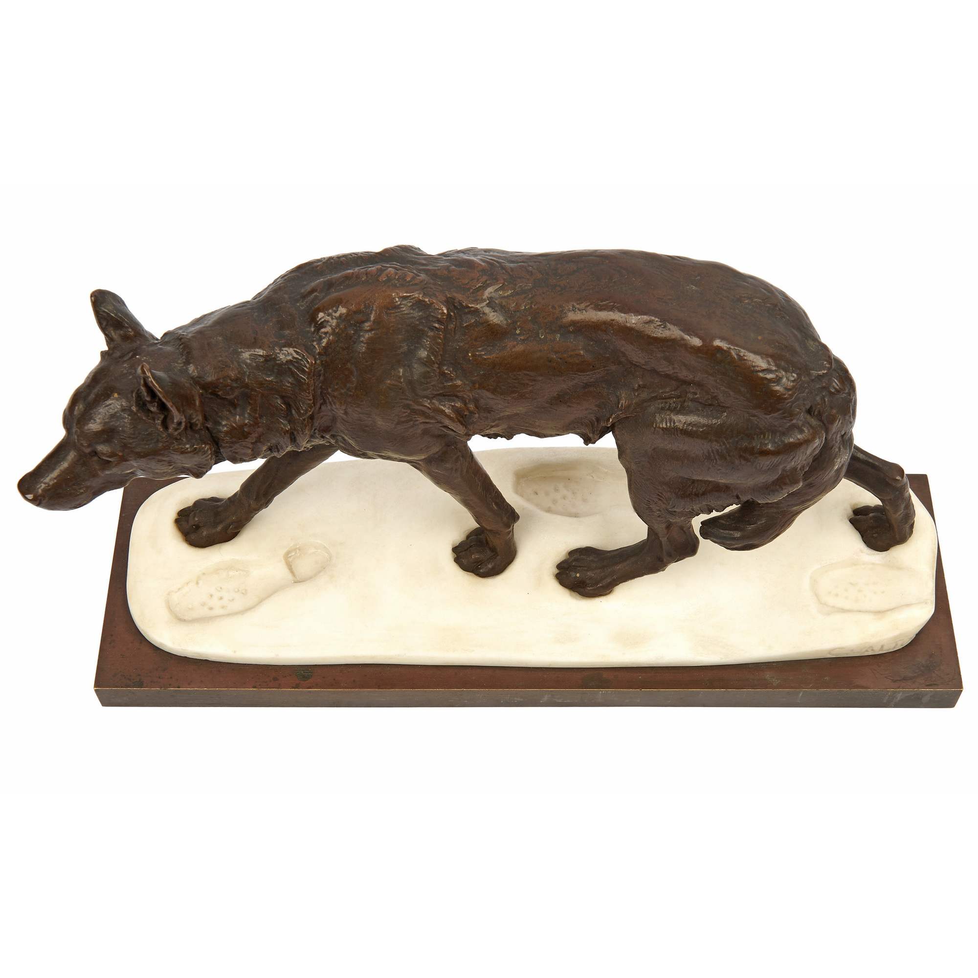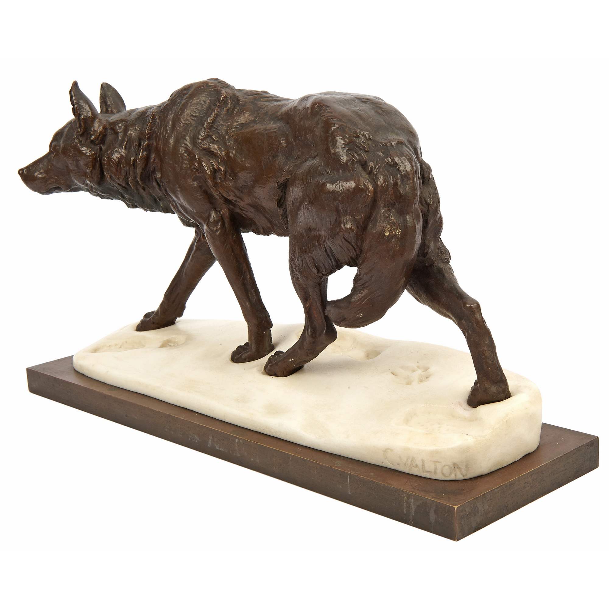 Великолепная старинная бронзовая скульптура на мраморном основании «Волк идущий по следу». Автор модели был истинным мастером композиционного решения - он оставил изображение самой охоты вне рамок композиции, предоставляя зрителю возможность представить развитие событий. Характер персонажа воспроизведен точно - волк, почуявший приближение охотника, застыл в напряженной позе умного и сильного животного. Гордый зверь готов ко встрече с человеком. Особую выразительность композиции придает контрастное и гармоничное сочетание белоснежного мраморного основания, удачно имитирующего снег, на котором видны следы и темной патинированной фигуры волка. Представленная статуэтка отлита по модели известного французского скульптора-анималиста Шарля Вальтона. Он был учеником основателей школы анималистической пластики - Антуана Луи Бари и Эммануэля Фремье. С пятнадцати лет Вальтон посещал Парижский Зоологический сад, делая многочисленные зарисовки животных и птиц, став настоящим знатоком их изображения. Многократно скульптор выставлял свои работы на Парижском Салоне, был удостоен звания профессора скульптуры, в 1906 году за выдающиеся художественные достижения награжден орденом Почетного легиона. Камерные модели Вальтона даже исполнялись в фарфоре на знаменитой Севрской мануфактуре. Модель, по которой отлита скульптура волка, пользовалась заслуженной популярностью. Скульптура имеет несомненное антикварное и коллекционное значение. Антиквариат. Хорошая сохранность.