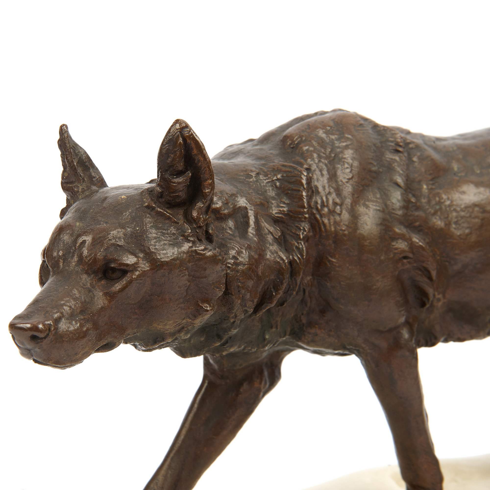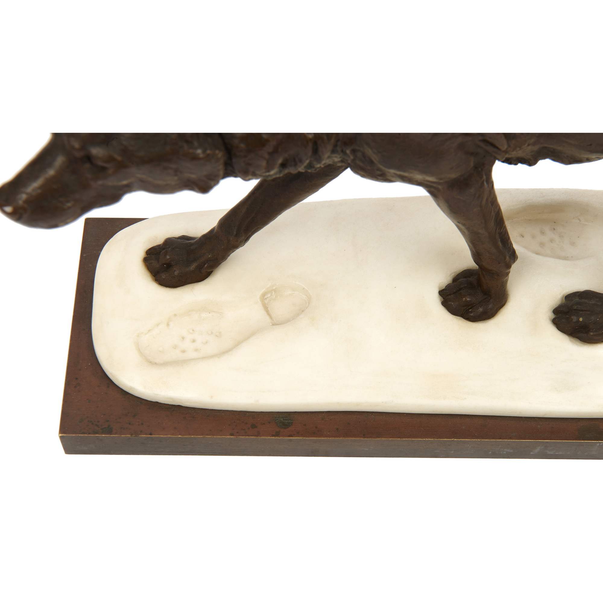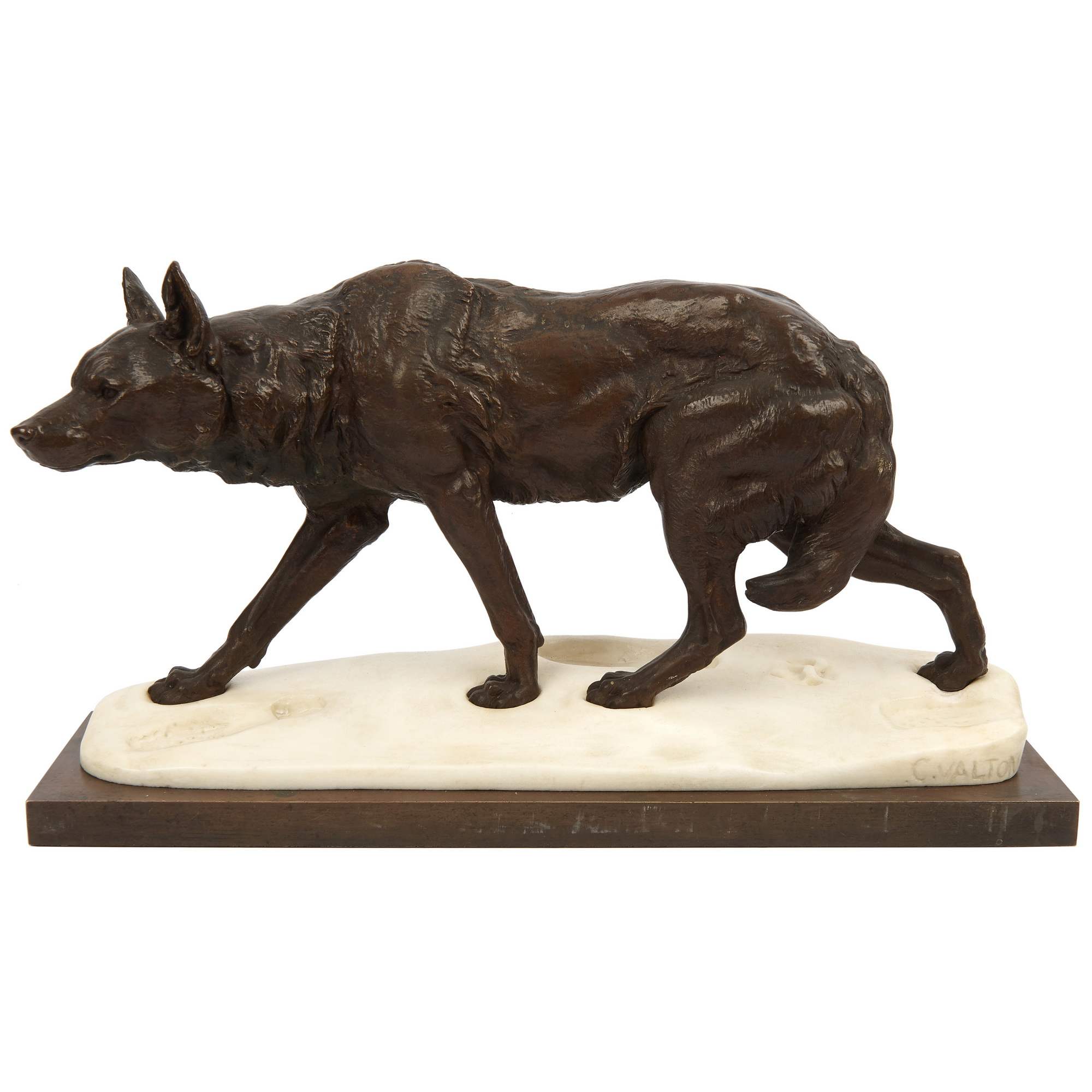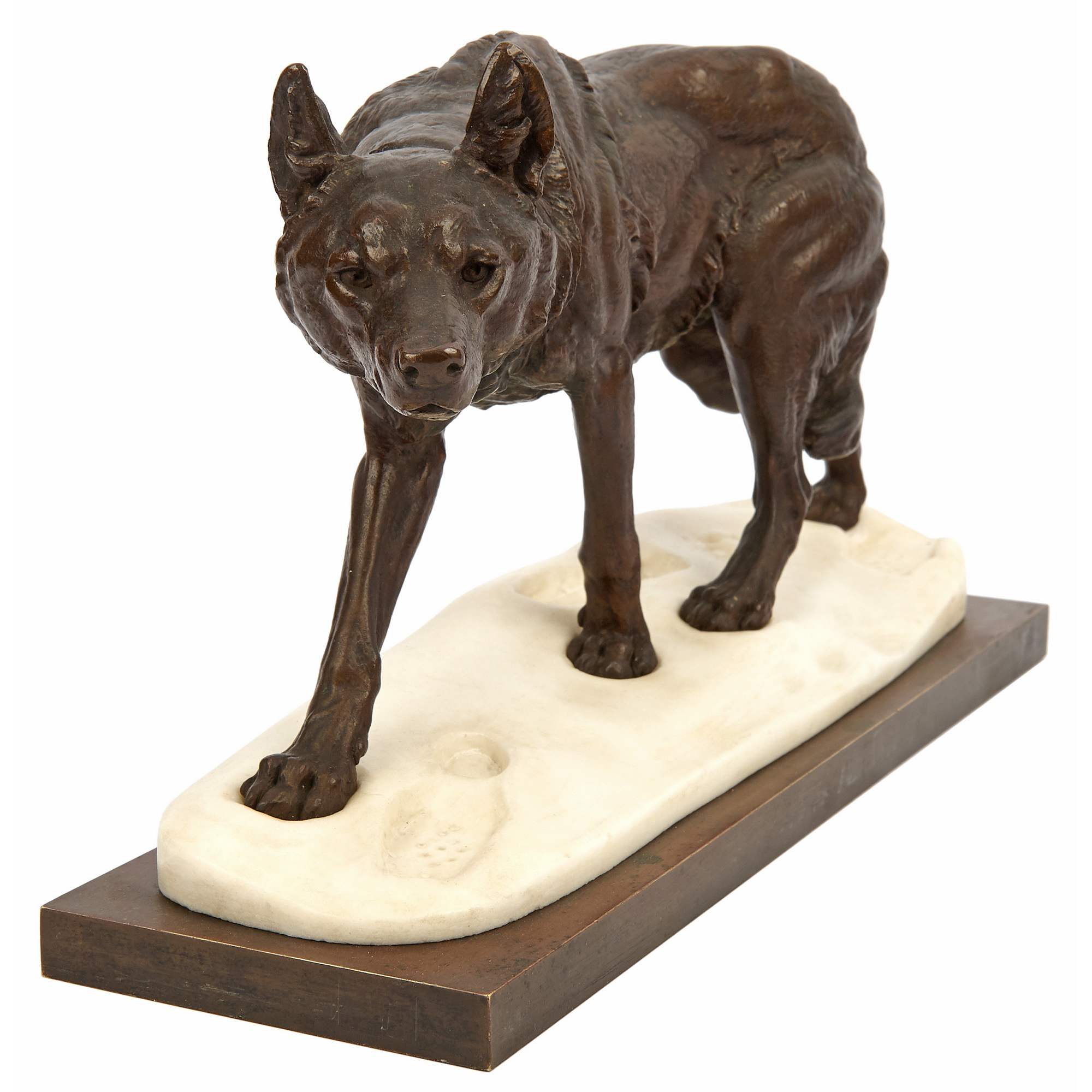 Великолепная старинная бронзовая скульптура на мраморном основании «Волк идущий по следу». Автор модели был истинным мастером композиционного решения - он оставил изображение самой охоты вне рамок композиции, предоставляя зрителю возможность представить развитие событий. Характер персонажа воспроизведен точно - волк, почуявший приближение охотника, застыл в напряженной позе умного и сильного животного. Гордый зверь готов ко встрече с человеком. Особую выразительность композиции придает контрастное и гармоничное сочетание белоснежного мраморного основания, удачно имитирующего снег, на котором видны следы и темной патинированной фигуры волка. Представленная статуэтка отлита по модели известного французского скульптора-анималиста Шарля Вальтона. Он был учеником основателей школы анималистической пластики - Антуана Луи Бари и Эммануэля Фремье. С пятнадцати лет Вальтон посещал Парижский Зоологический сад, делая многочисленные зарисовки животных и птиц, став настоящим знатоком их изображения. Многократно скульптор выставлял свои работы на Парижском Салоне, был удостоен звания профессора скульптуры, в 1906 году за выдающиеся художественные достижения награжден орденом Почетного легиона. Камерные модели Вальтона даже исполнялись в фарфоре на знаменитой Севрской мануфактуре. Модель, по которой отлита скульптура волка, пользовалась заслуженной популярностью. Скульптура имеет несомненное антикварное и коллекционное значение. Антиквариат. Хорошая сохранность.