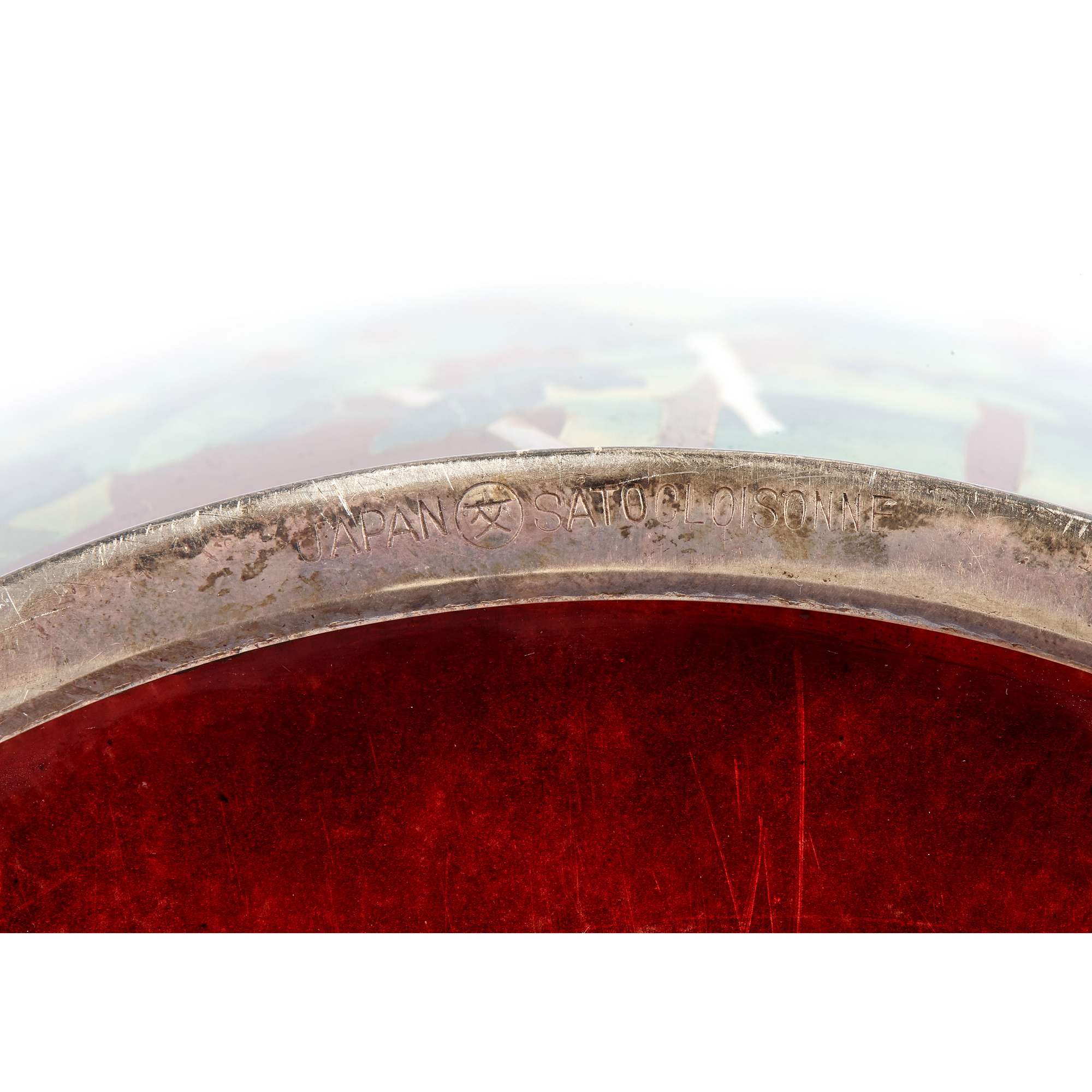Великолепная, красивейшая старинная ваза из белого металла с высоким содержанием серебра с эмалью в японском стиле с изображением цветов. Изделия в стиле «акасукэ», к числу которых относится представленная ваза, украшались на основе красной (тёмно-вишнёвой) эмали, очень высоко оцененной на западе и получившей название «рубиновое клуазоне, золотой рубин». Рисунки выполнены эмалями в оригинальных техниках, именуемых «сиппо», занимающих особое место в декоративно-прикладном искусстве как Японии, так и мира в целом. В эпоху, когда Япония и остальной мир взаимно открывали друг друга, художественные изделия японских мастеров выполняли высокую миссию, представляя миру Страну восходящего солнца через ее культуру. При этом представленная ваза отмечена также сюжетом, традиционно наполненным символическим смыслом. Слива - символ брака и счастья, пион - означает мужество, храбрость, честь, а также богатство и процветание. Цветы ириса символизируют мужество и упорство, а анемоны выражают нежность и надежду. Листья бамбука благодаря стойкости растения стали символом силы, долголетия и роста. Отличительной особенностью данной вазы является прекрасное владение сложнейшими техниками эмалирования «сиппо» мастерами известной японской компании Сато Бундзабуро, яркая декоративность изделия, и, что немаловажно и редко, прекрасная сохранность. Изделия фирмы украшают многие известные коллекции японского искусства и музейные собрания.