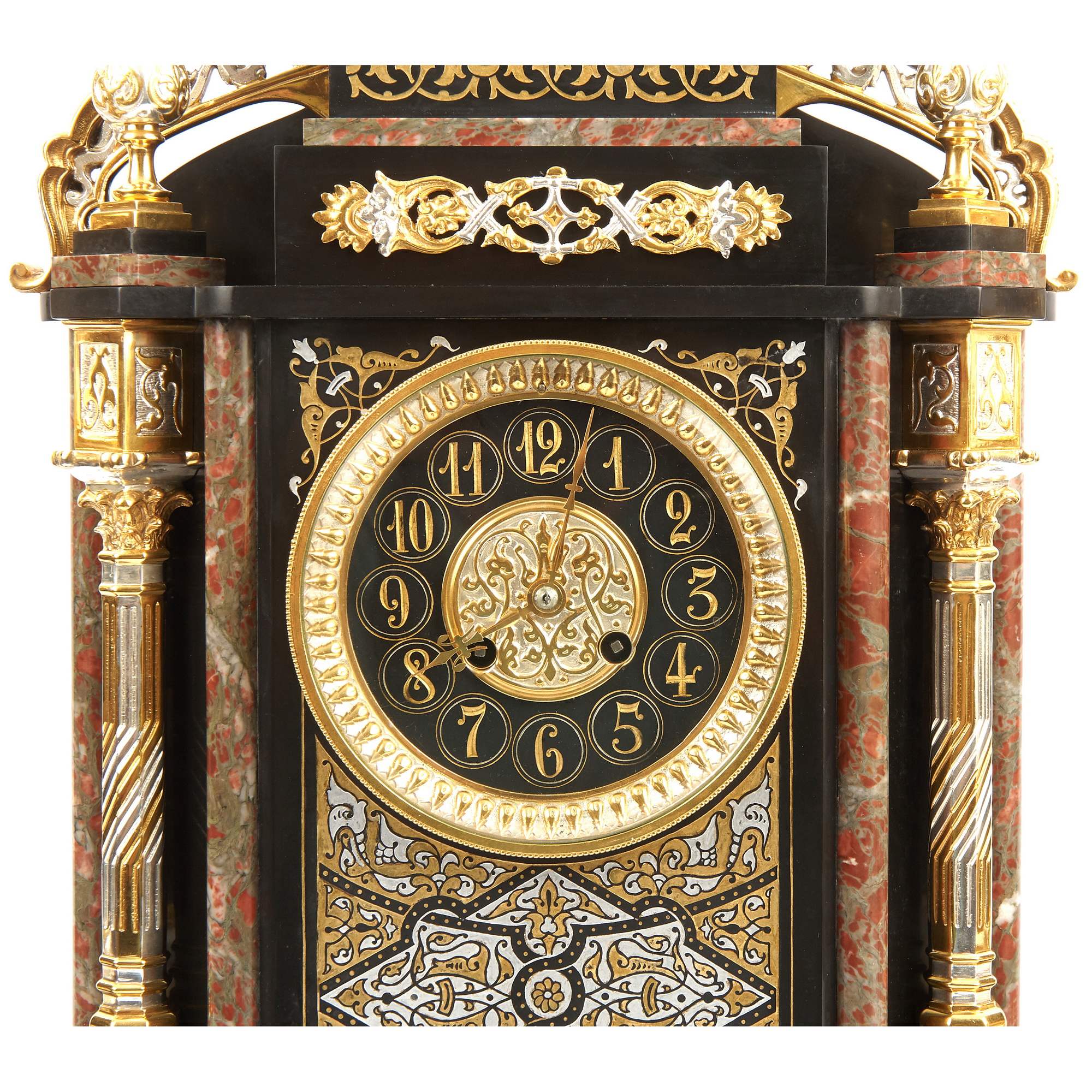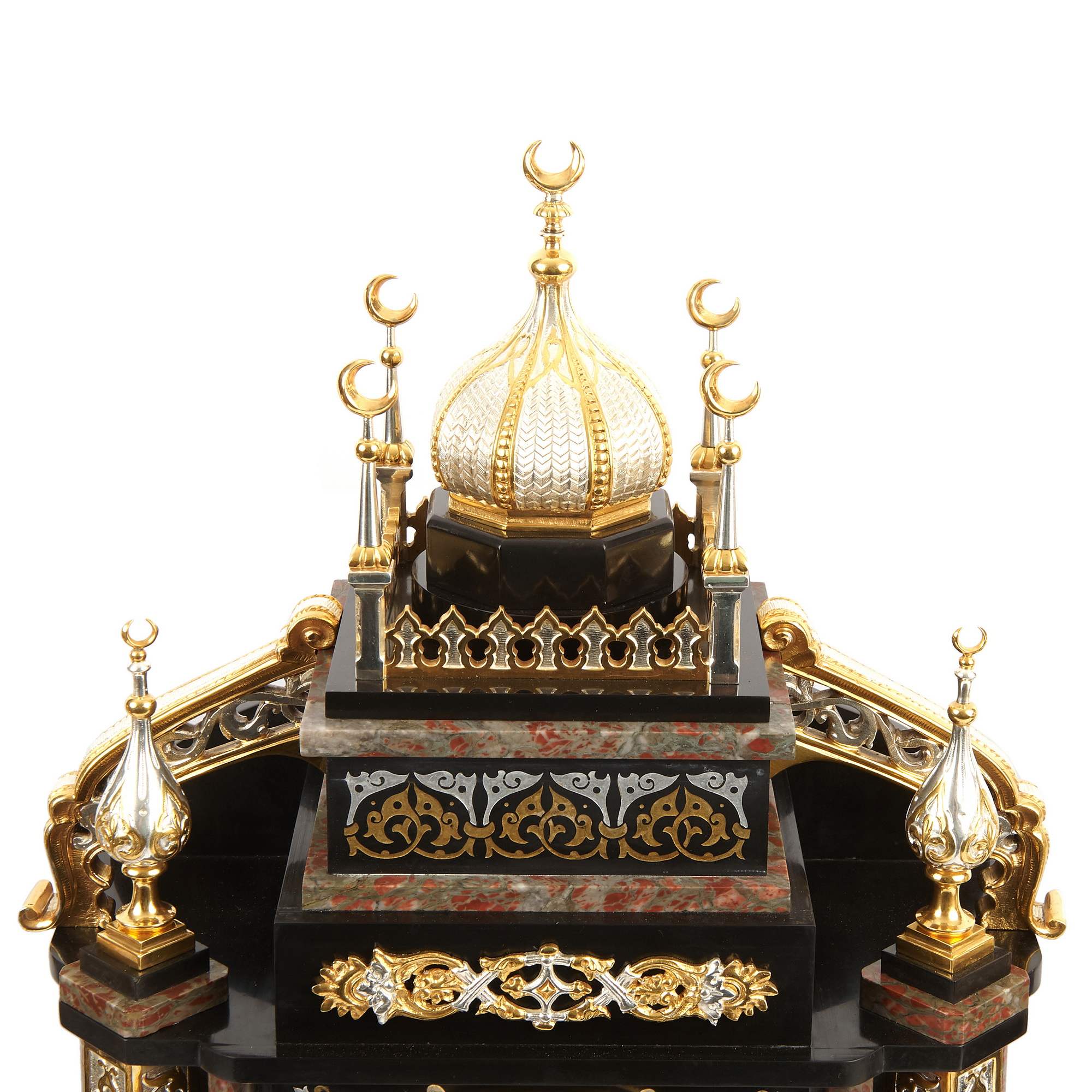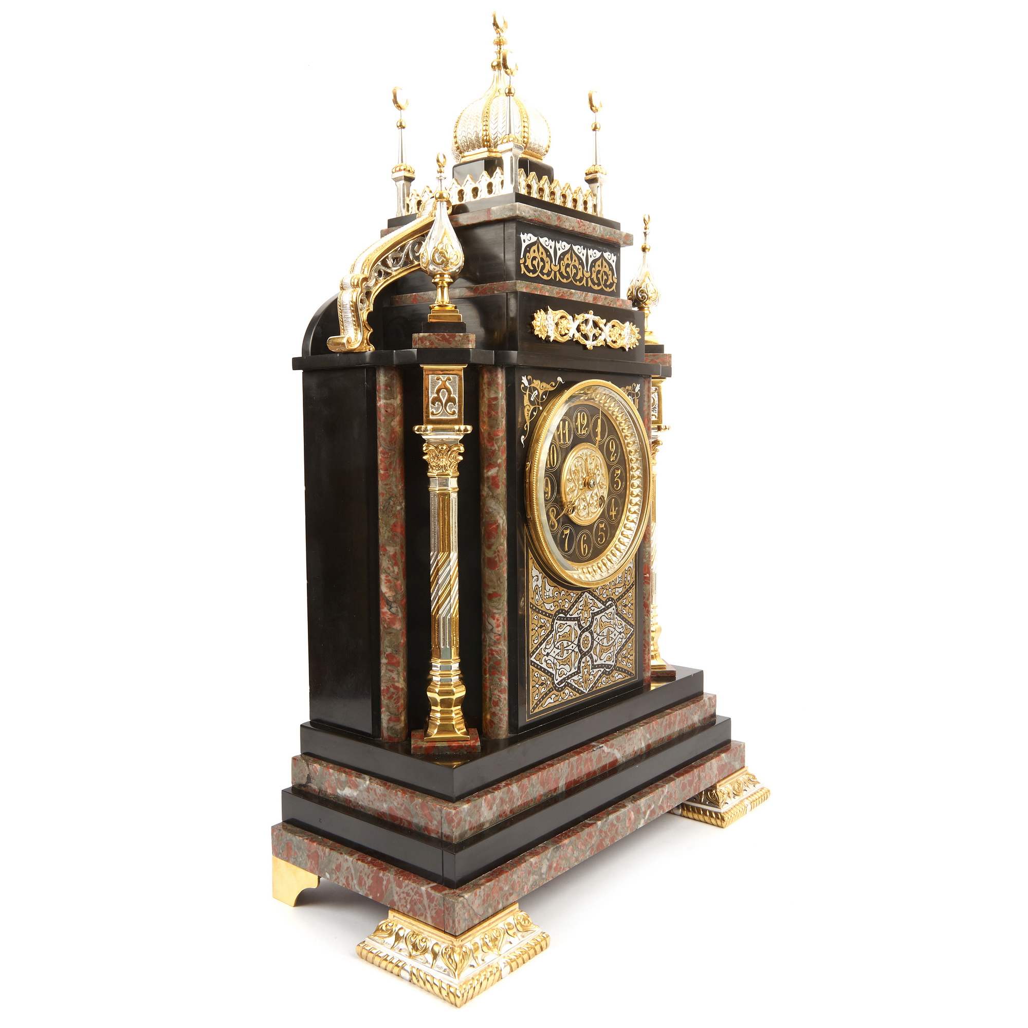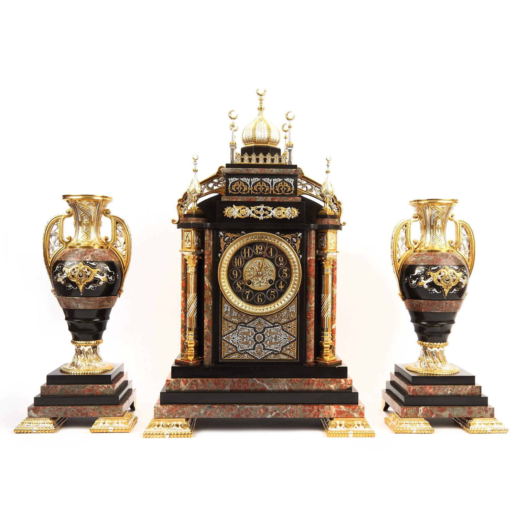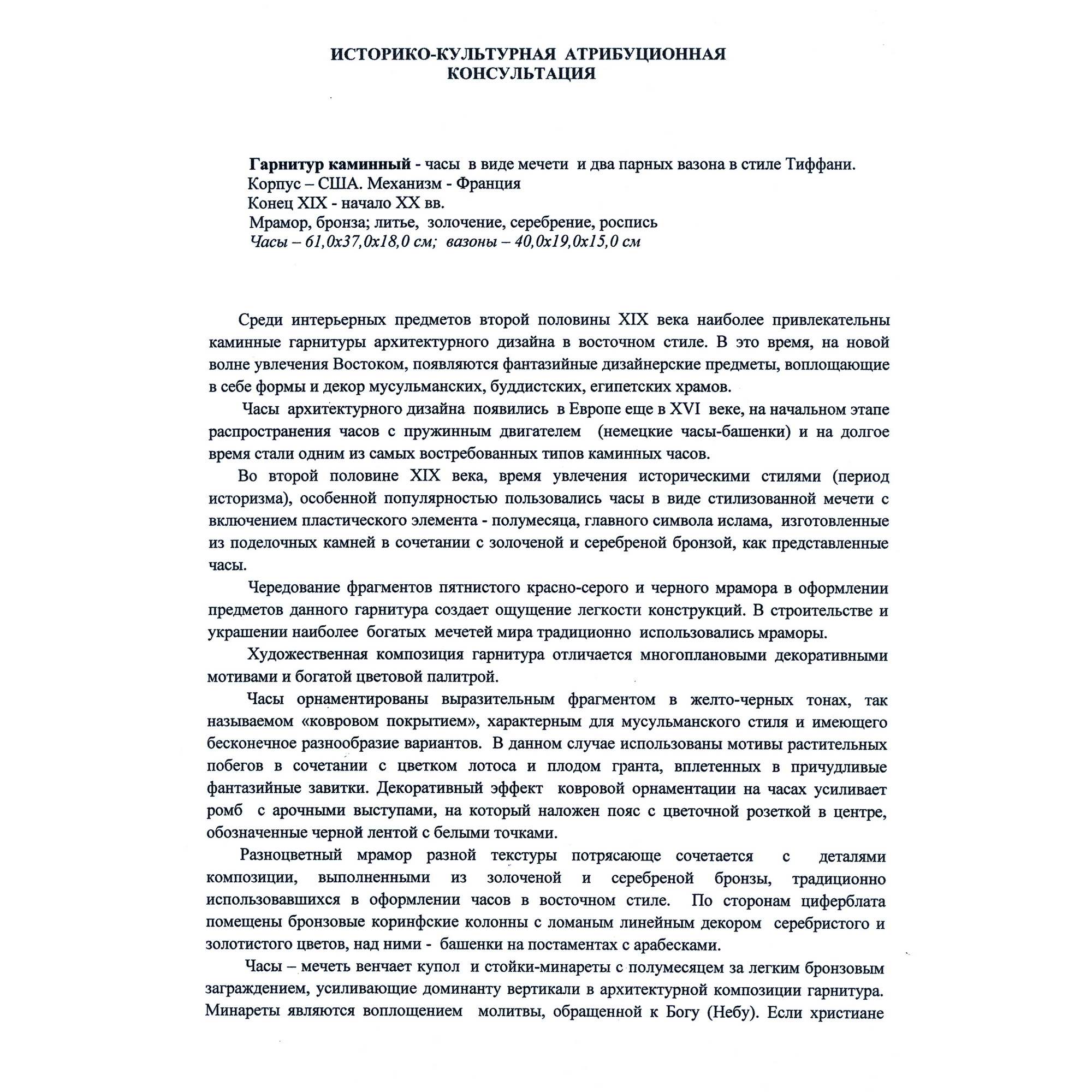 Великолепный, красивейший старинный каминный гарнитур, состоящий из часов в виде мечети и двух парных ваз. Художественная композиция гарнитура отличается многоплановыми декоративными мотивами и богатой цветовой палитрой. Мрамор разной текстуры потрясающе сочетается с деталями, выполненными из золоченой и серебреной бронзы. При этом фрагменты из благородного камня образуют гармонично построенное чередование серо-красного и черного цветов. Стоит отметить, что в декоре настоящих мечетей также традиционно использовались разноцветные породы камня. Часы орнаментированы изумительным «ковровым покрытием» в желто-черных тонах – характерным элементом восточного стиля. По сторонам от циферблата помещены искусно исполненные бронзовые колонны с башенками на постаментах – выглядит эффектно и усложняет «архитектурную» форму. Сверху расположен купол и стойки-минареты за легким ограждением – он не только смотрится уместно и аутентично, но еще и усиливает доминанту часов-мечети. При этом декор купола также сложен, сочетает в себе золоченые и посеребренные поверхности. При украшении вазонов был использован как восточный геометрический орнамент на горлах и ручках, так и классицистический на туловах. Вазоны превосходно дополняют часы, прекрасно перекликаясь с ними своим художественным решением. Изготовителем гарнитура вероятней всего была фирма «Тиффани и Ко» - знаменитое ювелирное предприятие, основанное в Нью-Йорке в 1837 году. Их изделия прогремели на весь мир, на фирме работали искуснейшие дизайнеры, а часовые механизмы заказывались у лучших швейцарских и французских производителей. Представленный образец каминного гарнитура, отличающийся особой художественной выразительностью, имеет антикварное и коллекционное значение. Антиквариат. Прекрасная сохранность. Редкость.