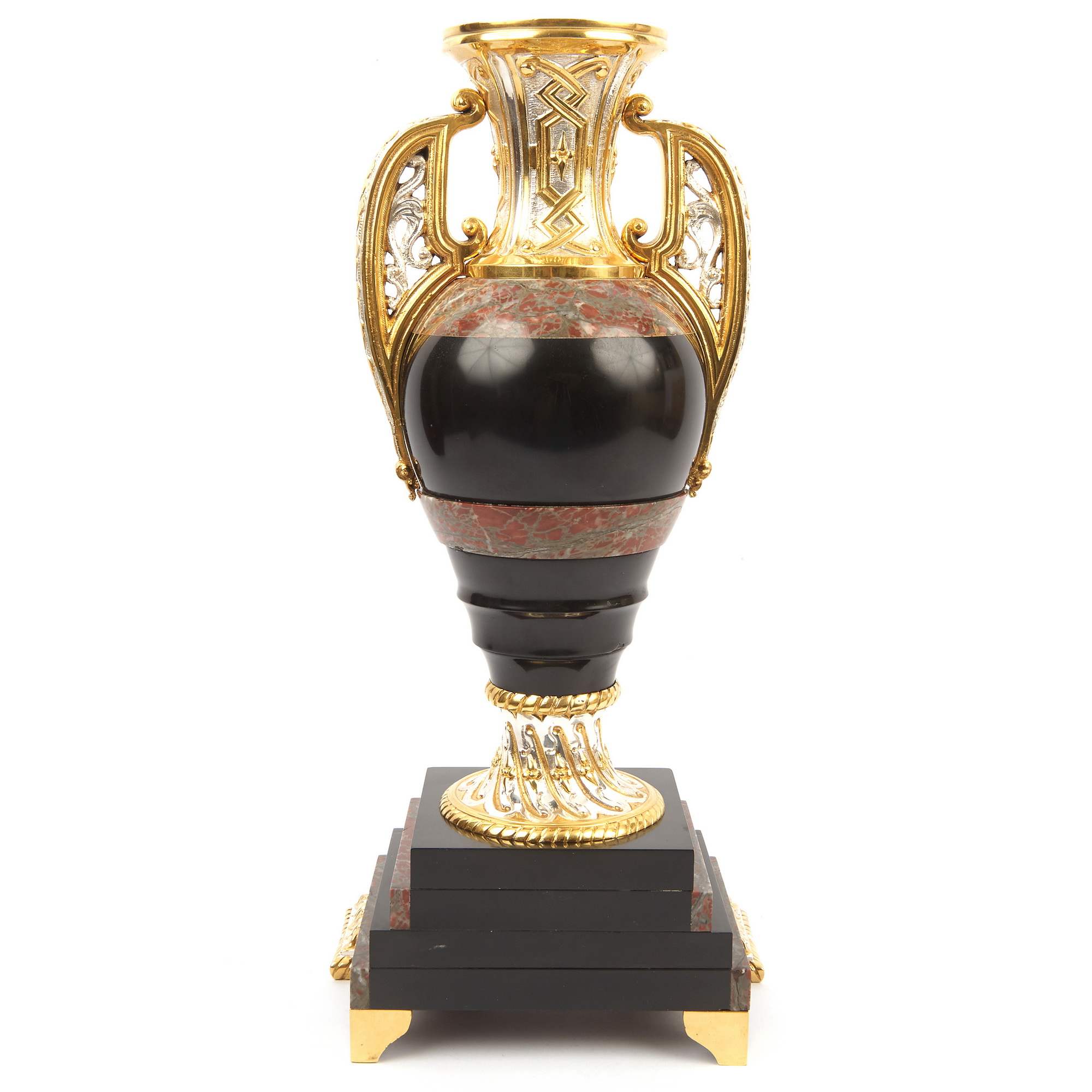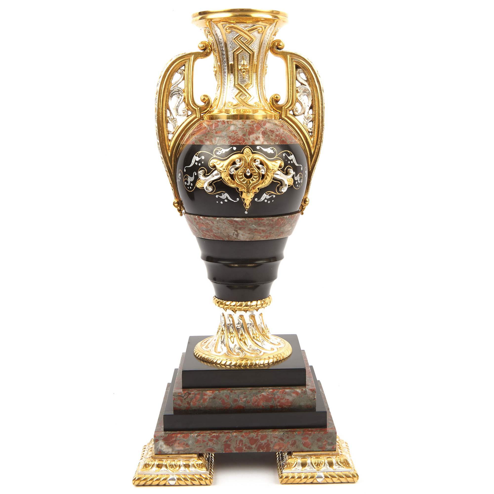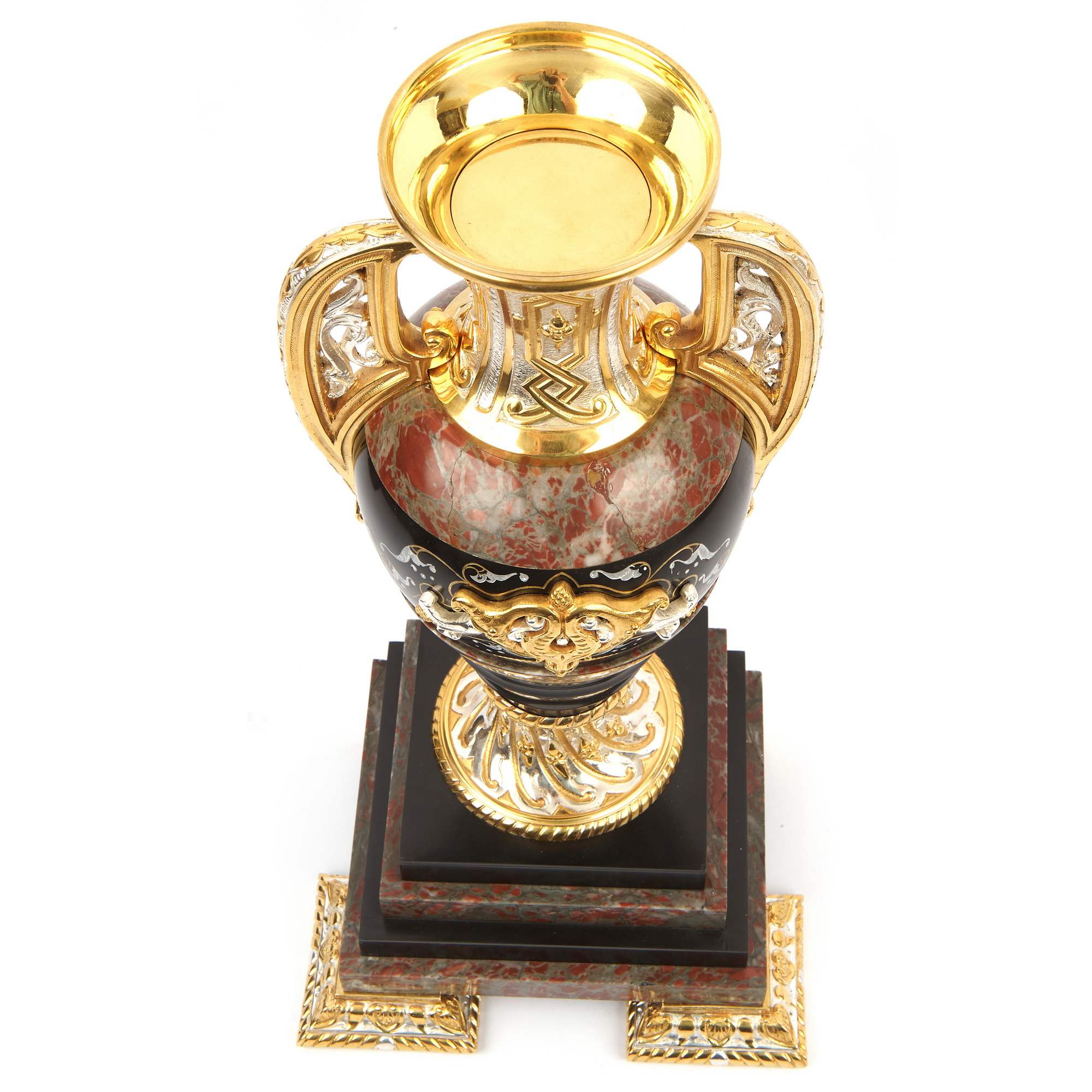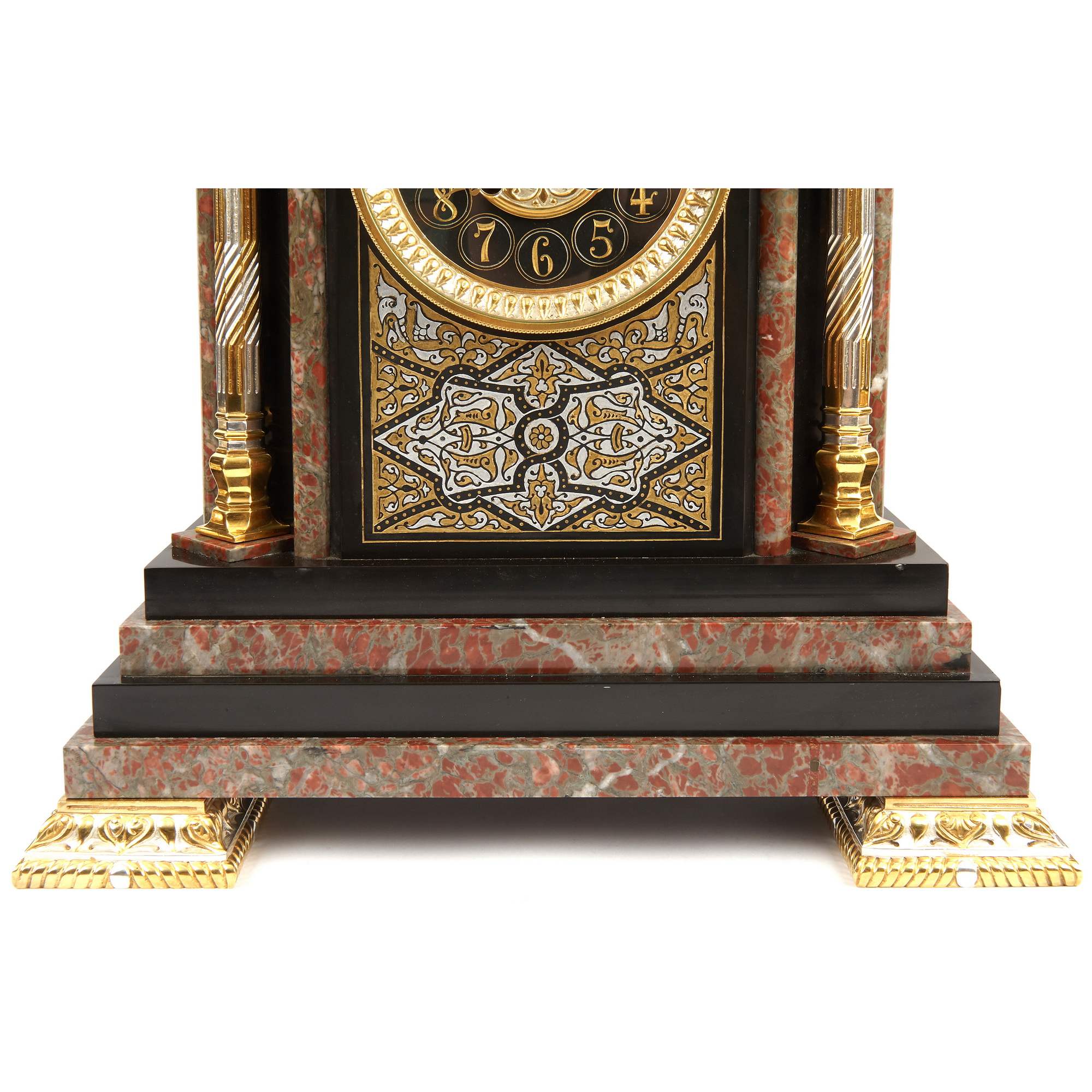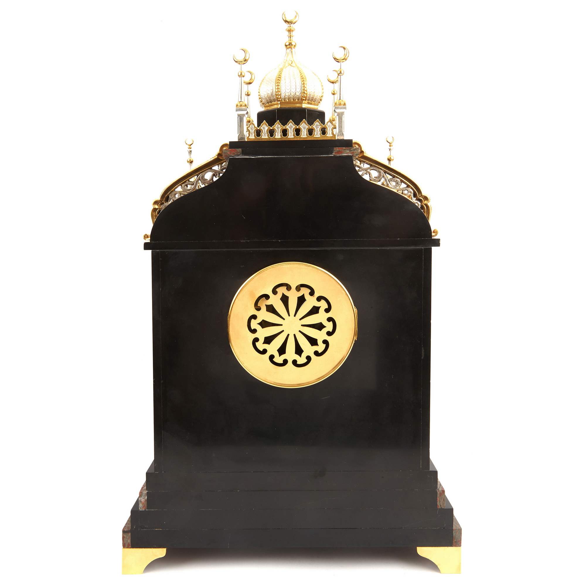 Великолепный, красивейший старинный каминный гарнитур, состоящий из часов в виде мечети и двух парных ваз. Художественная композиция гарнитура отличается многоплановыми декоративными мотивами и богатой цветовой палитрой. Мрамор разной текстуры потрясающе сочетается с деталями, выполненными из золоченой и серебреной бронзы. При этом фрагменты из благородного камня образуют гармонично построенное чередование серо-красного и черного цветов. Стоит отметить, что в декоре настоящих мечетей также традиционно использовались разноцветные породы камня. Часы орнаментированы изумительным «ковровым покрытием» в желто-черных тонах – характерным элементом восточного стиля. По сторонам от циферблата помещены искусно исполненные бронзовые колонны с башенками на постаментах – выглядит эффектно и усложняет «архитектурную» форму. Сверху расположен купол и стойки-минареты за легким ограждением – он не только смотрится уместно и аутентично, но еще и усиливает доминанту часов-мечети. При этом декор купола также сложен, сочетает в себе золоченые и посеребренные поверхности. При украшении вазонов был использован как восточный геометрический орнамент на горлах и ручках, так и классицистический на туловах. Вазоны превосходно дополняют часы, прекрасно перекликаясь с ними своим художественным решением. Изготовителем гарнитура вероятней всего была фирма «Тиффани и Ко» - знаменитое ювелирное предприятие, основанное в Нью-Йорке в 1837 году. Их изделия прогремели на весь мир, на фирме работали искуснейшие дизайнеры, а часовые механизмы заказывались у лучших швейцарских и французских производителей. Представленный образец каминного гарнитура, отличающийся особой художественной выразительностью, имеет антикварное и коллекционное значение. Антиквариат. Прекрасная сохранность. Редкость.