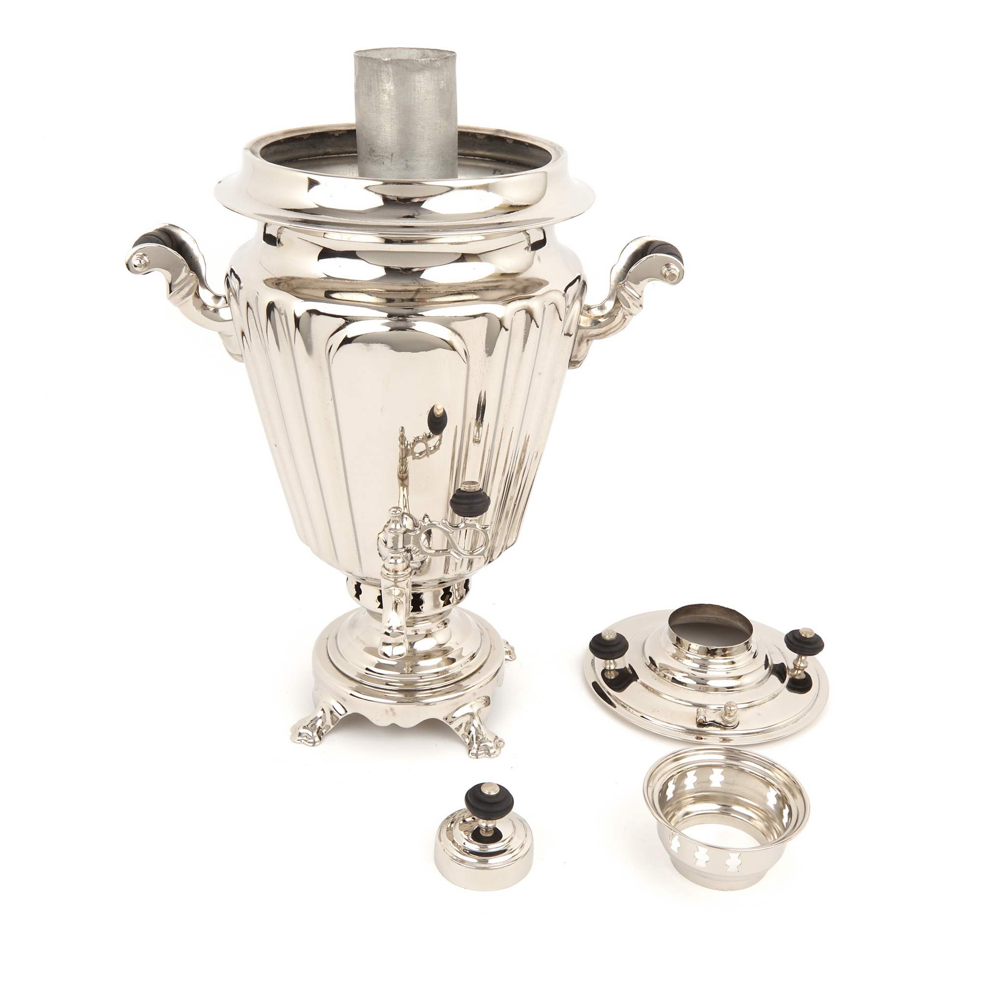 Красивый старинный советский жаровой самовар «Рюмка с гранью». Самовар – это не просто практичный и красивый сосуд для горячей воды, это настоящий символ тепла, уюта семейной домашней атмосферы. Это предмет, превращающий чаепитие в ритуал, наполненный ароматным теплым воздухом и задушевными разговорами. Новое качественное лужение. Никелирование. Хорошая сохранность. Профессиональная реставрация. Полный комплект. Антиквариат.