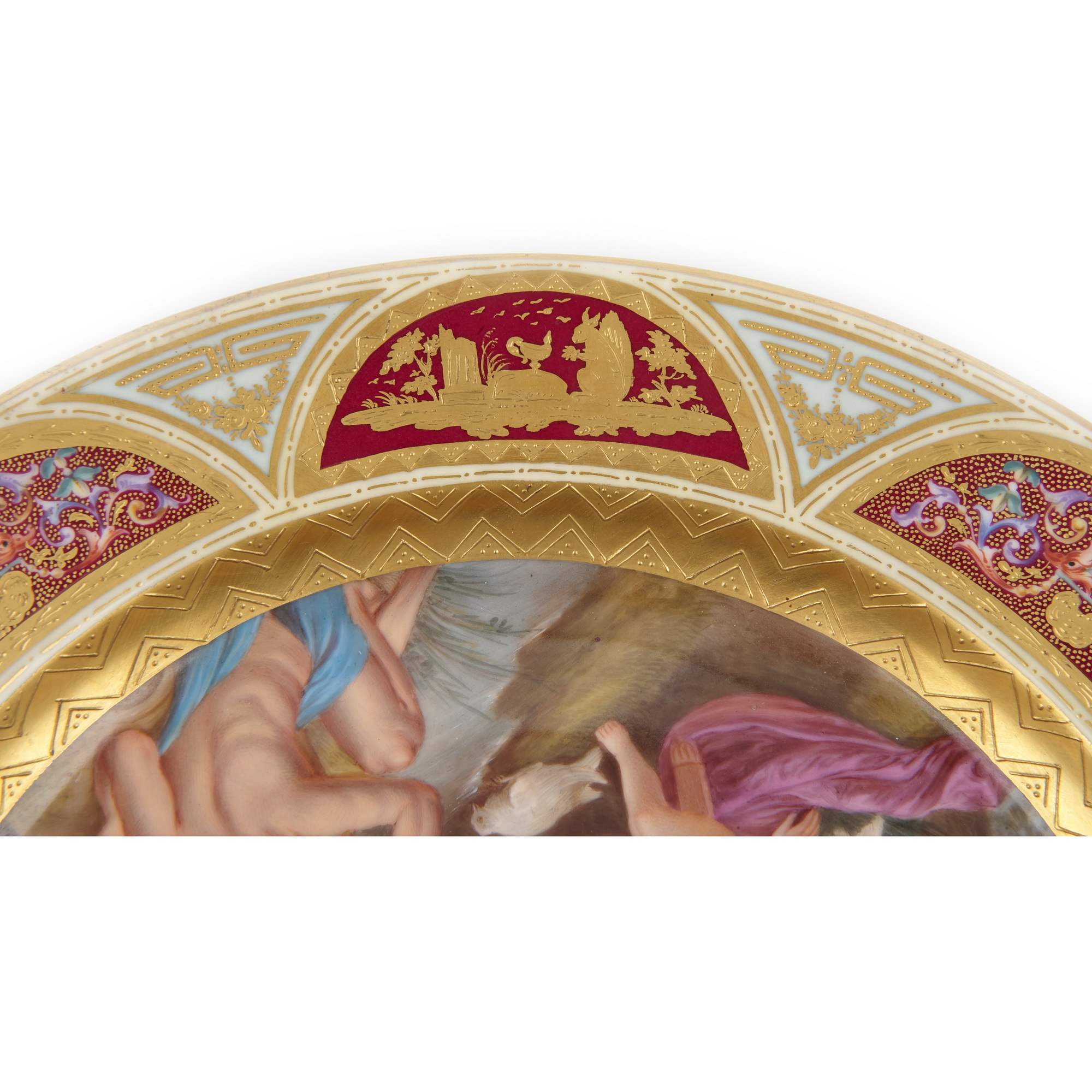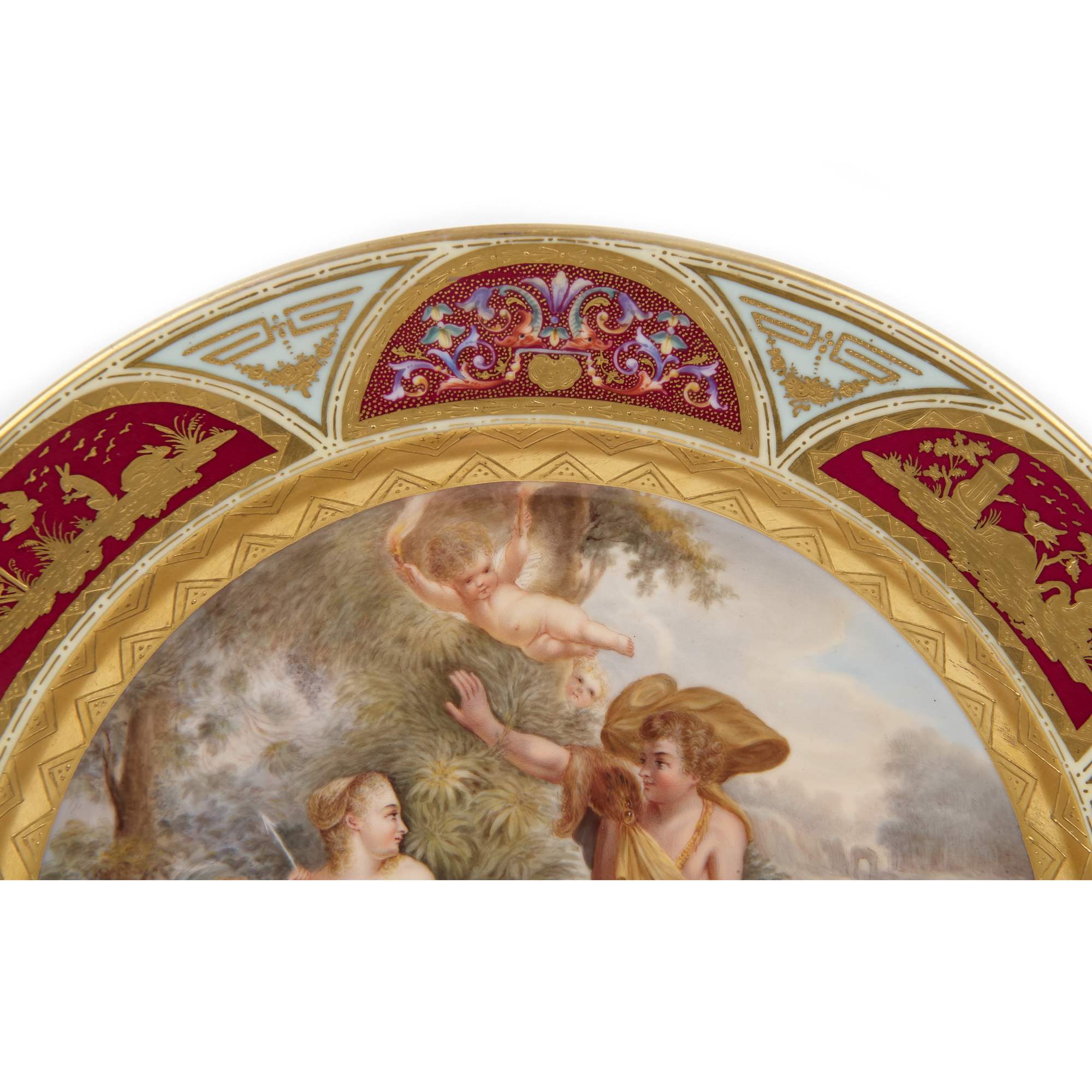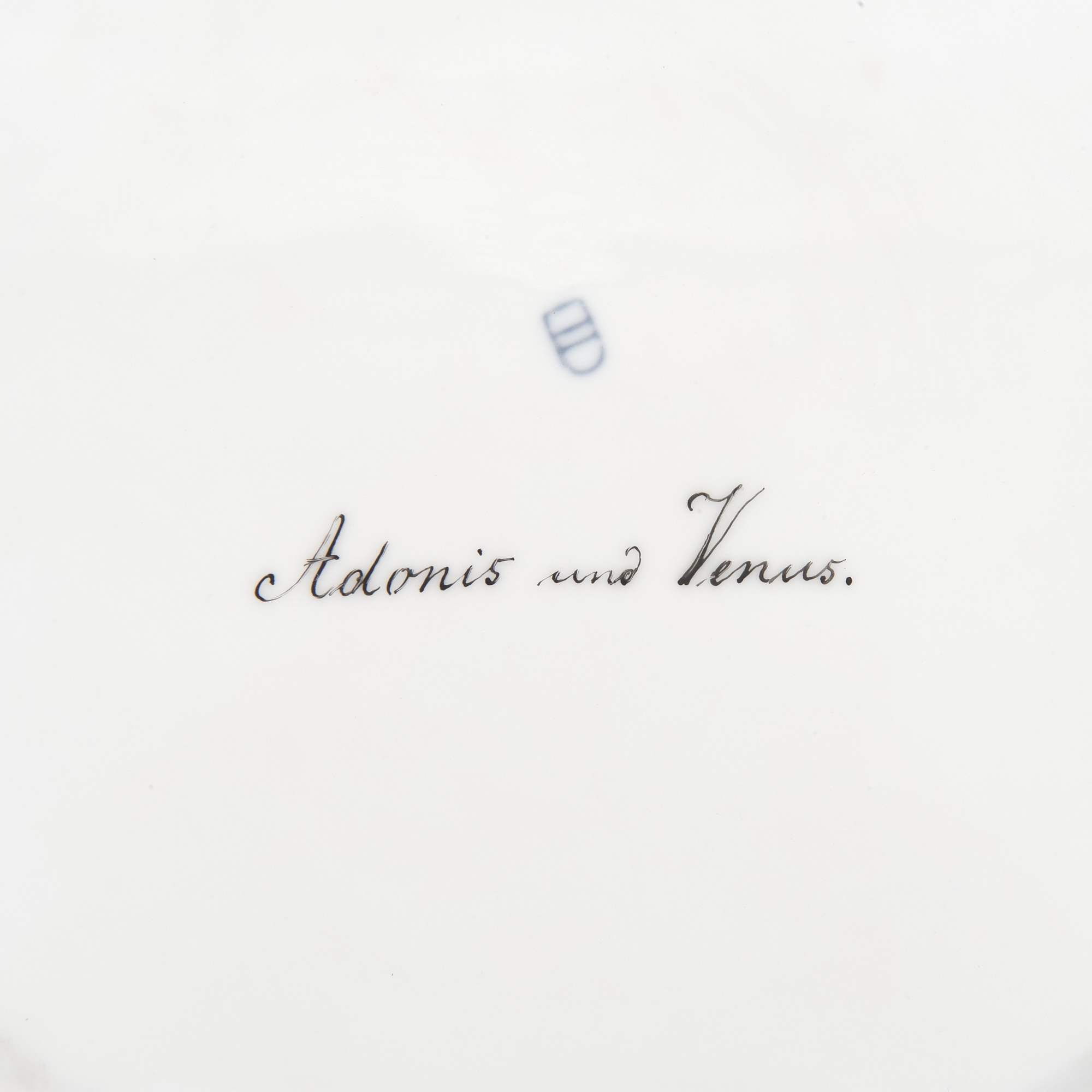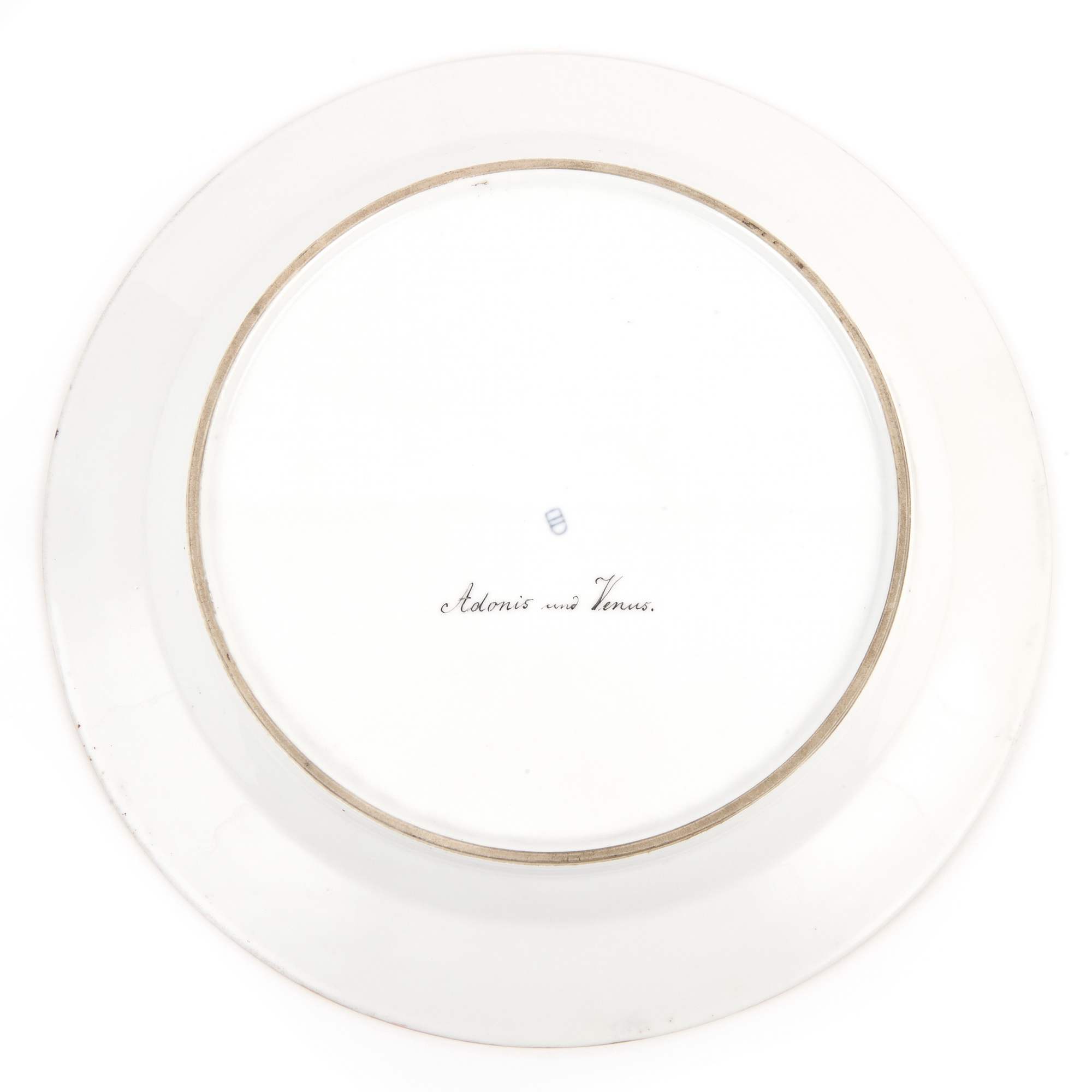 Роскошное старинное декоративное блюдо с сюжетом на античную тему изображающую Адониса и прекрасную Венеру. Блюдо отличается превосходной росписью данного сюжета и великолепным обрамлением бортов, богато украшенных тонкой росписью золотом с 4-мя миниатюрами посвященных животному миру с различными сюжетами. Антиквариат. Отличная сохранность. Без реставрации.