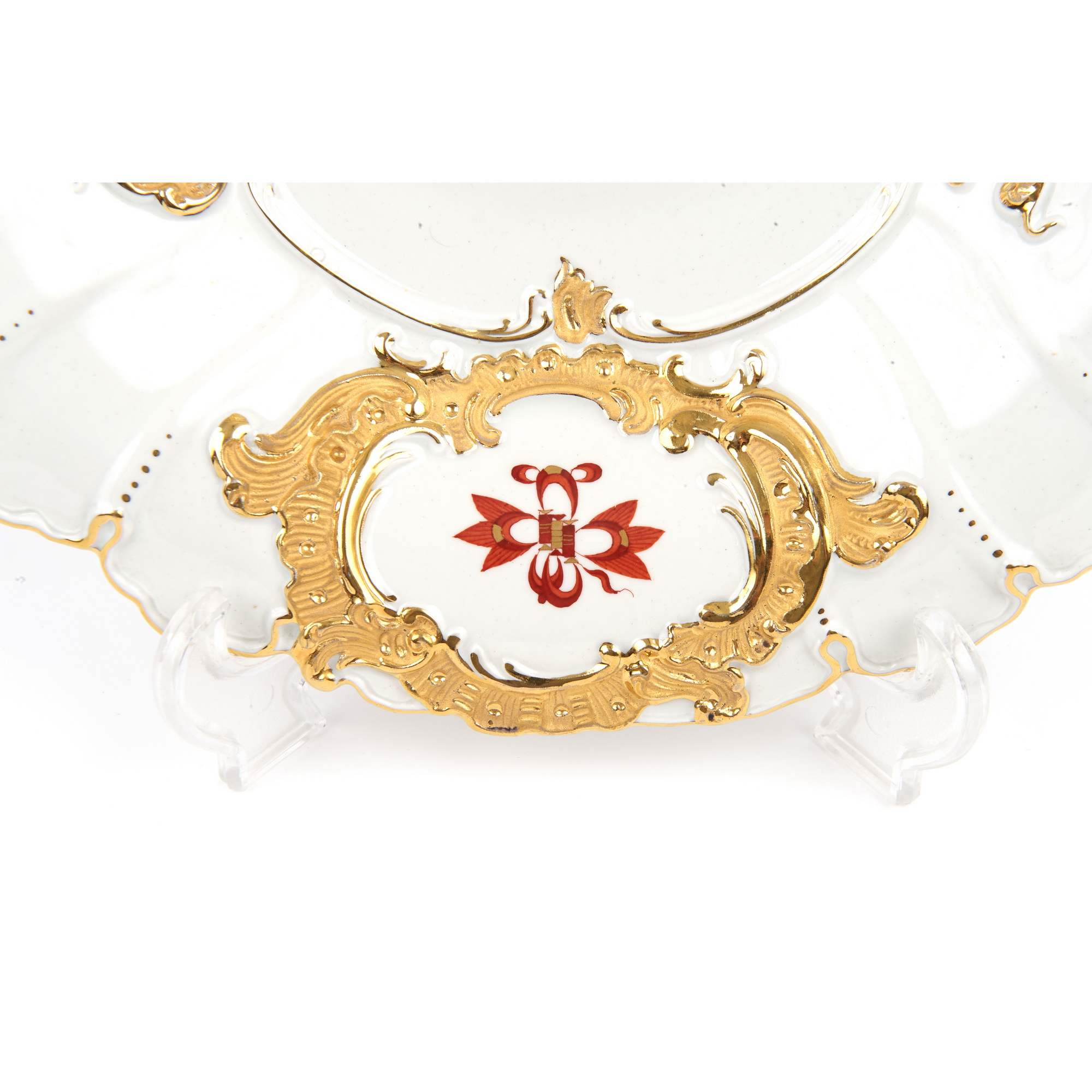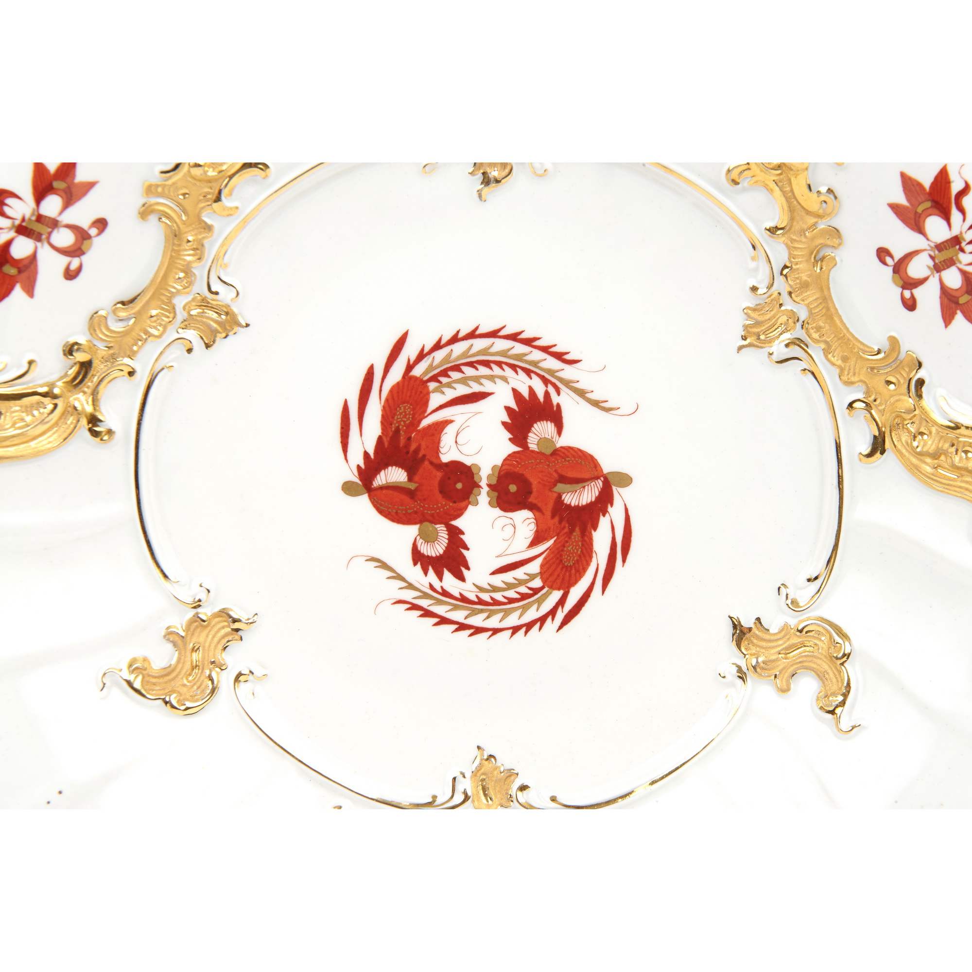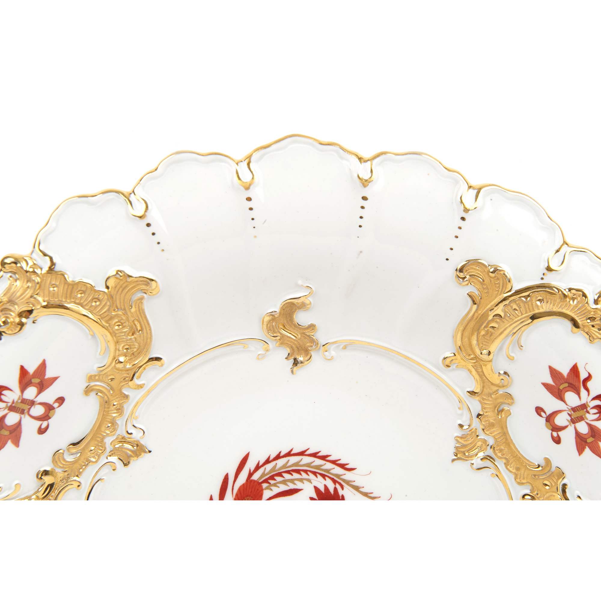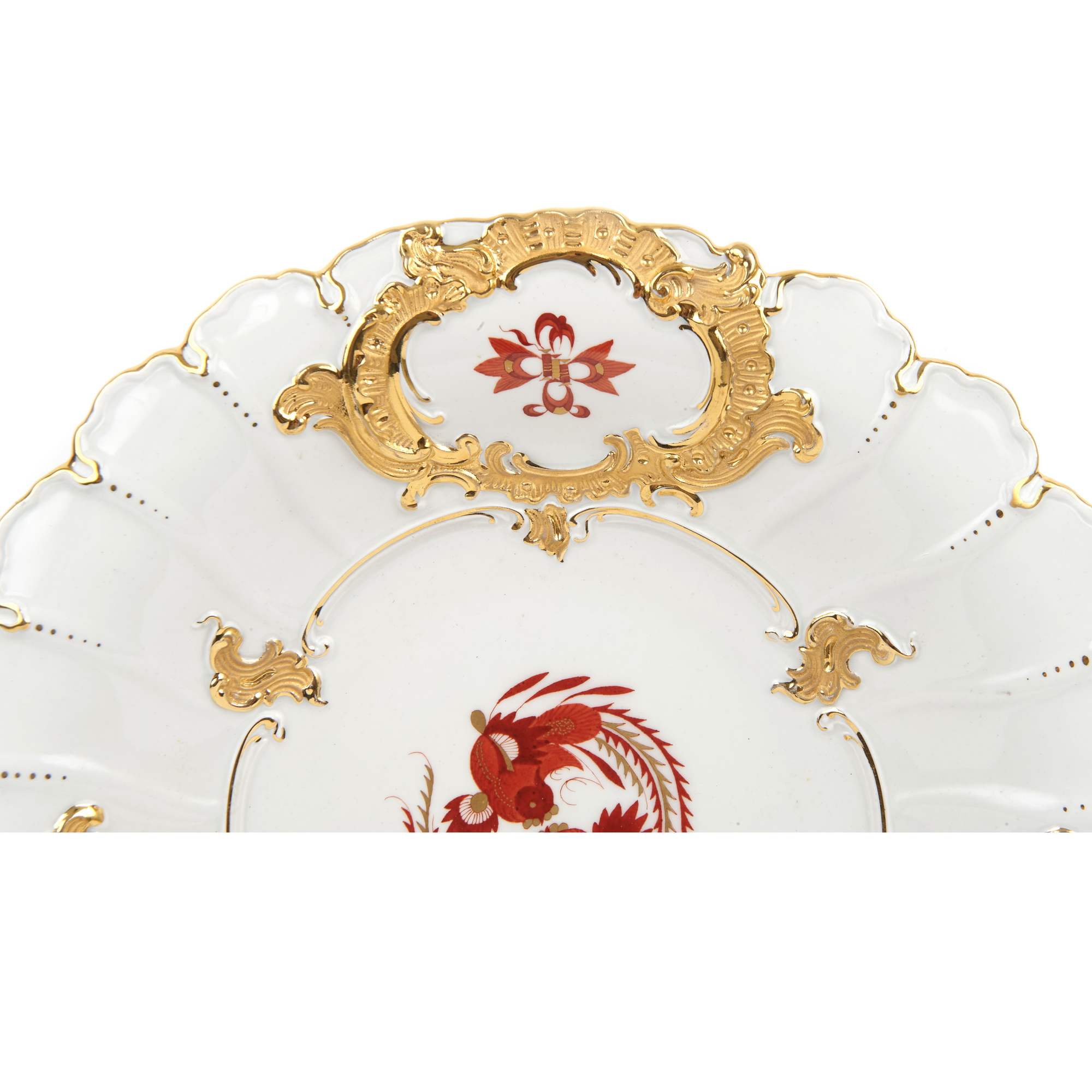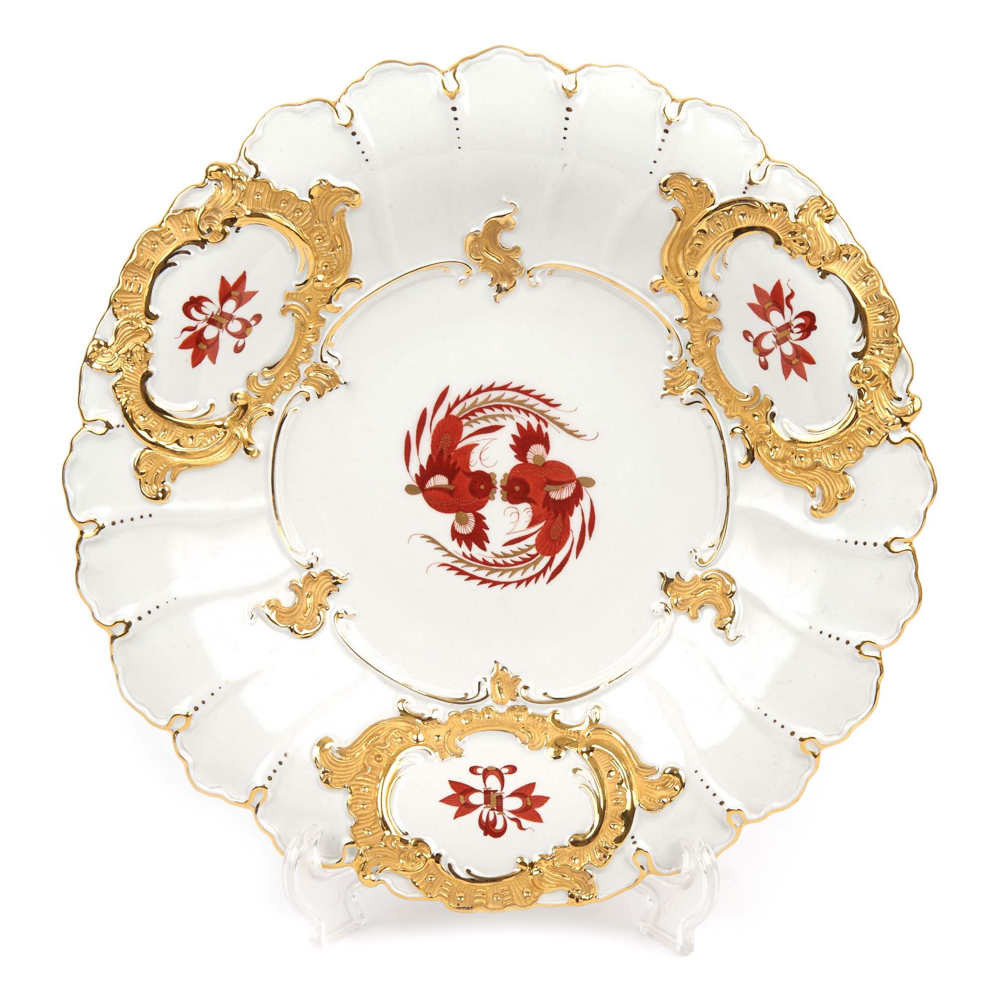 Красивое декоративное блюдо «сказочные птицы», яркий образец творчества мастеров знаменитой мейссенской мануфактуры, колыбели европейского фарфора. Блюдо покрыто красивой росписью золотом по рельефу. Отличная сохранность.