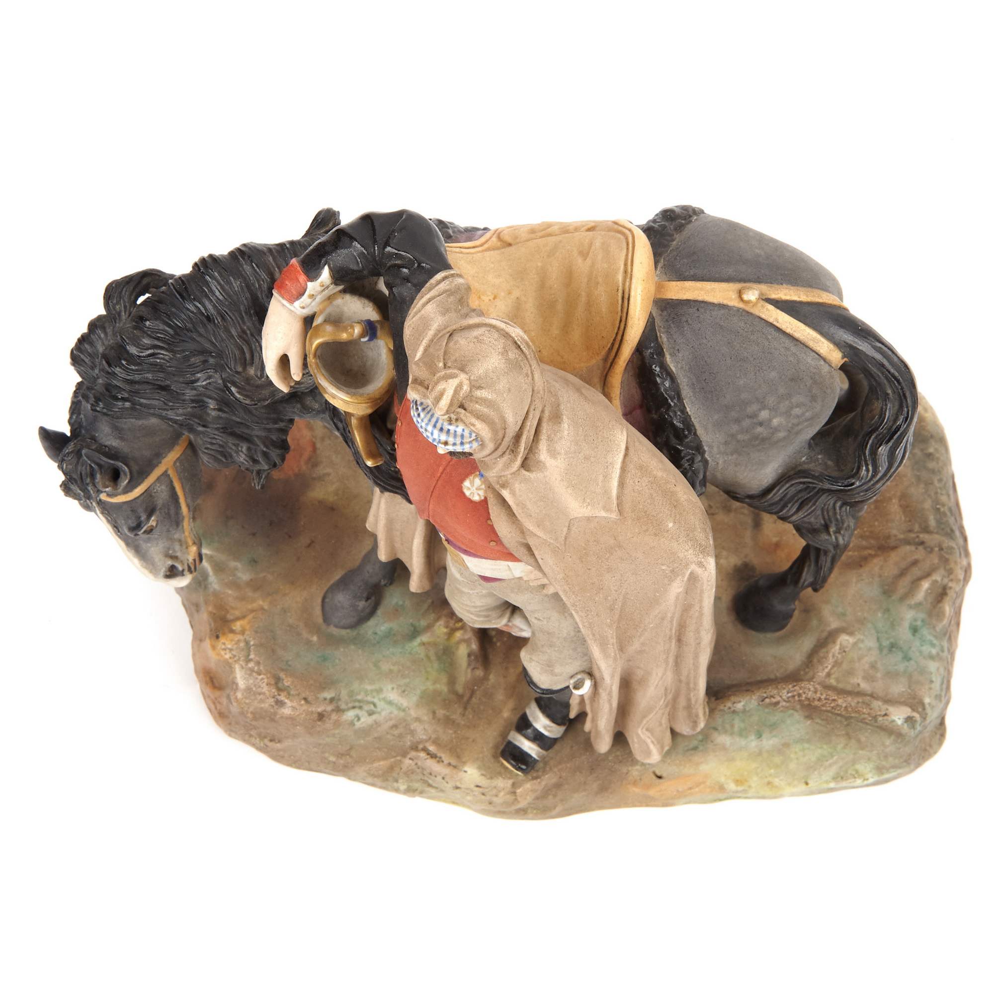 Замечательная старинная скульптура «Раненный французский кирасир с конем». Яркий образец продукции знаменитой фабрики Гарднера, первой частной фарфоровой мануфактуры российской империи основанной в 18-м веке. Сюжет посвящен теме Отечественной войны 1812-го года. Антиквариат. Хорошая сохранность. Реставрировано только правое ухо у коня ( ухо свое ).