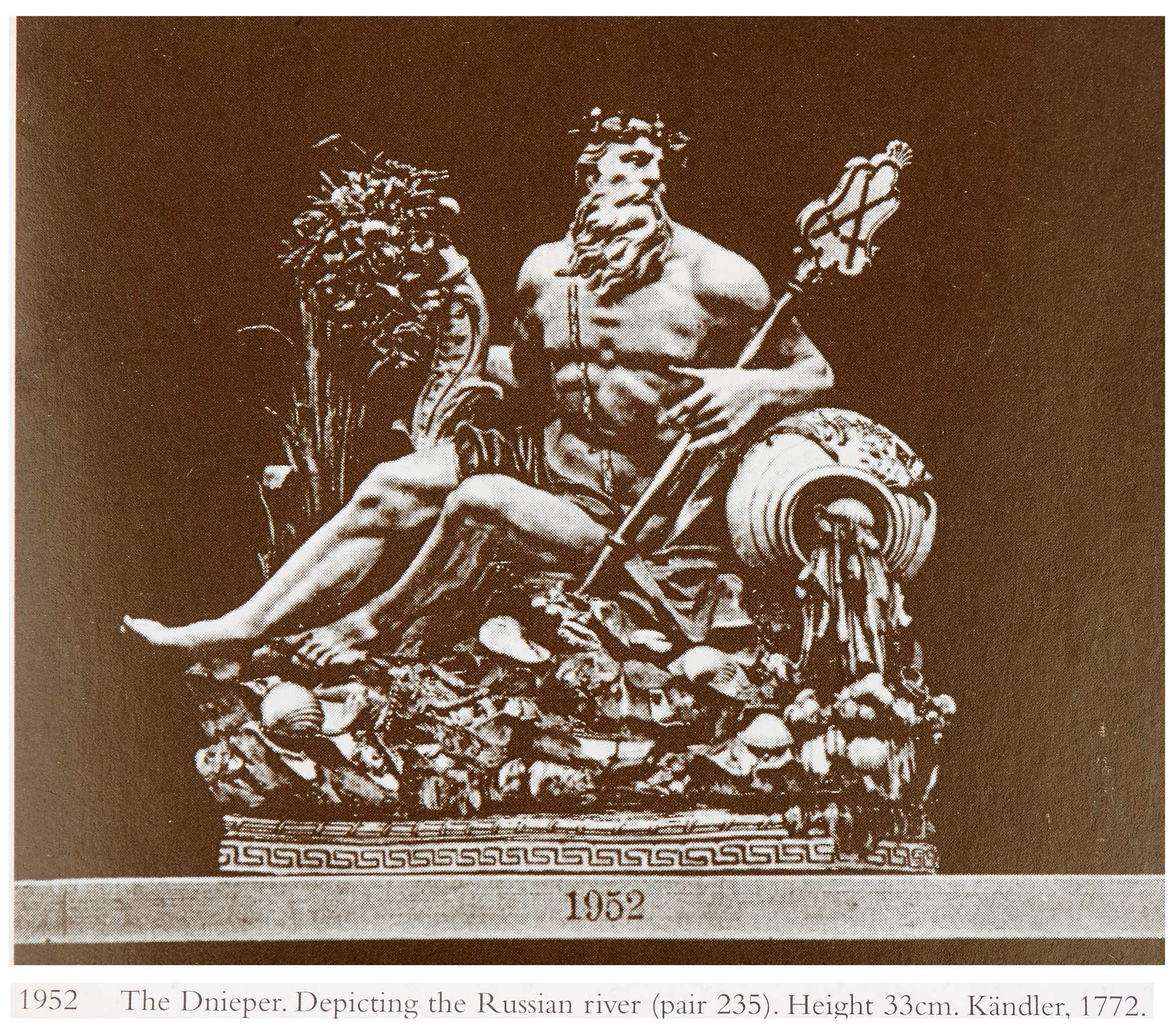 Великолепная скульптурная композиция , аллегория «Днепр - русская река» ( ее буквальное название ). Изготовлена во второй четверти 19-го века на знаменитой мейссенской мануфактуре по модели самого именитого их скульптора Иогана Кендлера 1772-го года. Подобная скульптура, но с российским гербом была в коллекции Императрицы Екатерины Второй.