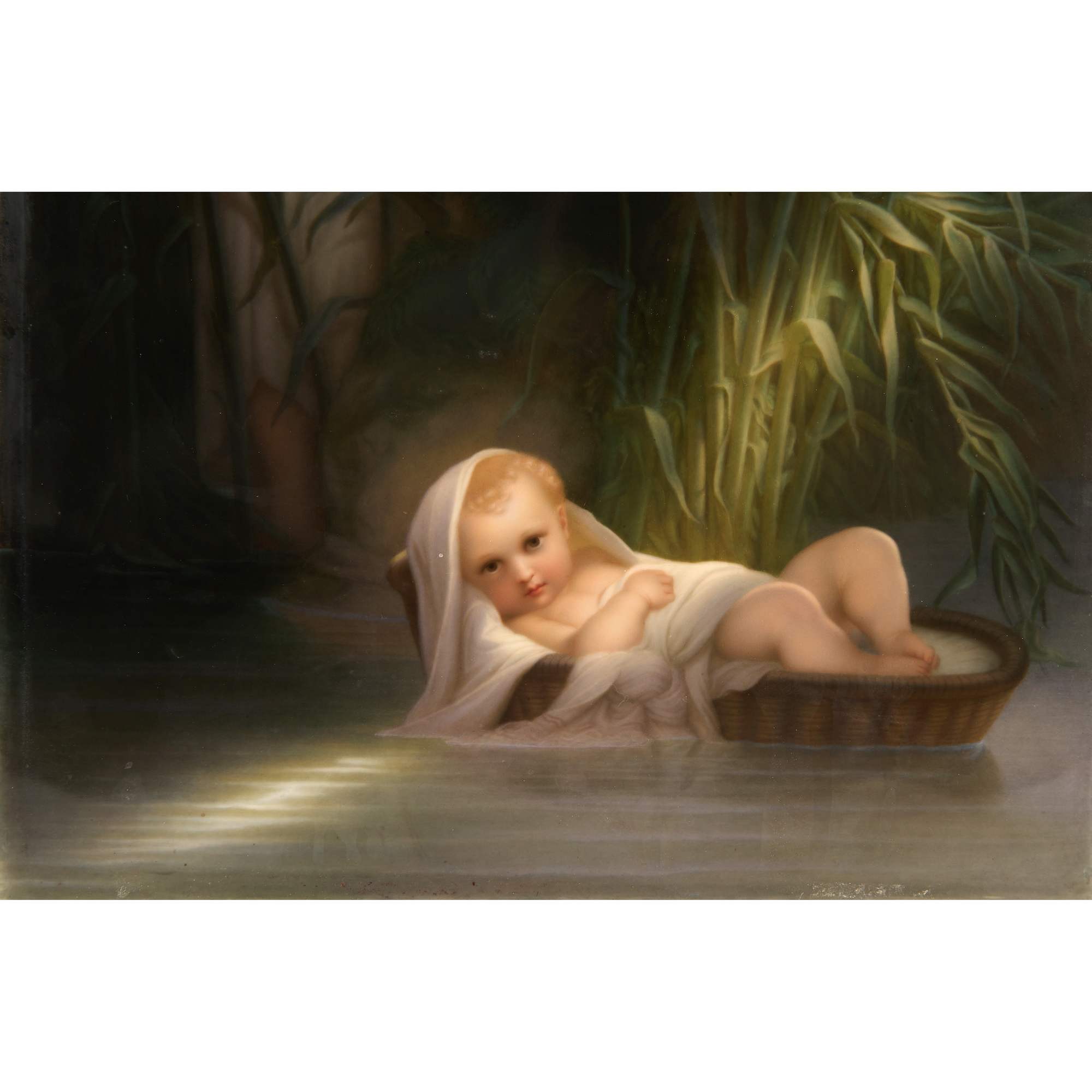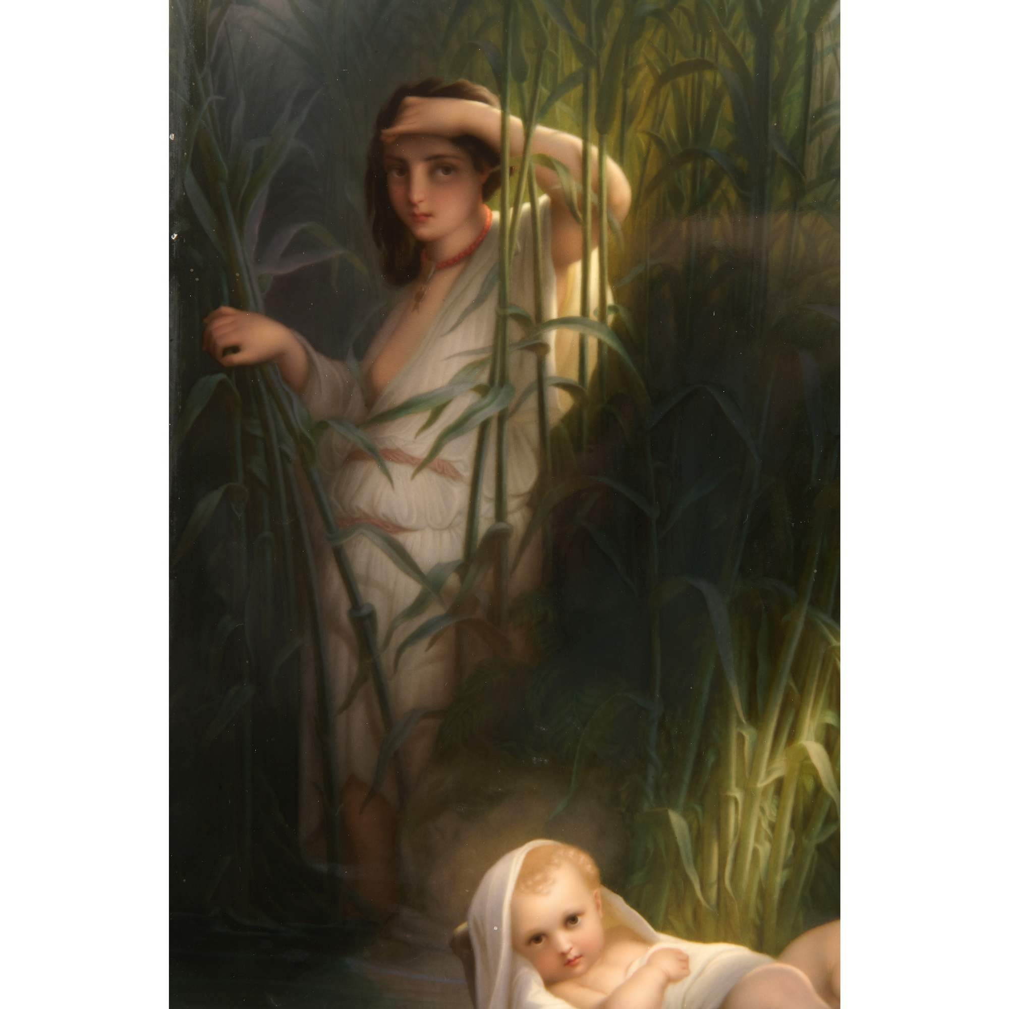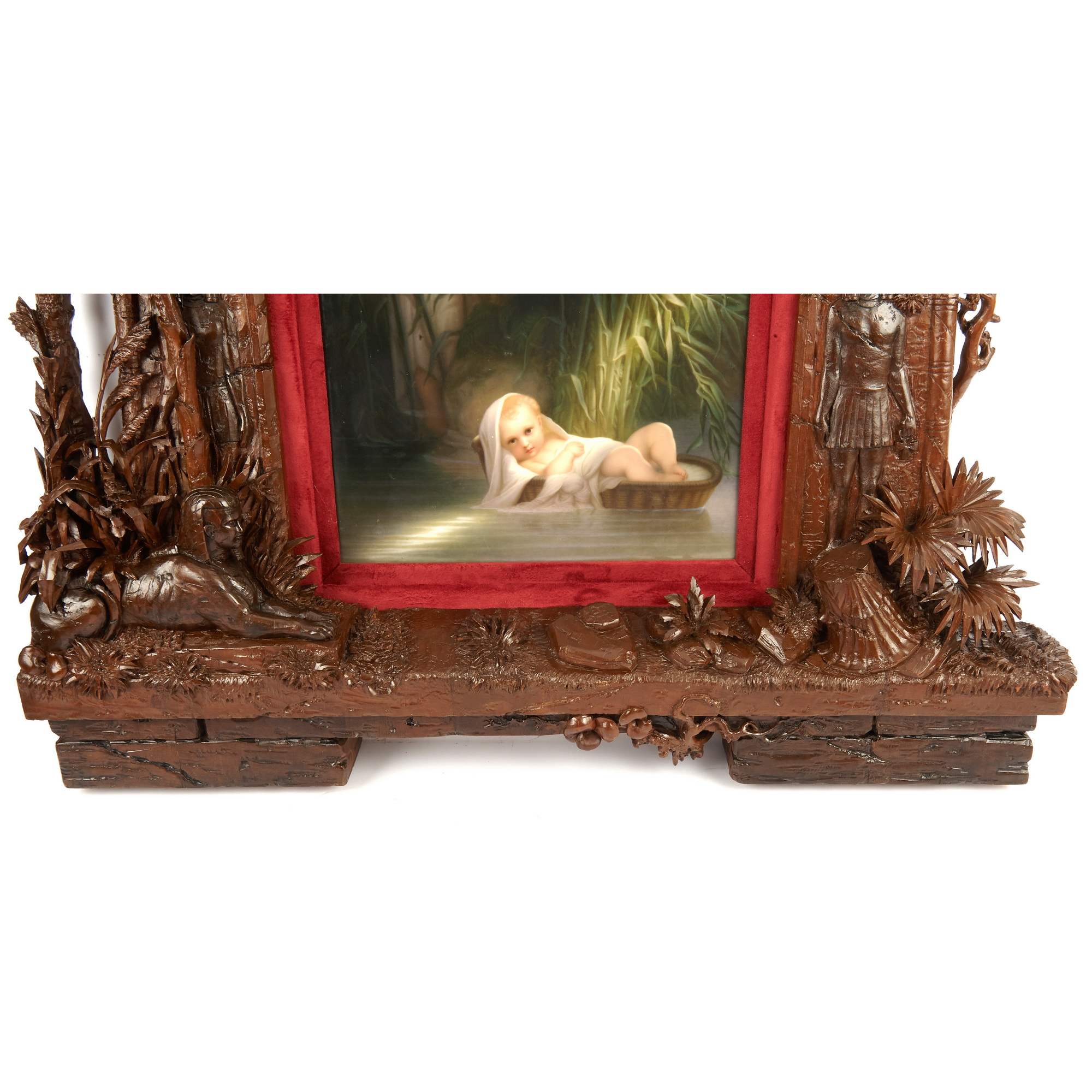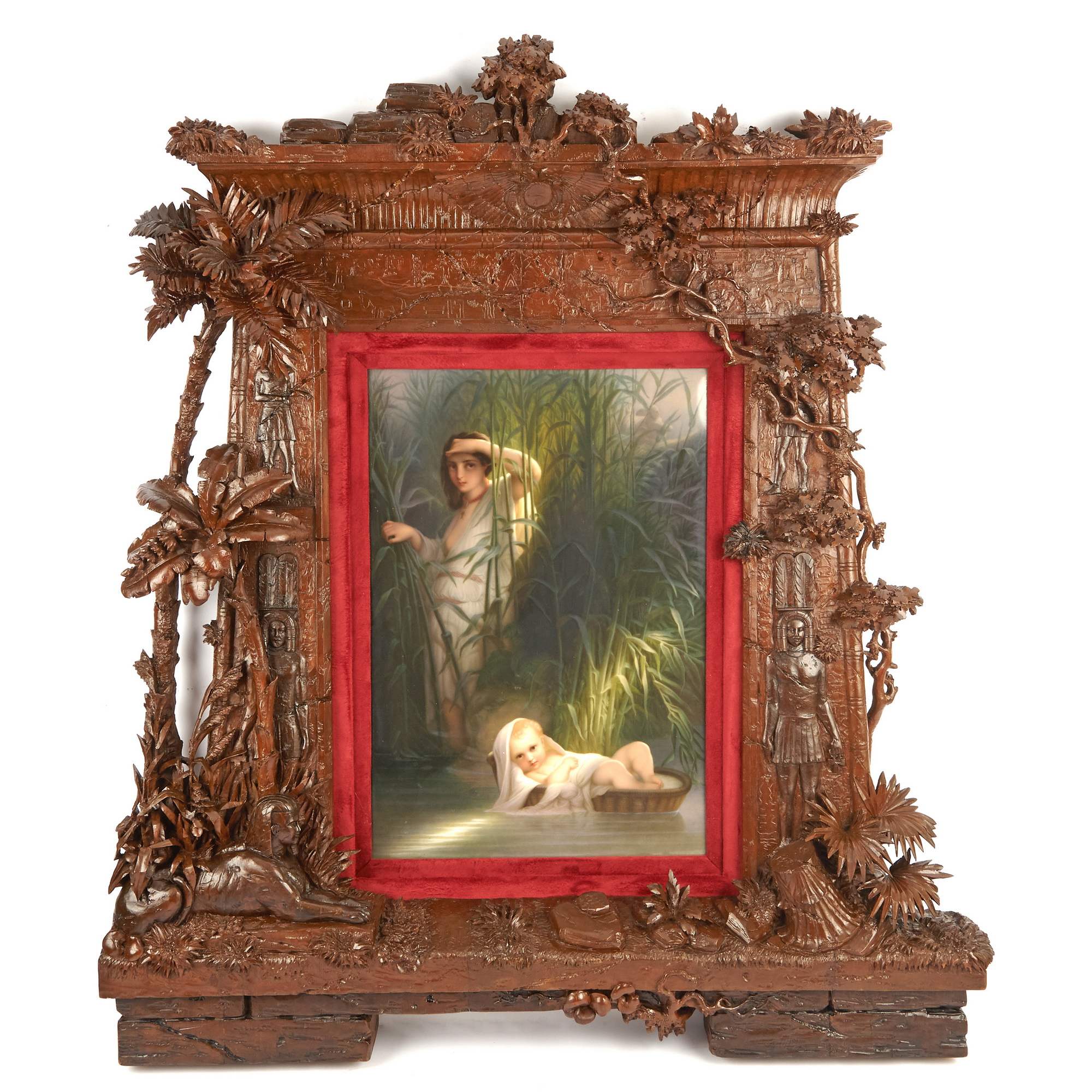 Великолепный, большой старинный фарфоровый пласт с изображением библейской сцены чудесного спасения Моисея. Впечатляет качество и красота росписи по фарфору, поражает воображение масштаб и уровень резьбы «родной» оригинальной рамы. Производство пластов с ручной росписью такого размера было делом крайне сложным и дорогим. Изящно выписаны главные персонажи, отчетливо передана легкость белоснежных одежд и пелены, выразительно трактованы лучи света. Отдельного внимания заслуживает деревянная резная рама искуснейшей работы, которая играет важную роль, связывая произведение с пространством и усиливая акцент на нем. При этом она обладает собственными изобразительными элементами, вдохновленными Древнеегипетской системой образов, что очень хорошо дополняет основной сюжет, передаваемый в росписи по фарфору. Подобные рамы, изготовленные для фарфорового пласта и обыгрывающие в декоре его мотив, являются редкостью даже для частных и музейных собраний. Более того, представленный ансамбль обладает еще и хорошей сохранностью, что делает его абсолютно уникальным в своем роде. Сюжет росписи хорошо известен - египетская принцесса находит в зарослях на реке Нил младенца Моисея. Эта сцена крайне востребована в искусстве, так как является отправной точкой в истории одного из известнейших людей мировой истории. Моисей - первый великий пророк, вождь еврейского народа, автор Первых пяти книг Библии. Через него сформировался Закон, ставший фундаментом религиозных традиций для иудаизма, христианства и даже ислама. В культуре иудаизма его фигура имеет центральное значение, так как Моисей передал своему народу Тору - основу всей еврейской жизни, права и вероучения. Образ Моисея как пророка, учителя и лидера стал символом верности Завету Бога, справедливости и ответственности. Представленный пласт исполнен на основе ныне утраченной картины одного из знаменитейших французских мастеров XIX века - Поля Делароша. Его работы очень ценятся в музейной практике, творчество Делароша занимает уникальное место между академизмом и романтизмом. Он произвел влияние на многих художников последующего поколения, а распространение его работ в виде гравюр сделало Делароша одним из самых узнаваемых художников Европы. Немаловажным будет упомянуть, что изготовление ровных фарфоровых пластов могли себе позволить лишь крупнейшие предприятия, так как для подобного сложного изделия требовалось безупречное качество фарфоровой массы. Несомненно, пласт «Моисей в камышах» изготовлен и расписан на Королевской Фарфоровой мануфактуре Берлина - одном из ведущих европейских центров производства фарфора, славившимся исключительным качеством материалов, изысканной росписью, что сделало мануфактуру символом возвышенного вкуса, королевского покровительства и исключительного ремесленного мастерства.
