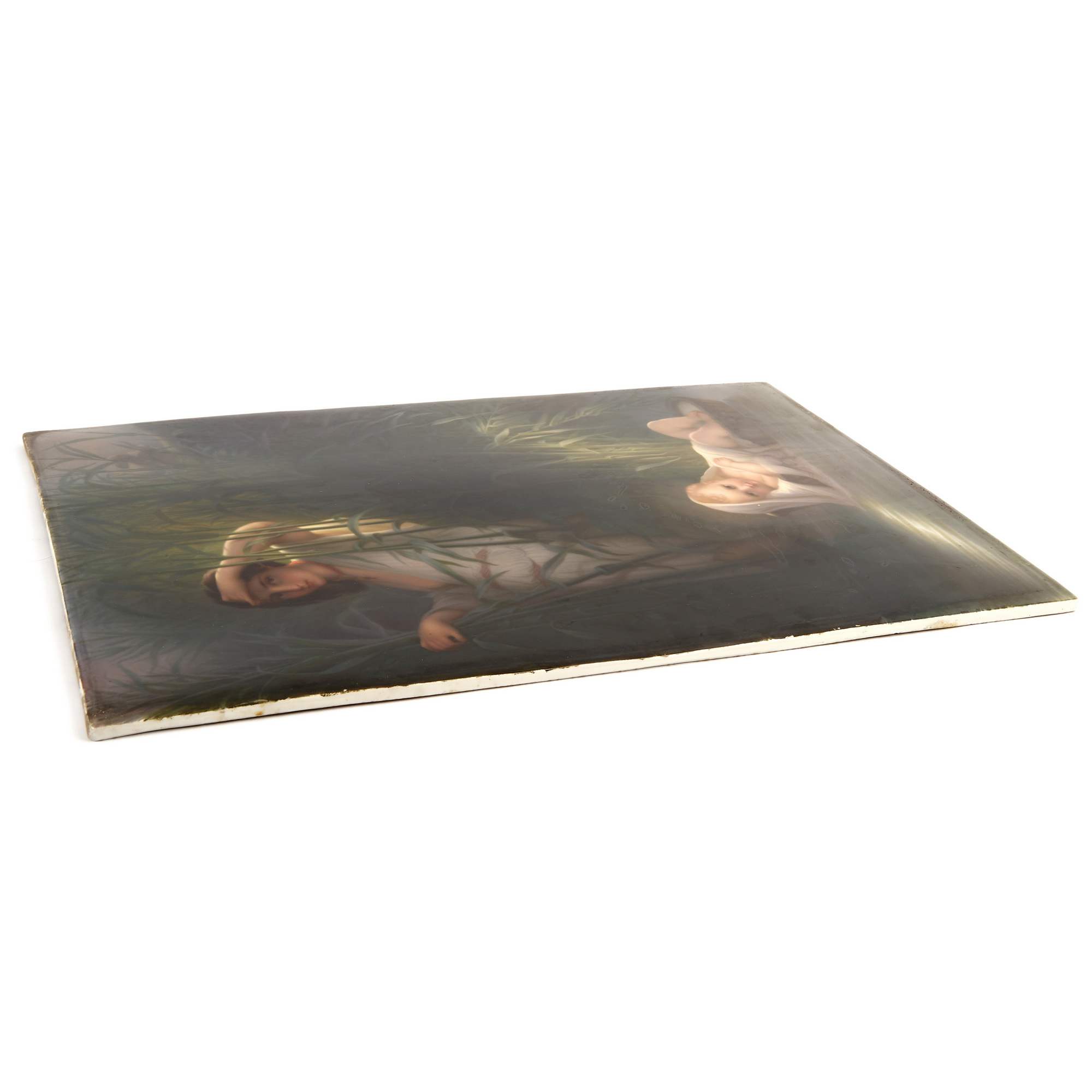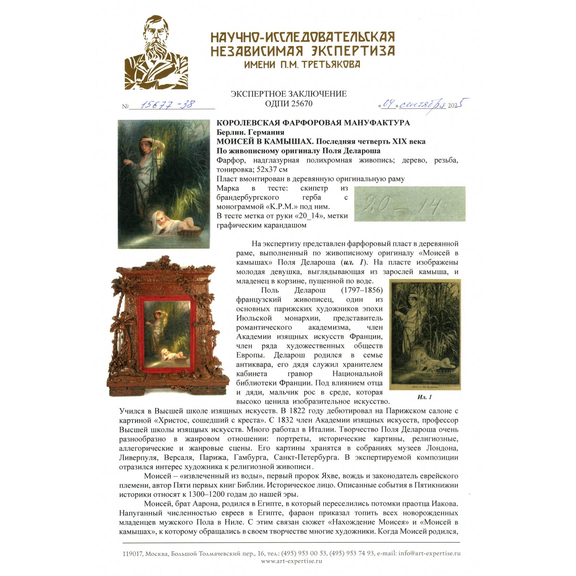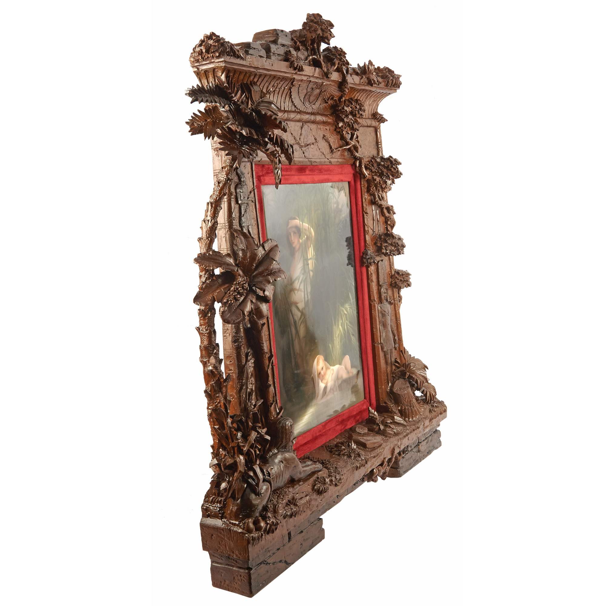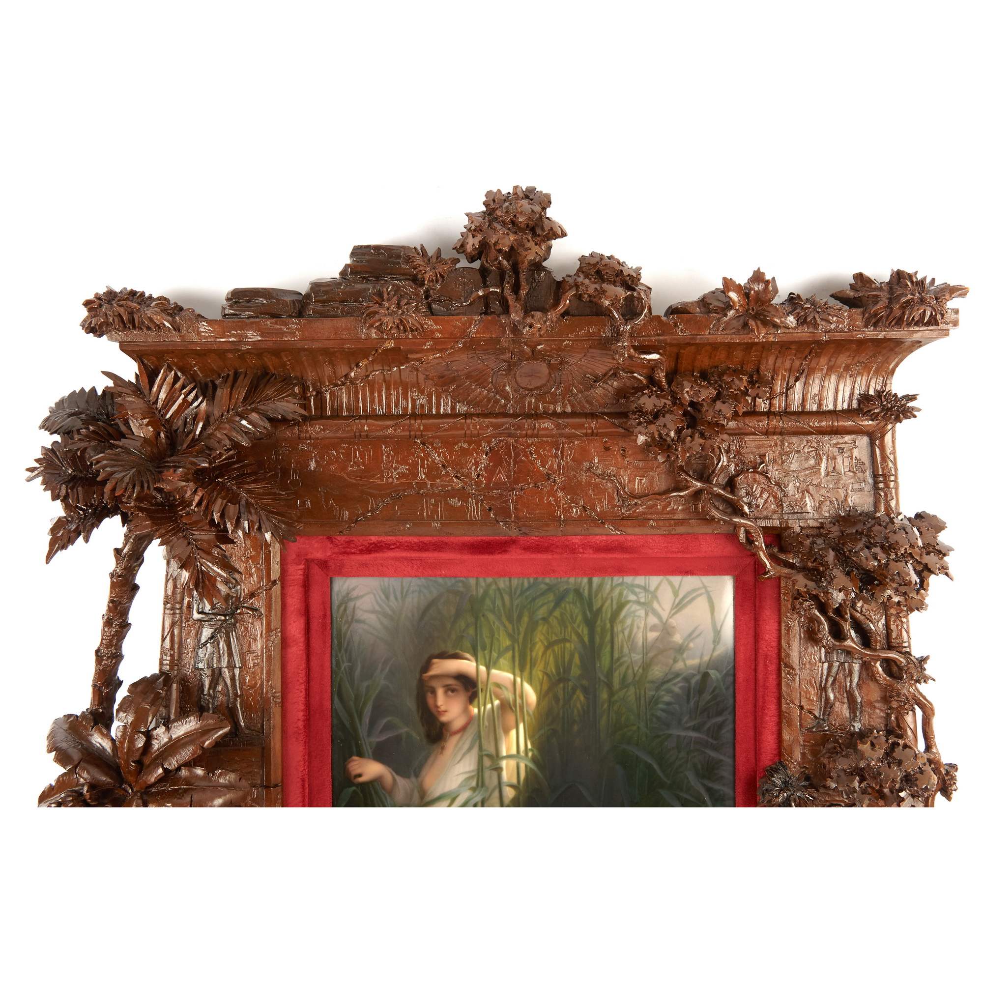 Великолепный, большой старинный фарфоровый пласт с изображением библейской сцены чудесного спасения Моисея. Впечатляет качество и красота росписи по фарфору, поражает воображение масштаб и уровень резьбы «родной» оригинальной рамы. Производство пластов с ручной росписью такого размера было делом крайне сложным и дорогим. Изящно выписаны главные персонажи, отчетливо передана легкость белоснежных одежд и пелены, выразительно трактованы лучи света. Отдельного внимания заслуживает деревянная резная рама искуснейшей работы, которая играет важную роль, связывая произведение с пространством и усиливая акцент на нем. При этом она обладает собственными изобразительными элементами, вдохновленными Древнеегипетской системой образов, что очень хорошо дополняет основной сюжет, передаваемый в росписи по фарфору. Подобные рамы, изготовленные для фарфорового пласта и обыгрывающие в декоре его мотив, являются редкостью даже для частных и музейных собраний. Более того, представленный ансамбль обладает еще и хорошей сохранностью, что делает его абсолютно уникальным в своем роде. Сюжет росписи хорошо известен - египетская принцесса находит в зарослях на реке Нил младенца Моисея. Эта сцена крайне востребована в искусстве, так как является отправной точкой в истории одного из известнейших людей мировой истории. Моисей - первый великий пророк, вождь еврейского народа, автор Первых пяти книг Библии. Через него сформировался Закон, ставший фундаментом религиозных традиций для иудаизма, христианства и даже ислама. В культуре иудаизма его фигура имеет центральное значение, так как Моисей передал своему народу Тору - основу всей еврейской жизни, права и вероучения. Образ Моисея как пророка, учителя и лидера стал символом верности Завету Бога, справедливости и ответственности. Представленный пласт исполнен на основе ныне утраченной картины одного из знаменитейших французских мастеров XIX века - Поля Делароша. Его работы очень ценятся в музейной практике, творчество Делароша занимает уникальное место между академизмом и романтизмом. Он произвел влияние на многих художников последующего поколения, а распространение его работ в виде гравюр сделало Делароша одним из самых узнаваемых художников Европы. Немаловажным будет упомянуть, что изготовление ровных фарфоровых пластов могли себе позволить лишь крупнейшие предприятия, так как для подобного сложного изделия требовалось безупречное качество фарфоровой массы. Несомненно, пласт «Моисей в камышах» изготовлен и расписан на Королевской Фарфоровой мануфактуре Берлина - одном из ведущих европейских центров производства фарфора, славившимся исключительным качеством материалов, изысканной росписью, что сделало мануфактуру символом возвышенного вкуса, королевского покровительства и исключительного ремесленного мастерства.