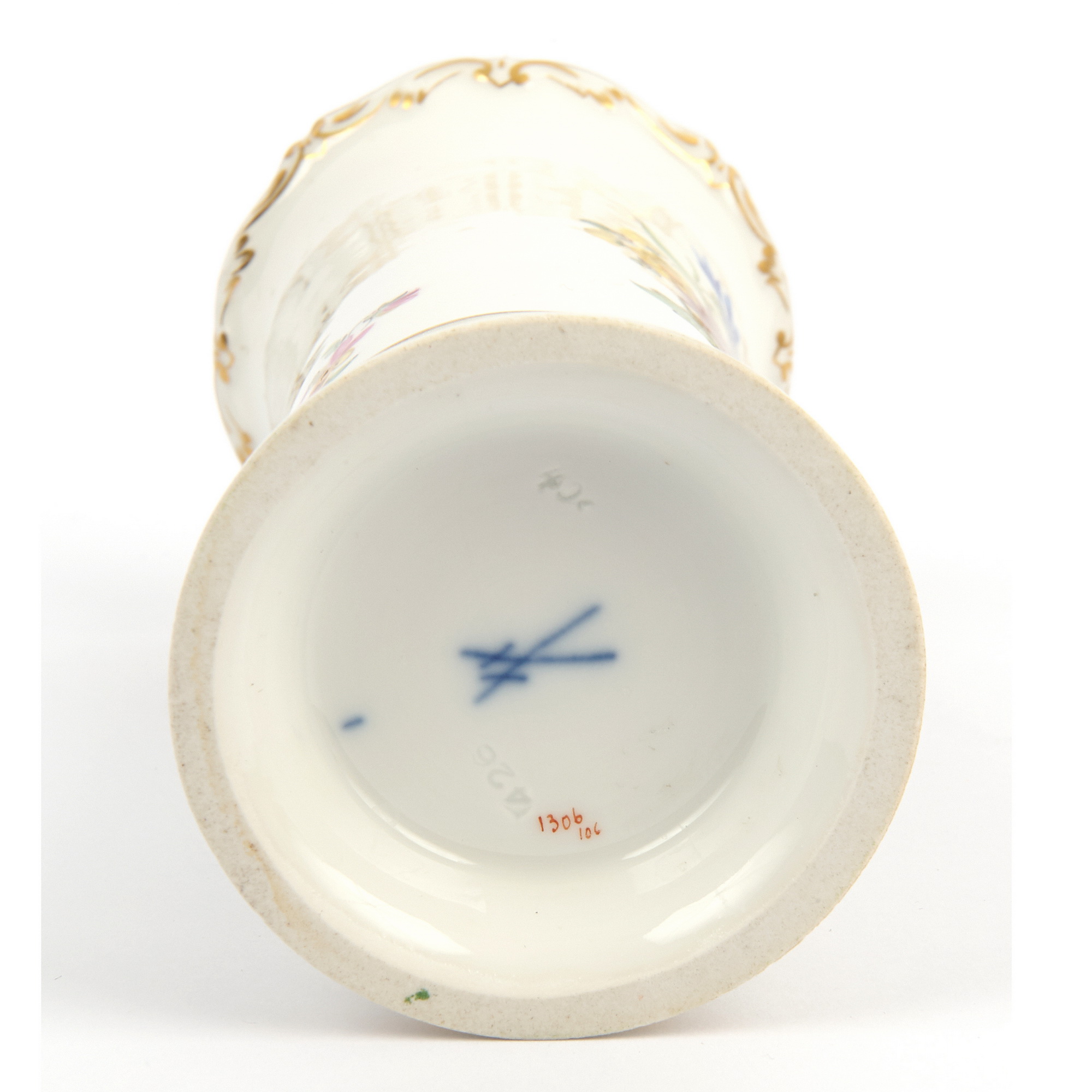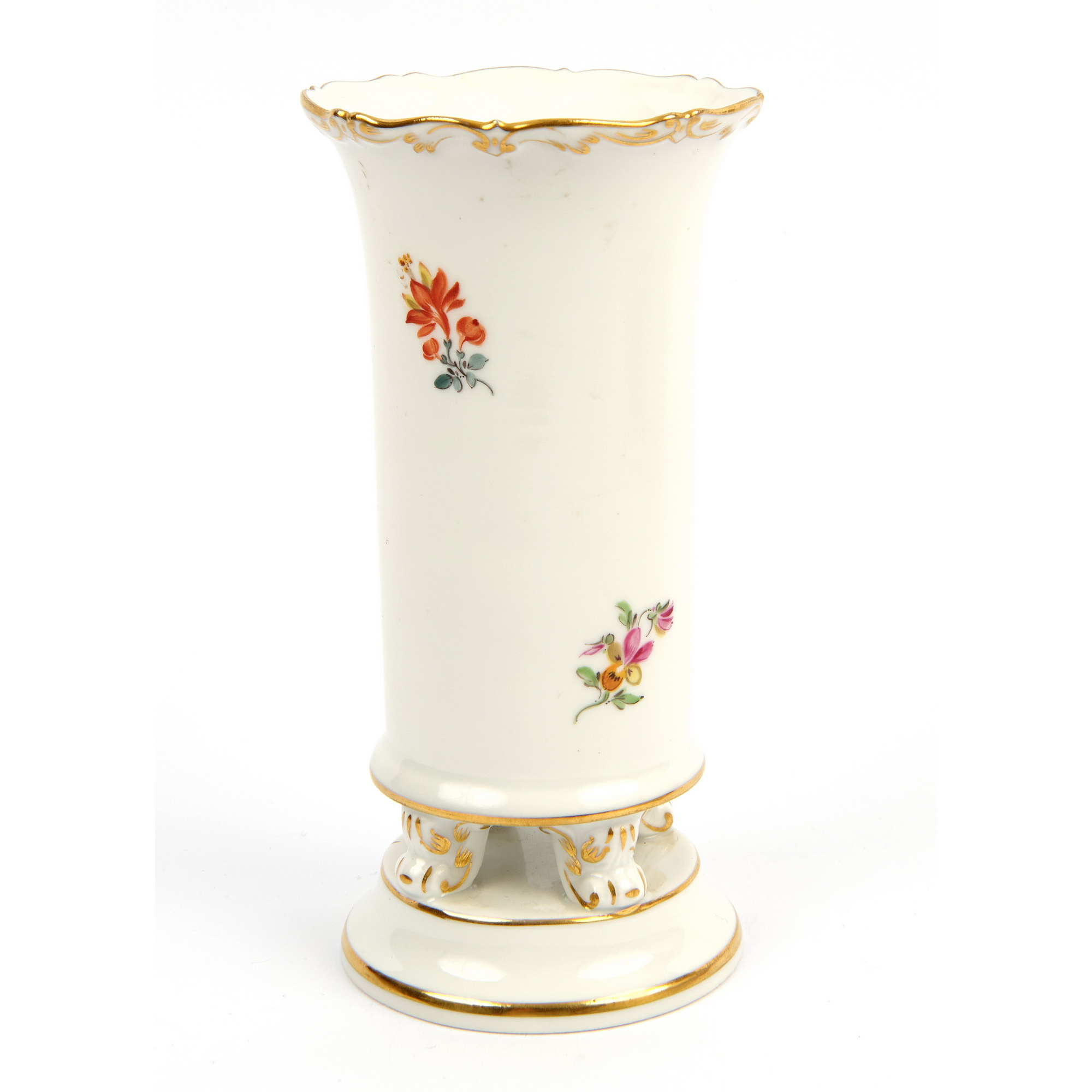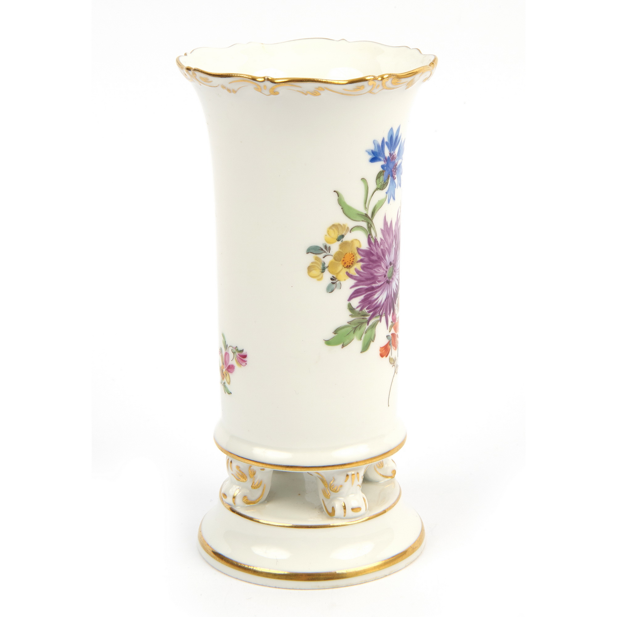 Замечательная вазочка для цветов с росписью «Цветы полевые». Изготовлена на самой известной европейской фарфоровой мануфактуре MEISSEN. Мейссен - колыбель европейского фарфора. Ручная роспись. Роспись золотом. Хорошая сохранность.