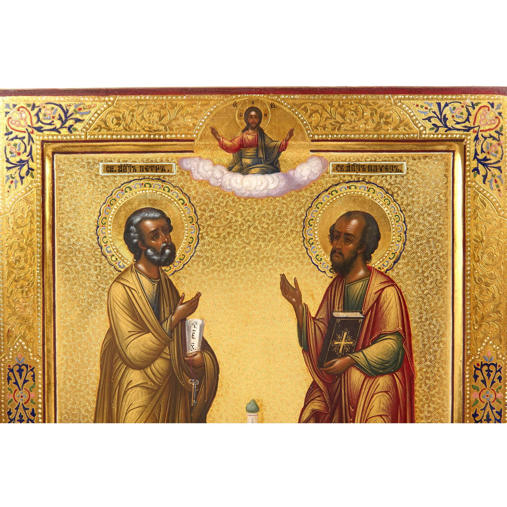 Великолепная старинная икона первоверховных апостолов Петра и Павла. Образ написан на высочайшем профессиональном уровне, в письме сочетаются академические и традиционные черты. В XIX веке такой стиль был очень популярен, имел свое название - «фрязь». Личное прописано исключительно качественно в сложной технике отборки, одеяния апостолов обладают умелой моделировкой. Золотой фон дополнен красивым цированным орнаментом, создающим эффект мерцания. Решение полей также весьма изысканно, углы и середины сторон украшены изящными виньетками. Цветовая гамма отличается гармоничностью и продуманностью. Мастер-иконописец, исполнивший этот образ, обладал безупречным вкусом и большим декоративным даром. Работал он в одной из палехских мастерских.