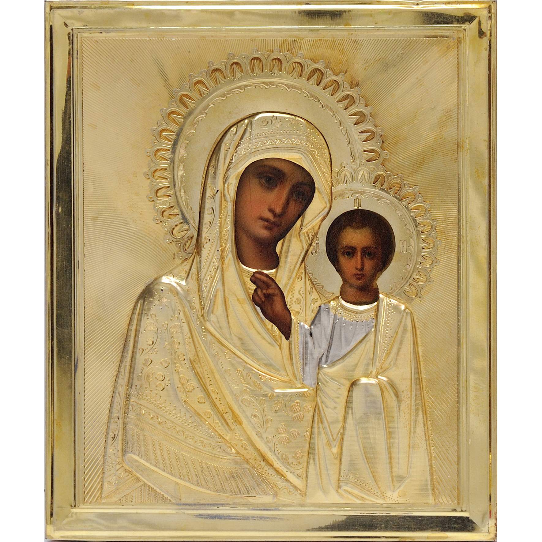 Замечательные парные иконы («Венчальная пара») Господа Вседержителя и Богоматери Казанской. Красивое масляное письмо в академической манере сочетается с изумительными серебряными окладами. Одеяния украшены изящными растительными узорами, венцы окаймлены тонким просечным орнаментом. В одеждах сочетаются золоченые и серебряные поверхности, что добавляет образам выразительности. Фон у обеих икон решен в виде исходящих лучей, изображающих сияние божественного света. Исполнены оклады в столичной мастерской Николая Филипповича Тараброва. Ее произведения хранятся в государственных музейных собраниях, таких как ГИМ, Музей-заповедник «Петергоф», и многих других, а также находятся в крупных частных коллекциях.