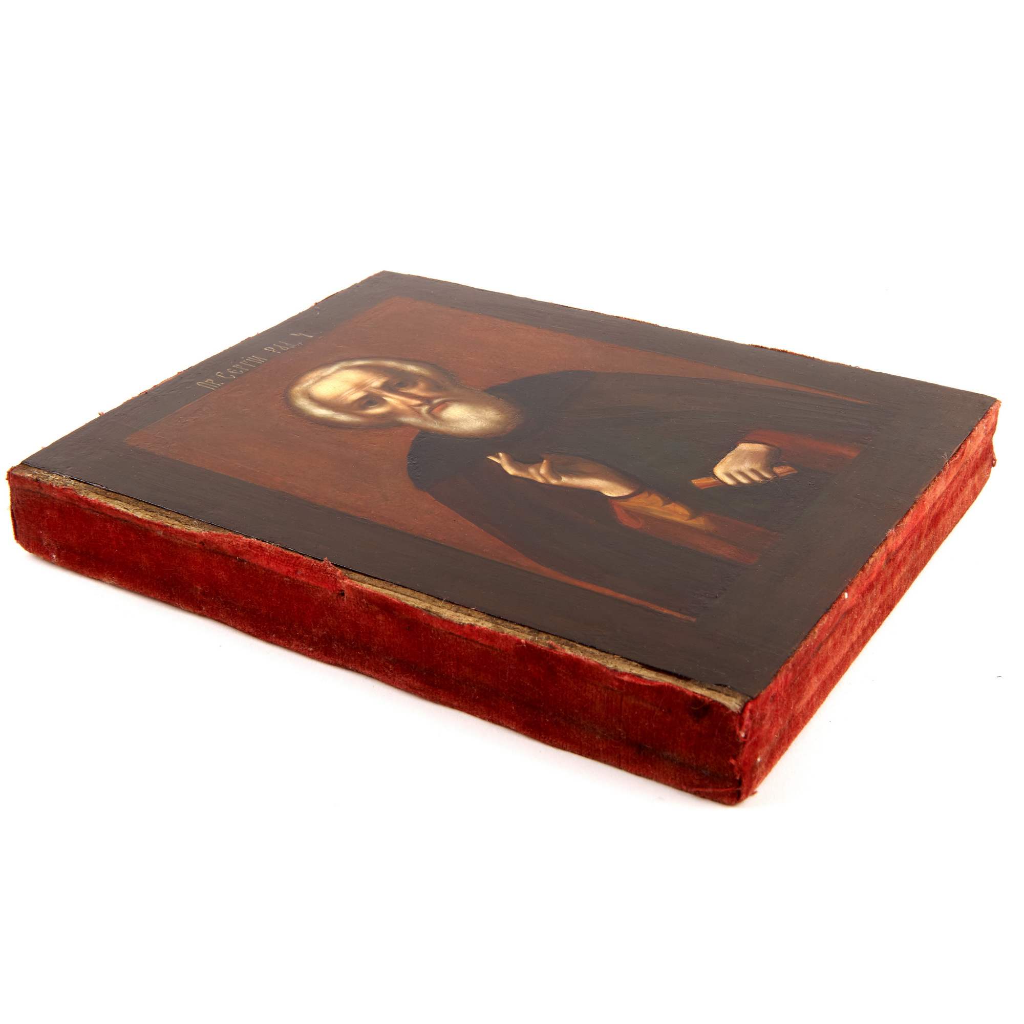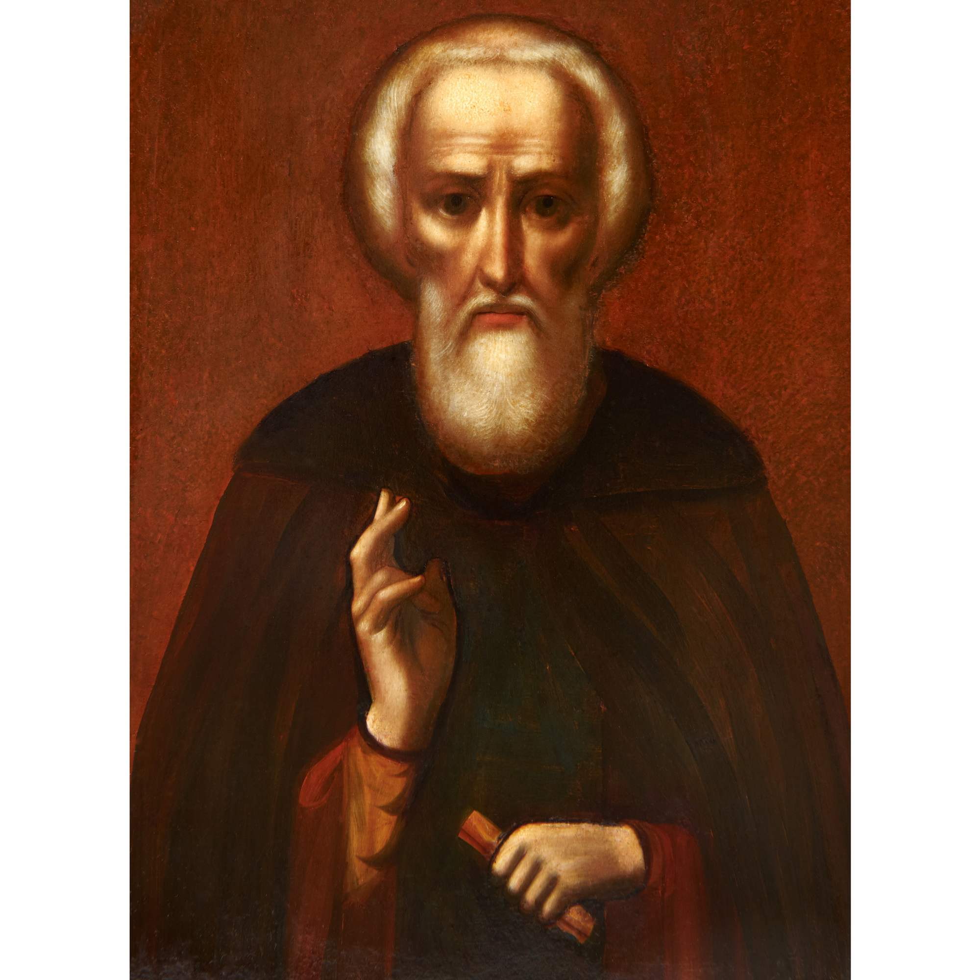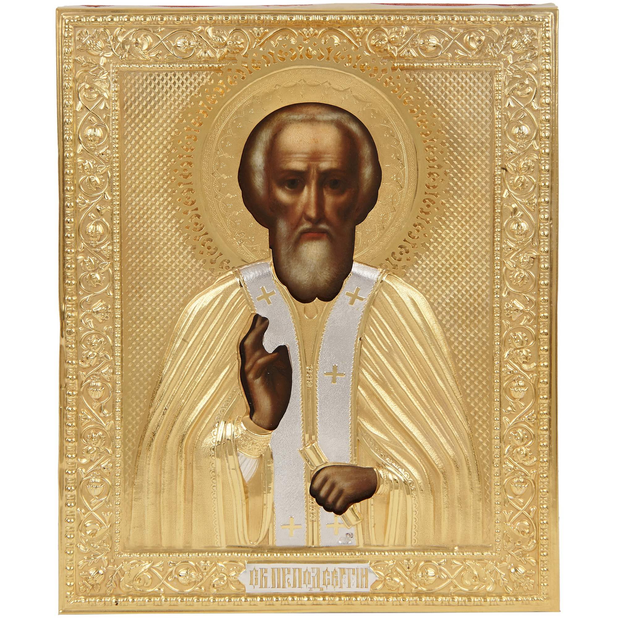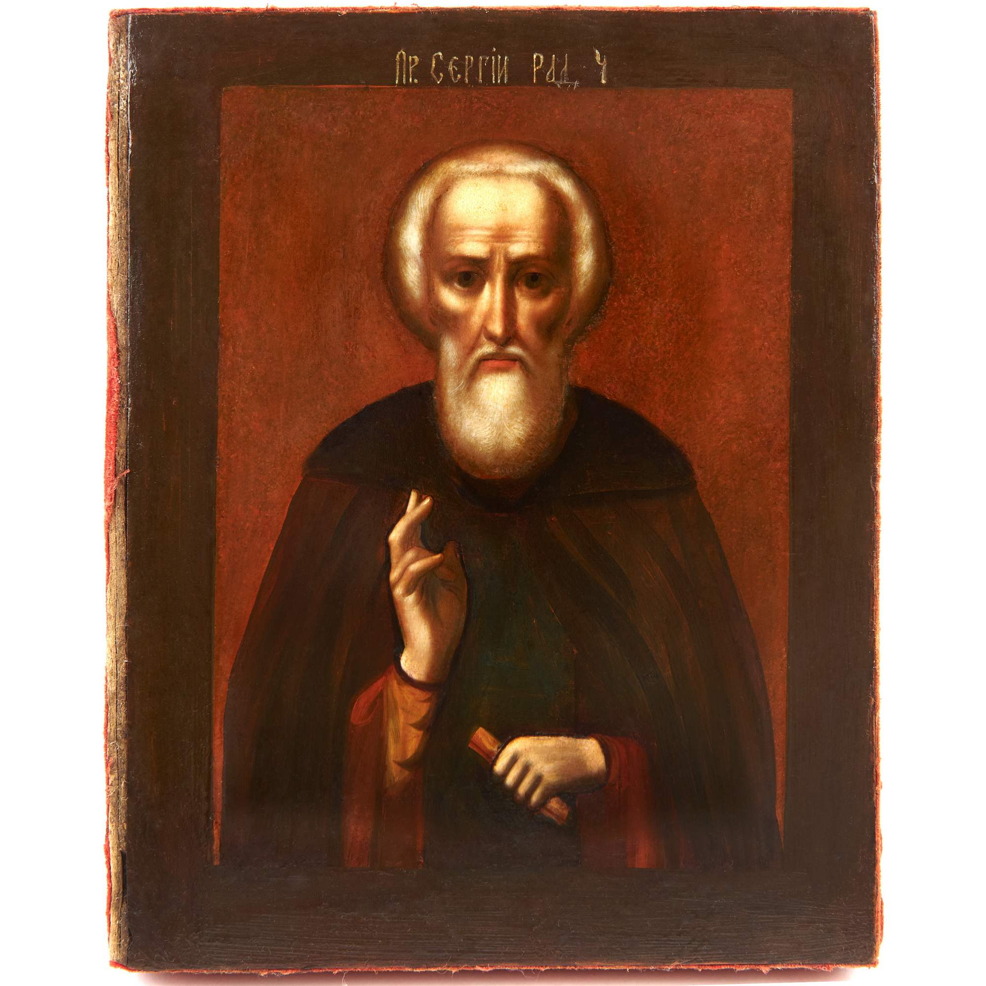 Великолепная икона Преподобного Сергия Радонежского в серебряном окладе, помещенная в изумительный старинный резной деревянный киот хорошей сохранности. Красивое академическое письмо, личное с правильными чертами и мастерски усиленная объемность изображения за счет обильной пробелки. Оклад также выполнен на хорошем профессиональном уровне. Умело применяемые мастером техники гармонично соединяются в общем декоративном ансамбле. Одежды святого исполнены в высоком рельефе, с отчетливой передачей пластики складок и фактуры тканей. Накладной венец декорирован изящным просечным орнаментом. Интересно решен узорный фон, украшенными искусно сделанным рельефом из листьев и бутонов. Стоит отметить, что светлые золочение и серебрение оклада создают выразительный контраст с темным деревом киота, что выглядит очень эффектно, подчеркивая будто бы светоносный образ. Сам оклад изготовлен на фирме Торгового дома С. Г. Галкина и Ко. Их фирма была хорошо известна в Москве, составляла конкуренцию крупным ювелирным предприятиям Москвы и Санкт-Петербурга. Продукция фирмы была удостоена медали на Всероссийской художественно-промышленной выставке 1896 года в Нижнем Новгороде, а ныне ее изделия находятся в крупнейших музейных собраниях, например в собрании Музеев Московского Кремля.