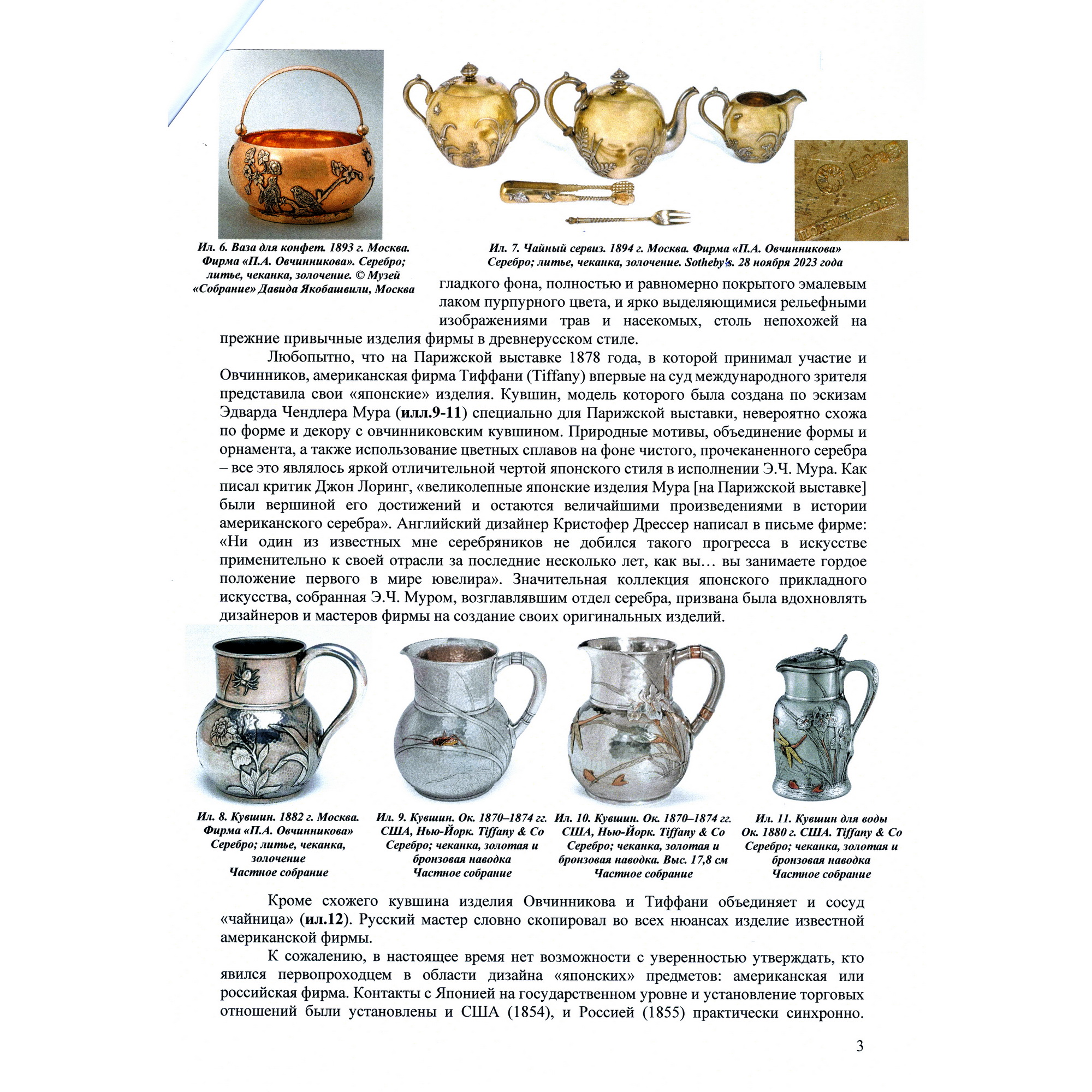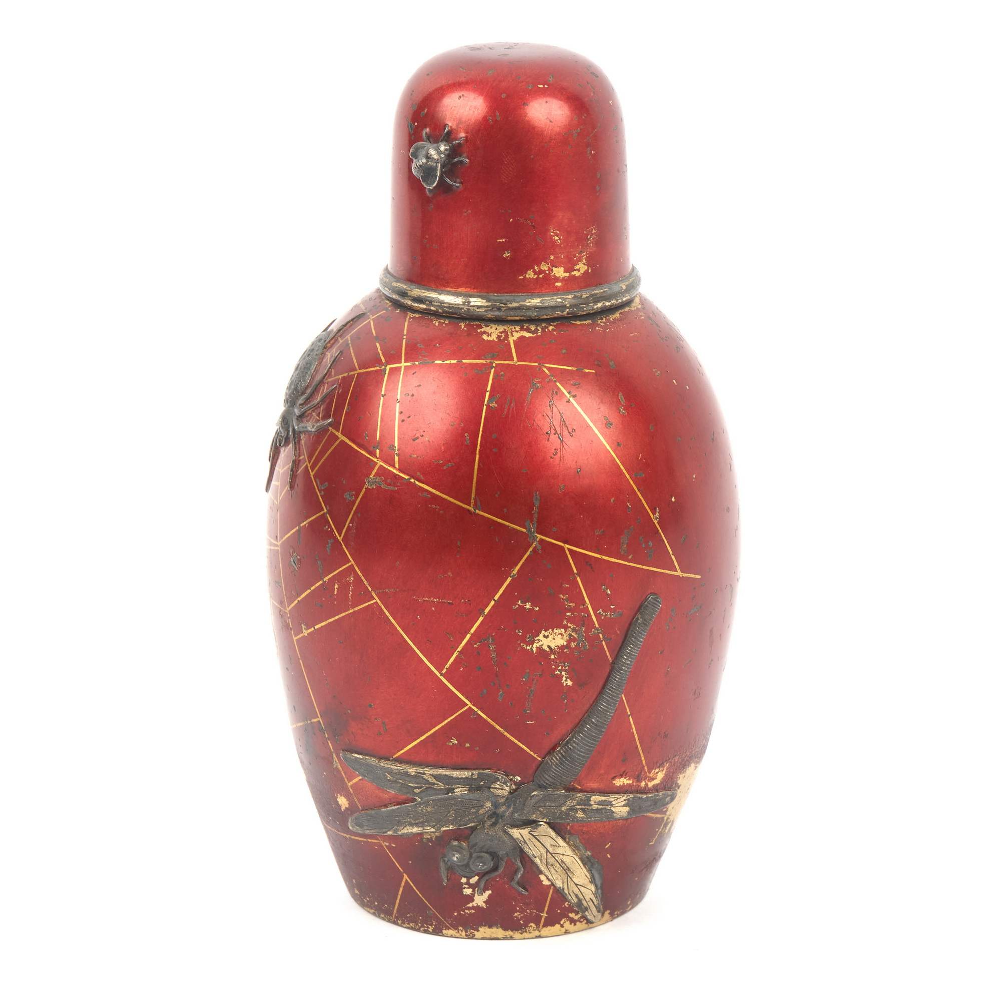 Изумительная чайница работы знаменитой фирмы П. Овчинникова с подлинными клеймами. Великолепный декор изделия ориентирован на китайско-японское искусство. На поверхности, покрытой ярко-красным эмалевым лаком, размещены чеканные изображения водных растений, стрекозы, попавшей сети паука, который размещен ближе к плечикам сосуда в центре золотой паутины. Крышка также украшена эмалевым лаком, чеканным листом японского клена и мушкой. Поражает как сложность задумки, так и отличное мастерство ее исполнения. Линии паутины образованы благодаря фрагментарному заполнению фона эмалевым лаком. Чеканные образы проработаны до мельчайших деталей, их цвет выразительно контрастирует с яркой поверхностью. Изготовлена эта замечательная чайница на знаменитой фабрике Павла Акимовича Овчинникова, чья продукция славилась очень высоким качеством. Произведения фирмы участвовали на всероссийских и всемирных выставках, отмечались высшими наградами, утверждая первенство русских ювелиров. Являясь исполнителями крупных государственных заказов для императорского двора, мастера фирмы во многом стали законодателями моды, зачастую не только продолжая сложившиеся традиции, но и формируя новые тенденции серебряного и золотого дела второй половины XIX – начала XX века. Одним из востребованных и популярных веяний в конце XIX века стало увлечение искусством Японии в частности и Дальнего Востока в целом. Предметы, выполненные фирмой П. Овчинникова в схожей с представленной чайницей манере можно увидеть в собраниях Государственного Исторического музея, Музеев Московского Кремля, в крупных частных собраниях. Однако у данной чайницы есть уникальная черта - дарственная надпись «От А и О Овчинниковых». У Павла Акимовича было четыре сына. Один из них - Александр Павлович - заведовал московским отделением фирмы и магазином в Москве. Тот факт, что на подлинном клейме есть московский герб, позволяет сделать вывод, что эта великолепная чайница была подарена некоему лицу одним из сыновей знаменитого ювелира - одним из наследных владельцев фирмы, продолживших дело Павла Акимовича Овчинникова, ничуть не преуменьшив его замечательное наследие. Инициал «О» вероятно принадлежал супруге Александра Павловича Овчинникова, подробной информации о ней на сегодняшний день установить не удалось.