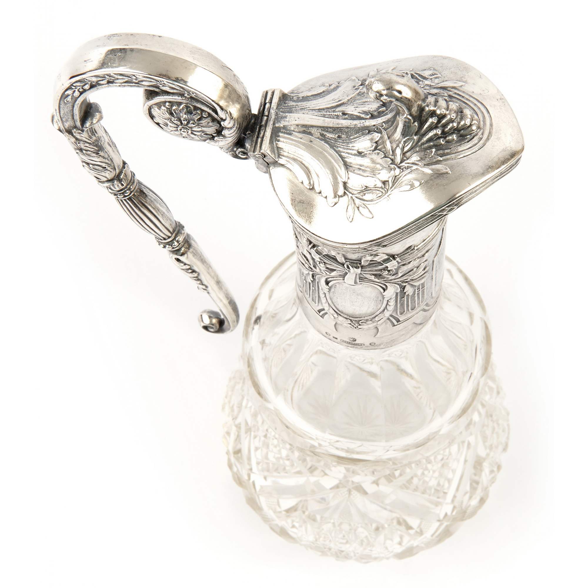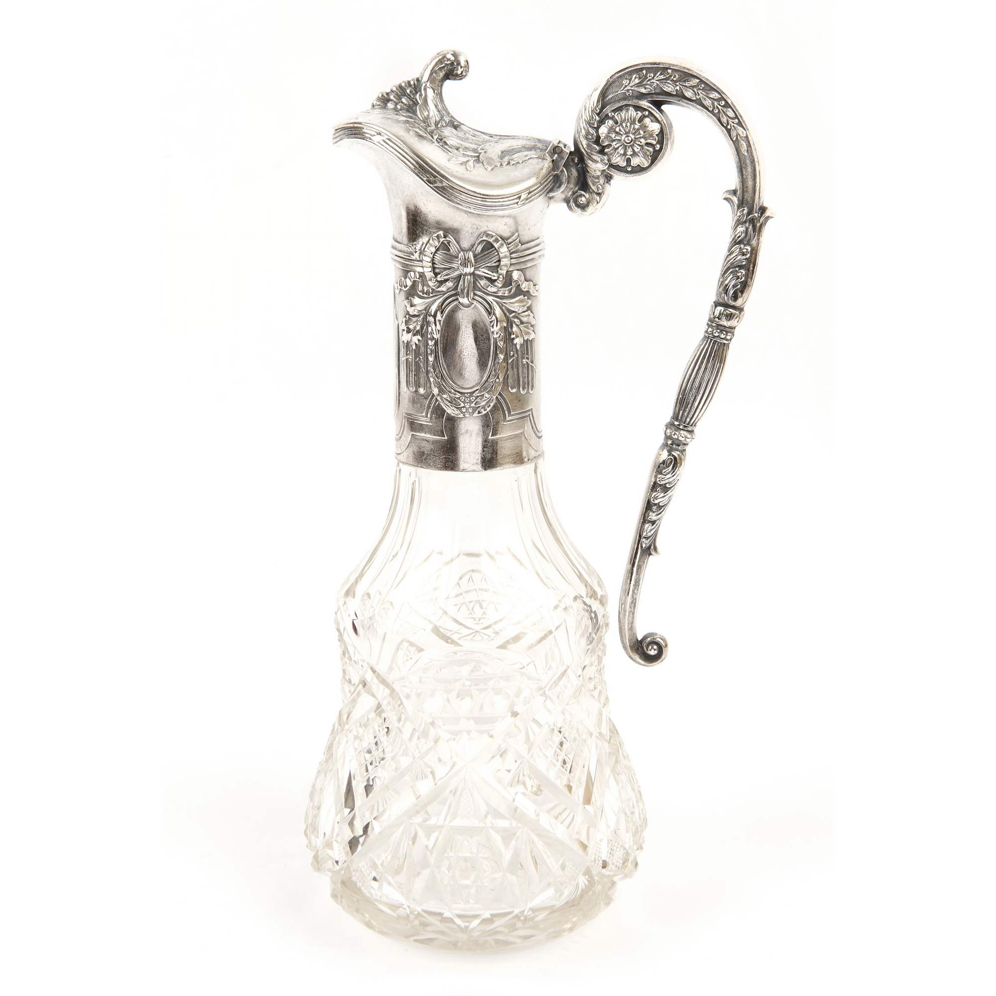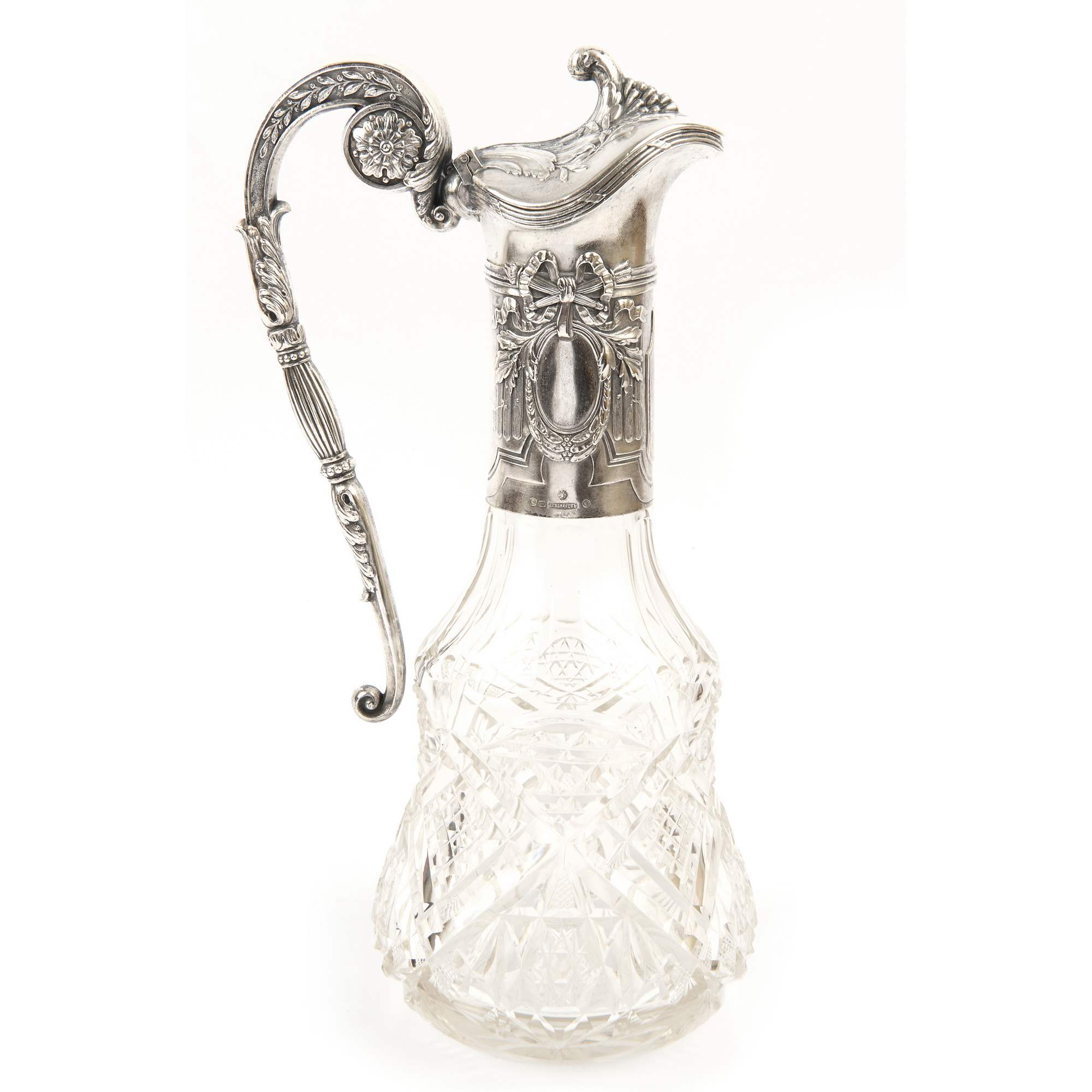 Великолепный, изящный графин для вина. Редкий коллекционный предмет. Частично позолоченная оправа охватывает верхнюю часть хрустального гладкого горла графина. Оправа горла украшена по краю полосой профилированного орнамента; ниже - более широкая полоса, на которой на пышных бантах подвешены два овальных медальона, декорированных ликторскими пучками, дубовыми листьями и лавровыми гирляндами. Центральная часть медальонов гладкая. Серебряная подъемная крышка на шарнире повторяет очертания слива графина; она дополнена литым украшением в виде стилизованного бутона. Серебряная ручка оправы отличается усложненной формой и особой нарядностью: в верхней и нижней части имеет форму завитка, по борту - лавровая гирлянда, по всей протяженности - рельефные листья аканта, мотивы «жемчужника»; в центральной части ручки помещена балясина с рельефными вертикальными полосами. В целом оправа хрустального графина изготовлена в стиле «неоампир», отличается элегантностью, сдержанностью в использовании декоративных элементов, гармоничностью сочетания с резным хрусталем грушевидного тулова.