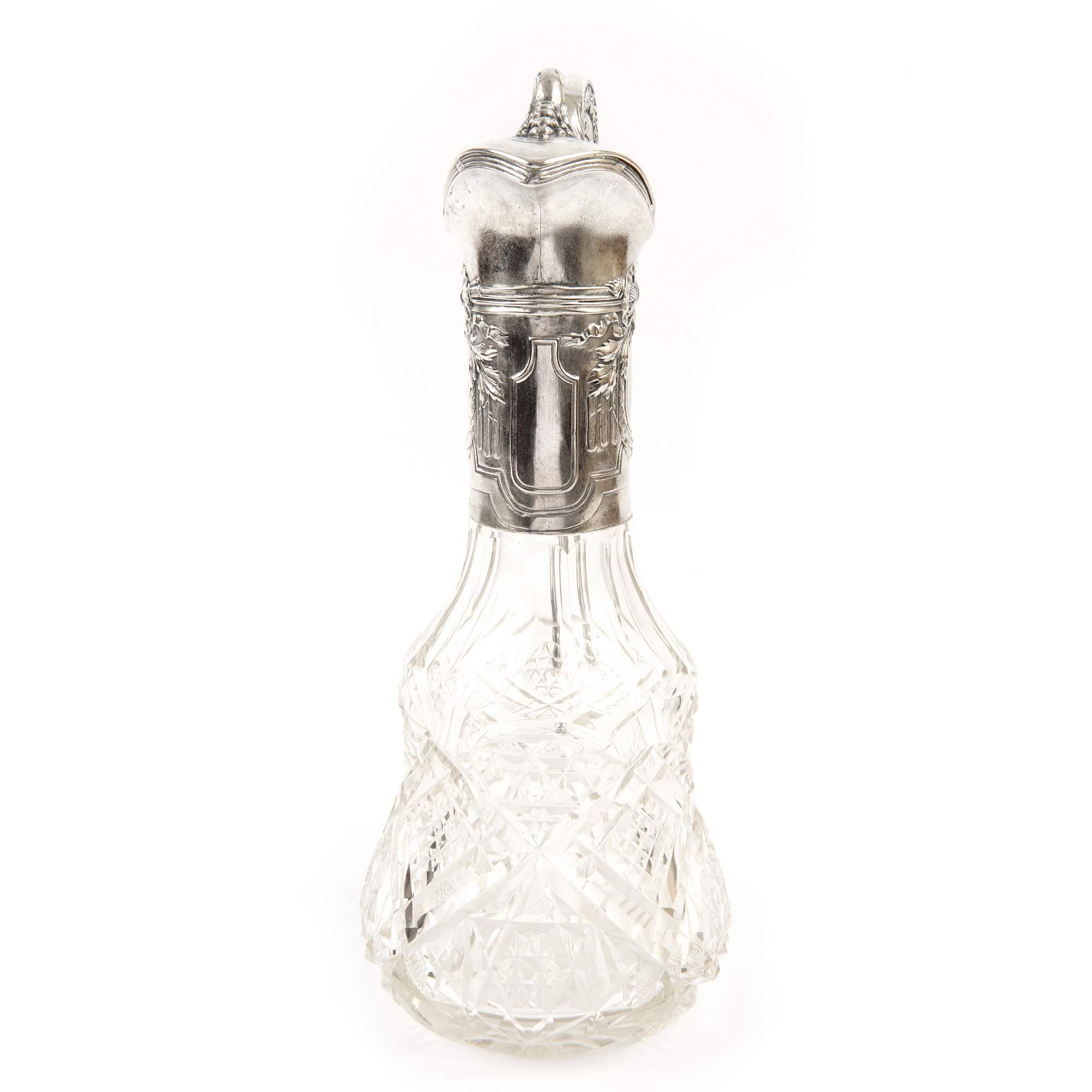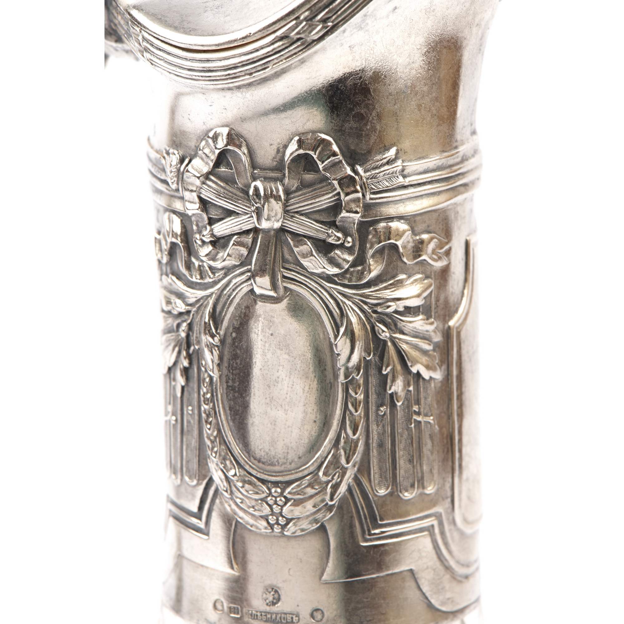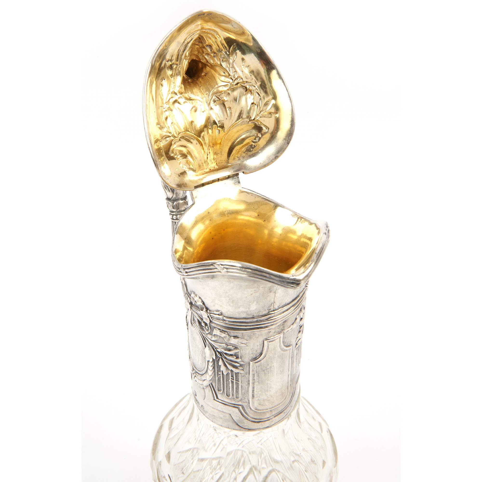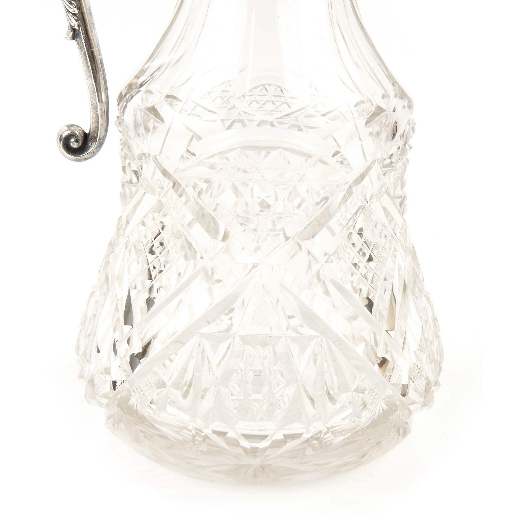 Великолепный, изящный графин для вина. Редкий коллекционный предмет. Частично позолоченная оправа охватывает верхнюю часть хрустального гладкого горла графина. Оправа горла украшена по краю полосой профилированного орнамента; ниже - более широкая полоса, на которой на пышных бантах подвешены два овальных медальона, декорированных ликторскими пучками, дубовыми листьями и лавровыми гирляндами. Центральная часть медальонов гладкая. Серебряная подъемная крышка на шарнире повторяет очертания слива графина; она дополнена литым украшением в виде стилизованного бутона. Серебряная ручка оправы отличается усложненной формой и особой нарядностью: в верхней и нижней части имеет форму завитка, по борту - лавровая гирлянда, по всей протяженности - рельефные листья аканта, мотивы «жемчужника»; в центральной части ручки помещена балясина с рельефными вертикальными полосами. В целом оправа хрустального графина изготовлена в стиле «неоампир», отличается элегантностью, сдержанностью в использовании декоративных элементов, гармоничностью сочетания с резным хрусталем грушевидного тулова.