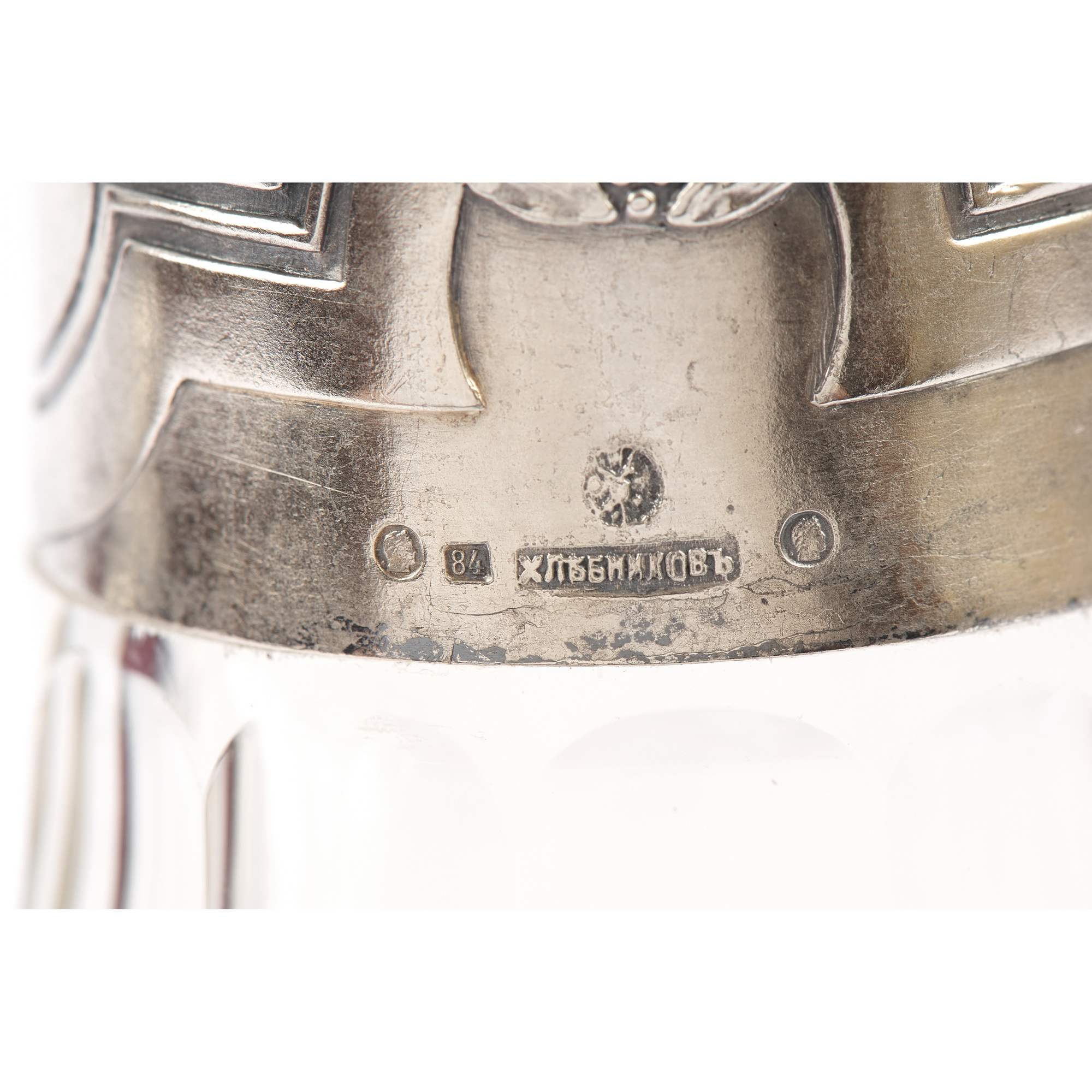 Клейма: 1. ХЛЪБНИКОВЪ в прямоугольном щитке, над клеймом - знак придворного поставщика. Это звание фирма получила 1881 г. Клеймо «ХЛЪБНИКОВЪ» - клеймо одной из лучших русских ювелирных фирм, основанной Иваном Петровичем Хлебниковым (1819-1881гг.), работавшим в Москве и Санкт-Петербурге. Многочисленные изделия этой фирмы находятся в крупнейших музейных и частных собраниях, пользуются заслуженным вниманием на российских и зарубежных аукционах. Фирма неоднократный победитель на всероссийских и международных выставках. Ее ассортимент отличался большим разнообразием, значительное место в нем отводилось стеклянным и хрустальным изделиям в серебряных оправах. 2. Головка в кокошнике, повернутая вправо в круге с точкой в нижней части клейма слева -удостоверяющее клеймо Московского пробирного управления для серебряных изделий с 1908 г. 3. 84 в прямоугольном щитке - числовое обозначение пробы серебра в золотниках. Совокупность клейм и стилистических особенностей позволяет заключить, что представленный на визуальное изучение хрустальный графин в серебряной, частично позолоченной оправе изготовлен в Москве в 1908-1916 гг. мастерами фирмы «ХЛЪБНИКОВЪ». Данный памятник имеет историко-культурное , музейное значение.