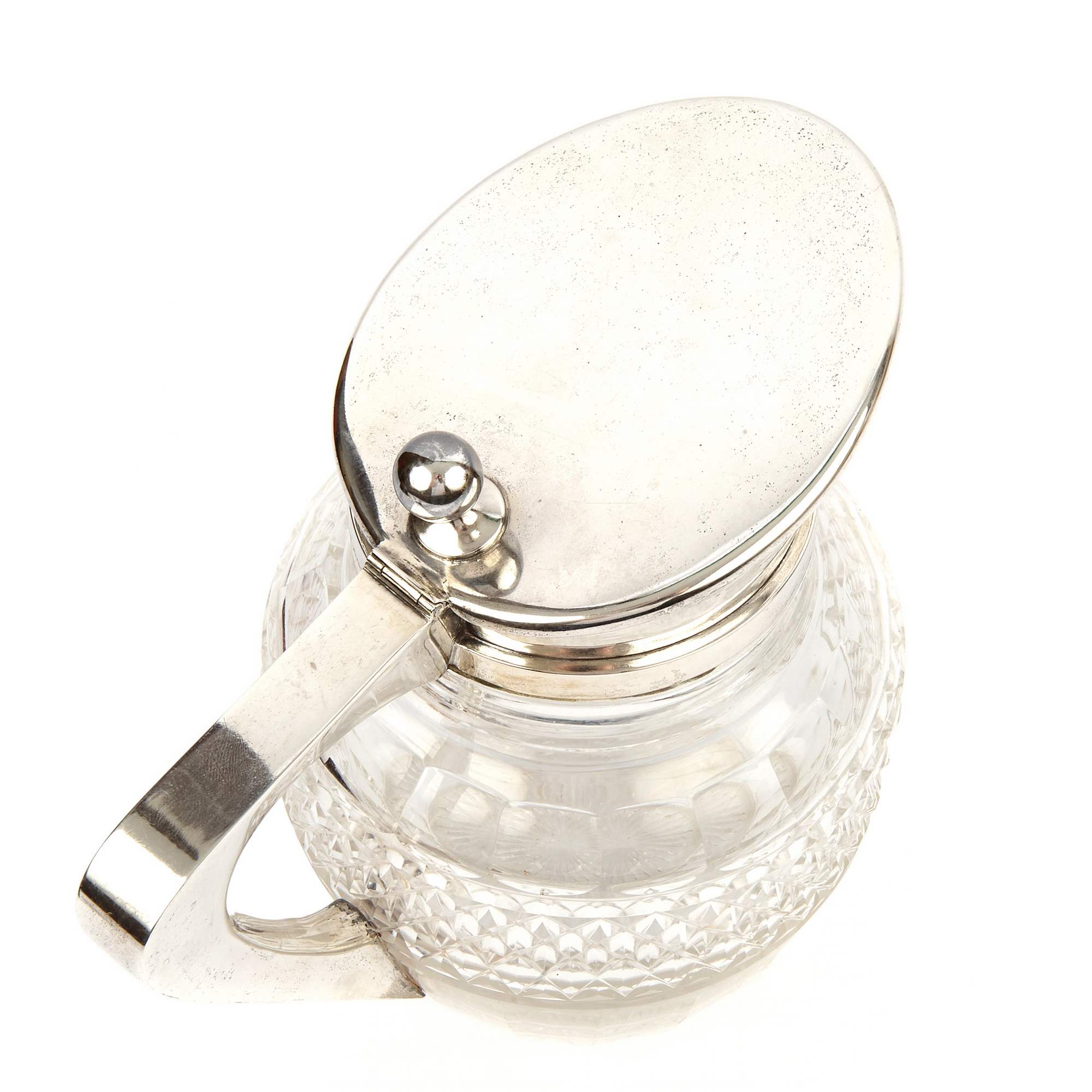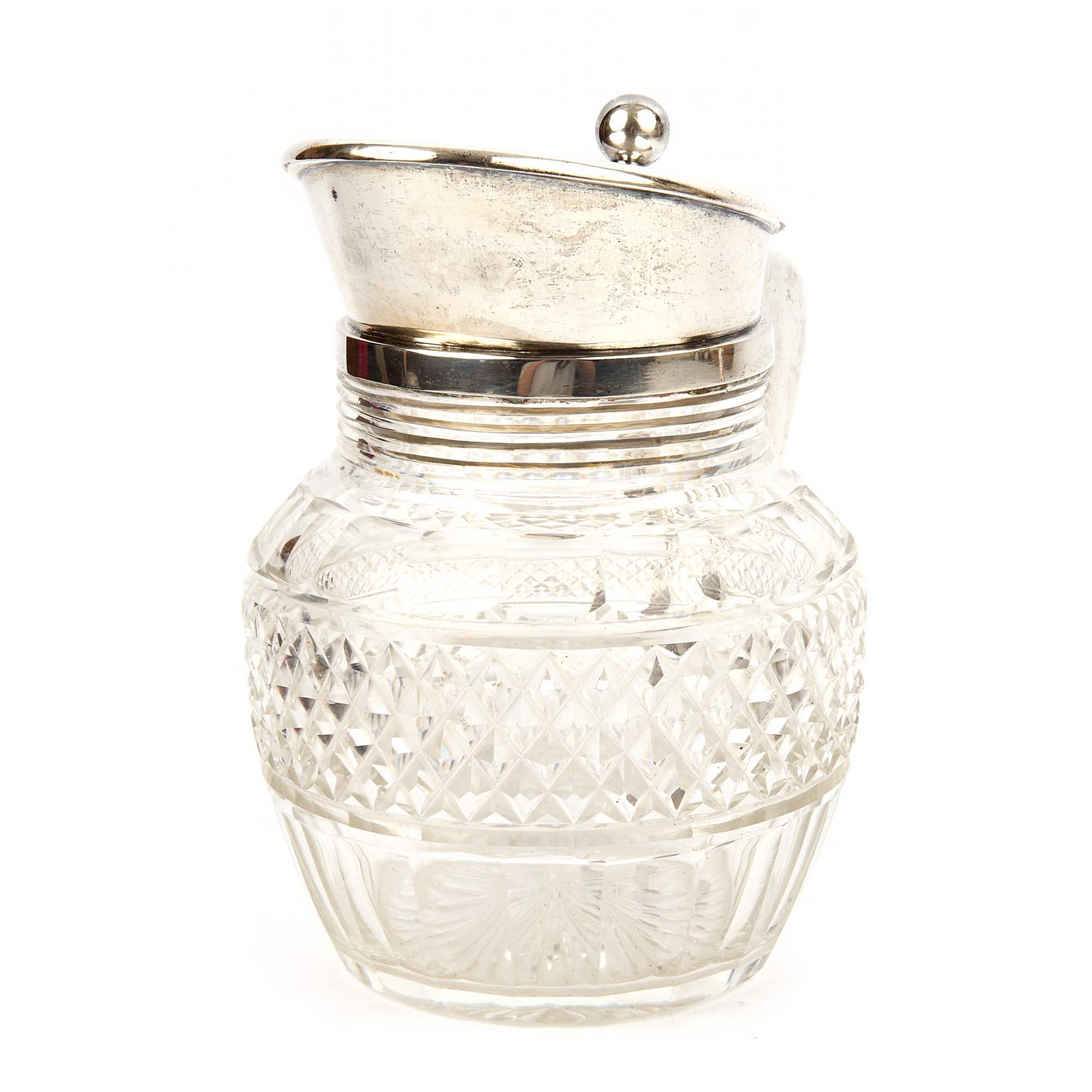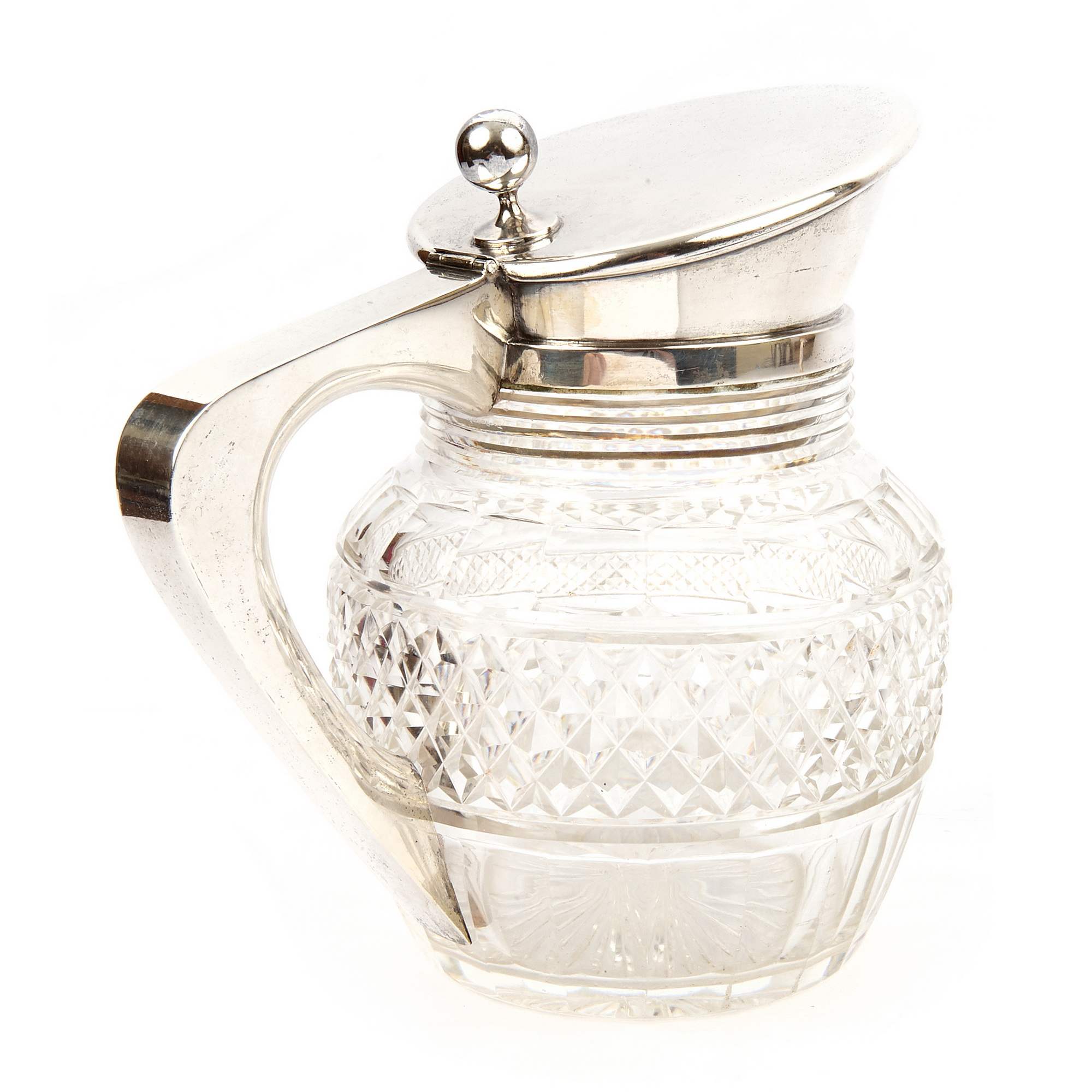 Замечательный старинный графин. Исполнен мастерами знаменитой берлинской фирмы Friedlander, работавшими на исключительно высоком художественном и техническом уровне, отдавая приоритет высококлассной ручной работе. Хрусталь отличается прекрасной оригинальной формой и великолепной огранкой с «алмазной гранью» переливающейся на свету всеми цветами радуги. Тулово из хрусталя украшено массивной оправой из драгоценного серебра.