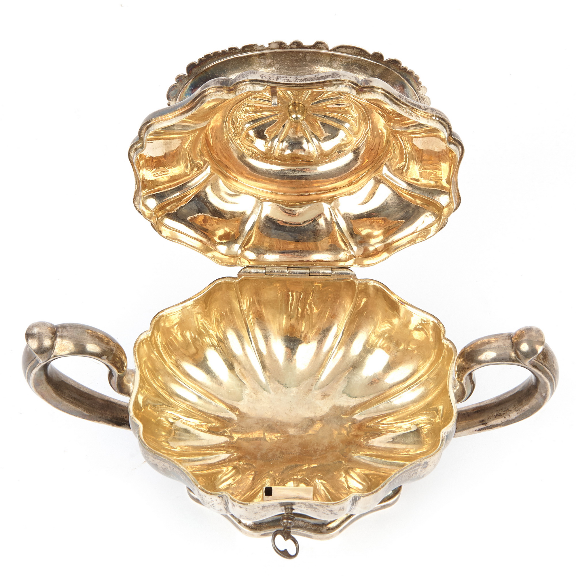 Замечательный старинный предмет, большая сахарница с замочком. Работа петербуржского мастера Окерблома Густава Мангуса. Обращает на себя внимание оригинальная конструкция сахарницы, открывается она не на уровне визуальной крышки, а в верхней части тулова. В те далекие времена конфеты и другие вкусняшки закрывались под замок и выдавались по поводу. Антиквариат. Очень хорошая сохранность. Сохранилось «родное» золочение, красивая оригинальная ручка из перламутра.