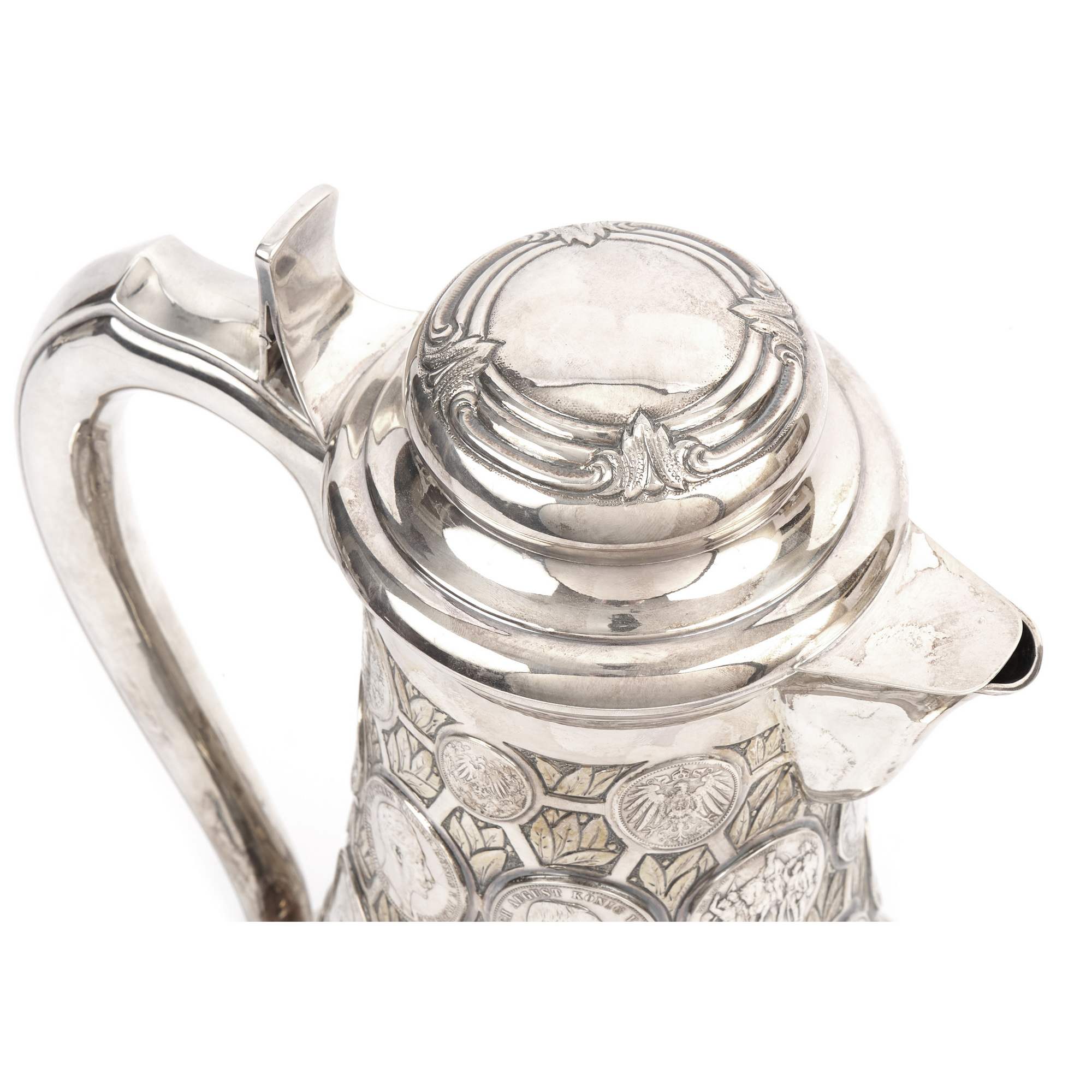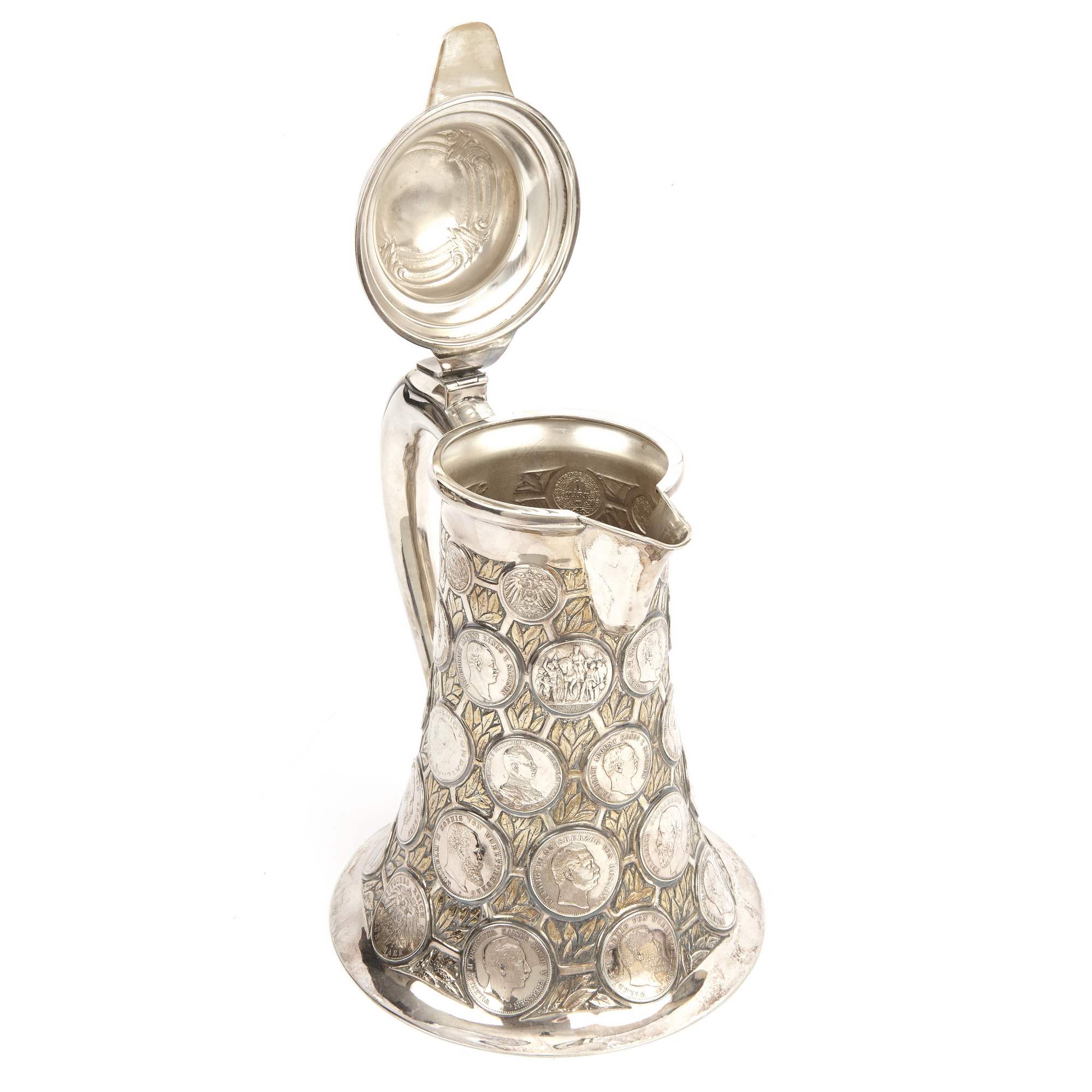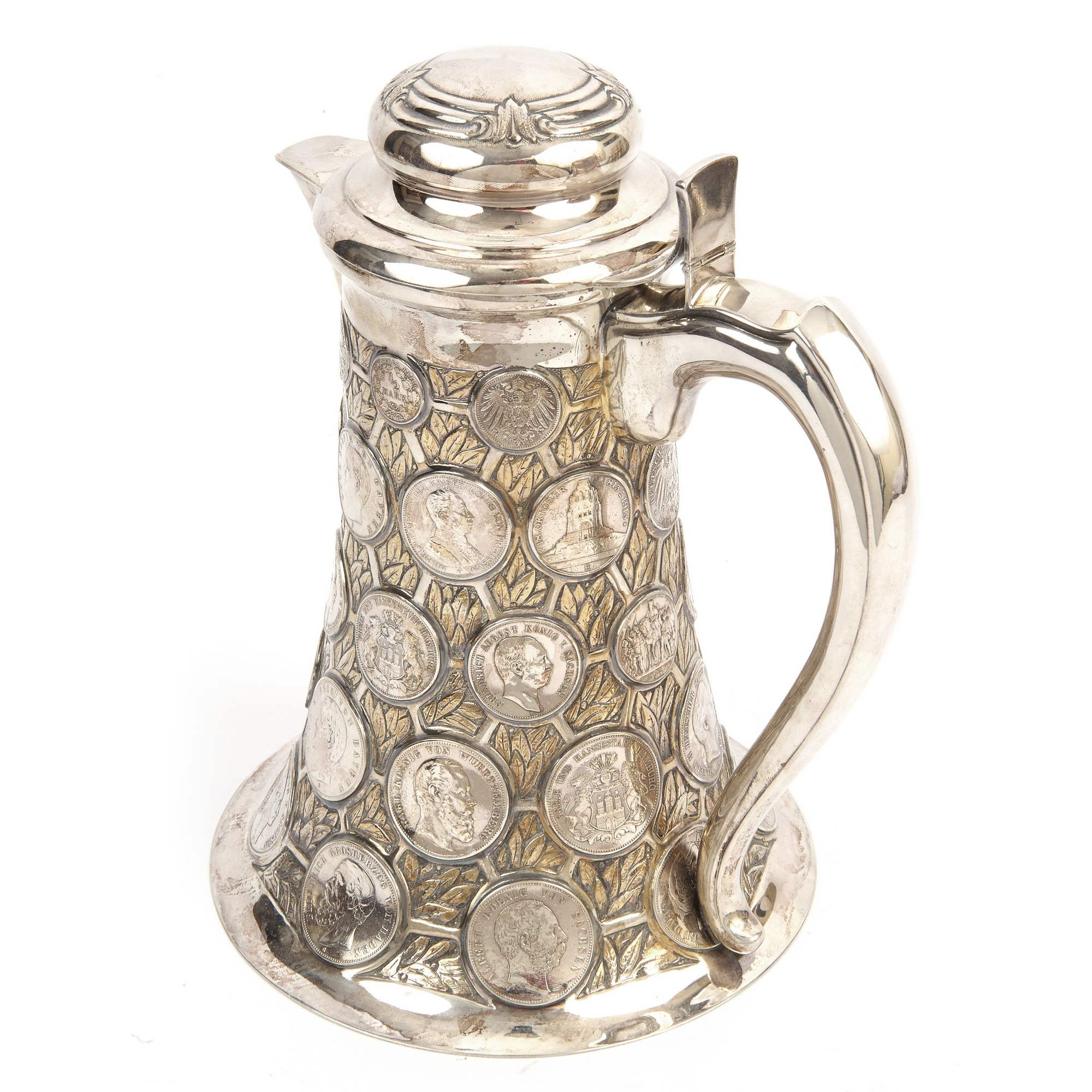 Красивый подарочный серебряный кувшин искусной работы немецких мастеров-ювелиров серебряного дела. Особого внимания заслуживает исполнение тулова в виде нумизматической коллекции. Декор его состоит из 38 немецких чеканных монет, обрамленных фоном с изящными лавровыми листьями. Стоит отметить, что монеты относятся к различным землям, имеют разные номиналы, а некоторые даже посвящены юбилеям, как например 3 саксонские марки из второго яруса, выпущенные монетным двором Мульденхюттена в честь 100-летия битвы при Лейпциге. Традиция создания нумизматических памятников уходит корнями в древность, а конкретно, в греческую античность. Начиная с эпохи Возрождения монетами стали украшать сосуды и кубки, распространившиеся позже в Европе, И ставшие предметами специального коллекционирования. С XVIII века такие «монетные сосуды» из цененных образцов коллекций нумизматов превратились в дорогие реликвии, которые преподносили в качестве дорогого и статусного подарка, как символ успеха и достатка, высокопоставленным лицам, промышленникам, банкирам. Представленный кувшин создан в начале XX века, что можно определить по использованным в декоре монетам. Сосуд совершенно точно имеет подарочный характер. К тому же, точность исполнения и близкие аналогии именитых немецких фирм, таких например, как берлинская фирма «Братья Фридландеры», не оставляют сомнений, что этот кувшин с монетами обладает всеми художественными достоинствами, характерными для эталонной немецкой ювелирной работы.