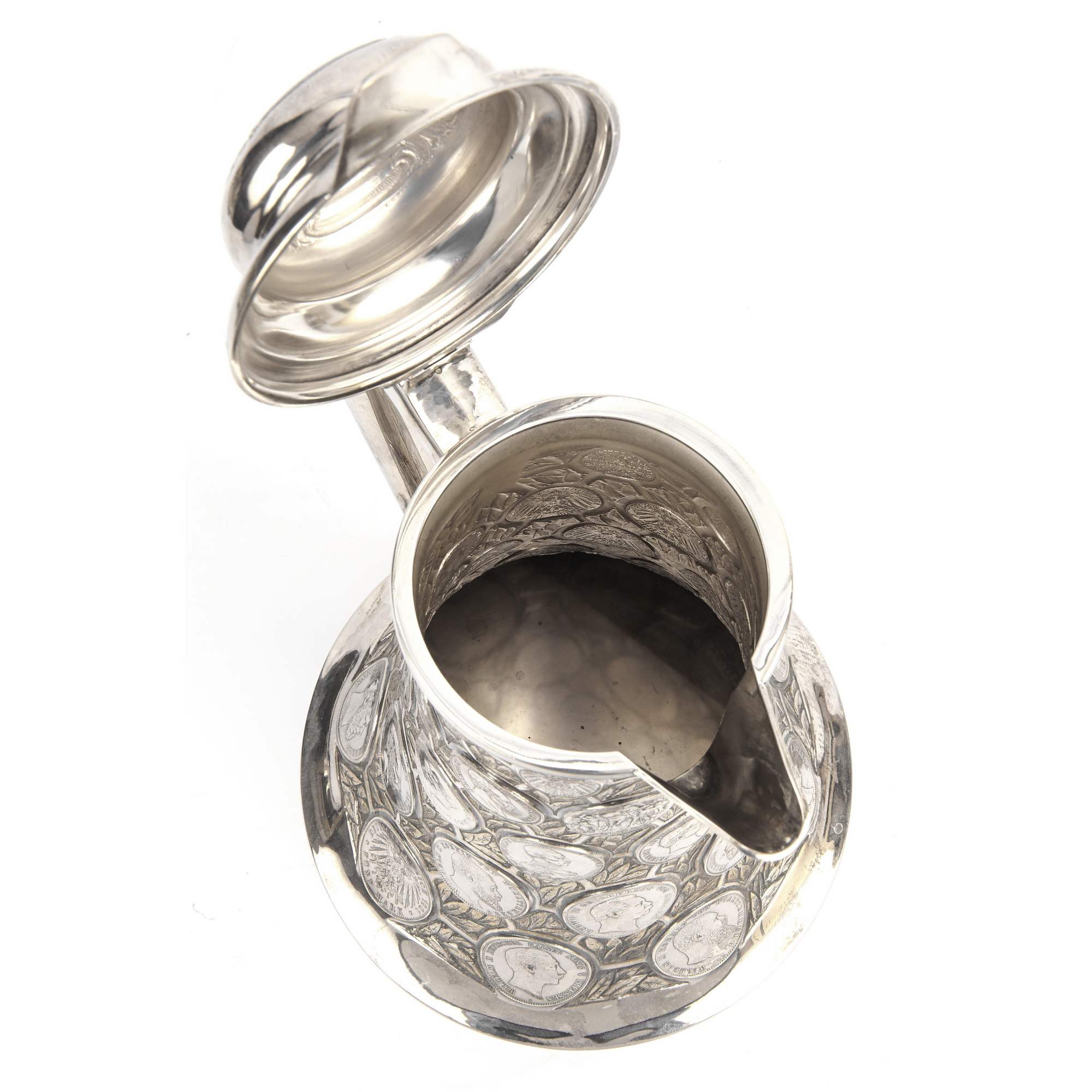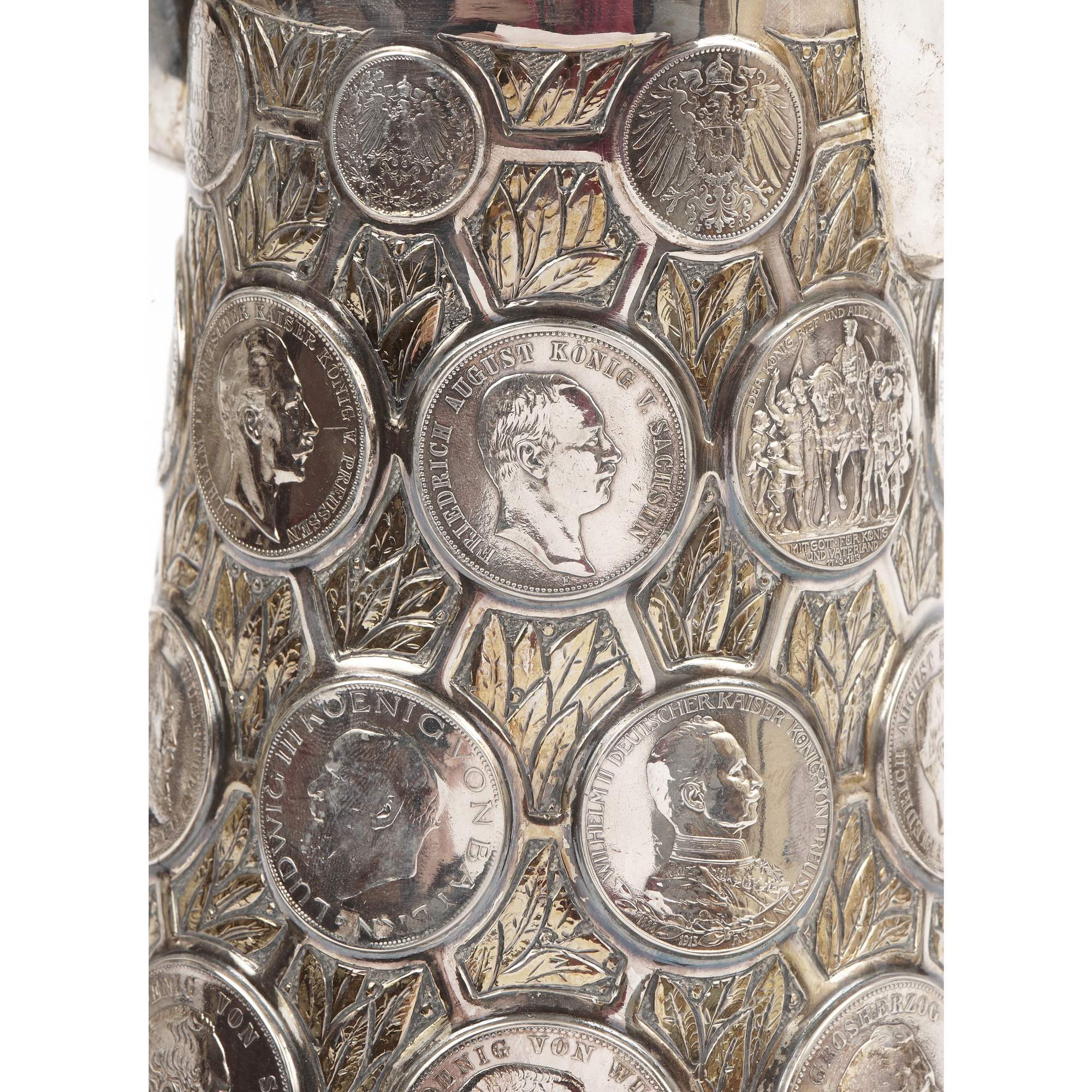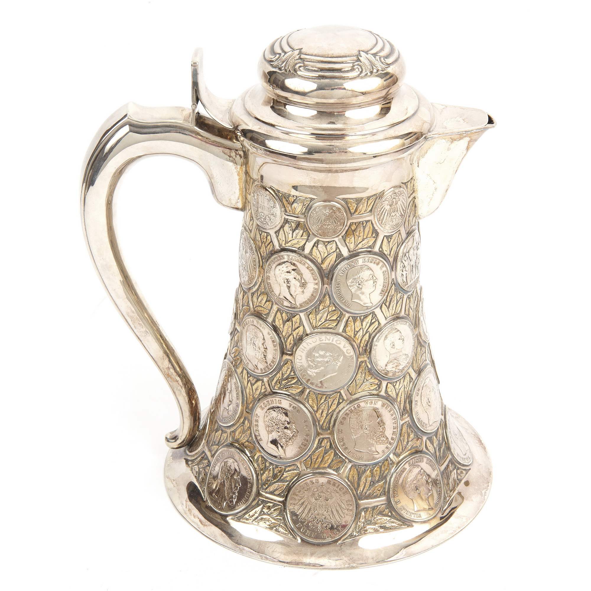 Красивый подарочный серебряный кувшин искусной работы немецких мастеров-ювелиров серебряного дела. Особого внимания заслуживает исполнение тулова в виде нумизматической коллекции. Декор его состоит из 38 немецких чеканных монет, обрамленных фоном с изящными лавровыми листьями. Стоит отметить, что монеты относятся к различным землям, имеют разные номиналы, а некоторые даже посвящены юбилеям, как например 3 саксонские марки из второго яруса, выпущенные монетным двором Мульденхюттена в честь 100-летия битвы при Лейпциге. Традиция создания нумизматических памятников уходит корнями в древность, а конкретно, в греческую античность. Начиная с эпохи Возрождения монетами стали украшать сосуды и кубки, распространившиеся позже в Европе, И ставшие предметами специального коллекционирования. С XVIII века такие «монетные сосуды» из цененных образцов коллекций нумизматов превратились в дорогие реликвии, которые преподносили в качестве дорогого и статусного подарка, как символ успеха и достатка, высокопоставленным лицам, промышленникам, банкирам. Представленный кувшин создан в начале XX века, что можно определить по использованным в декоре монетам. Сосуд совершенно точно имеет подарочный характер. К тому же, точность исполнения и близкие аналогии именитых немецких фирм, таких например, как берлинская фирма «Братья Фридландеры», не оставляют сомнений, что этот кувшин с монетами обладает всеми художественными достоинствами, характерными для эталонной немецкой ювелирной работы.