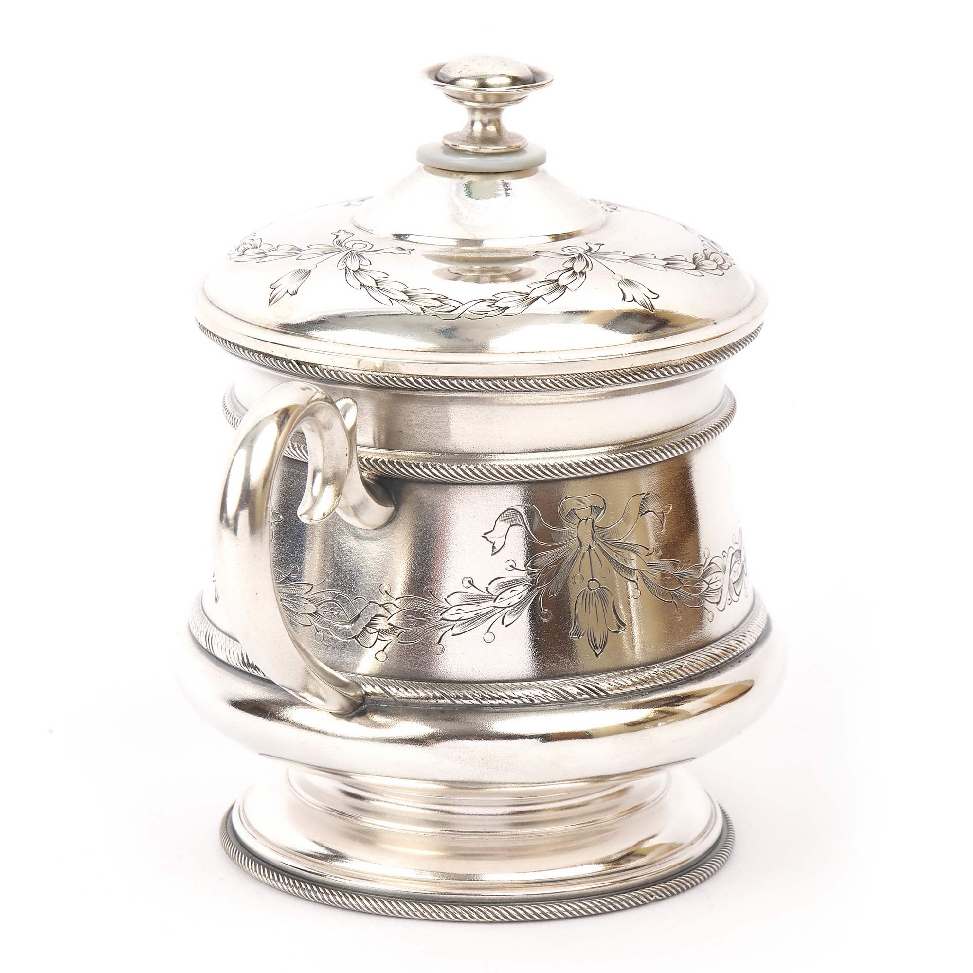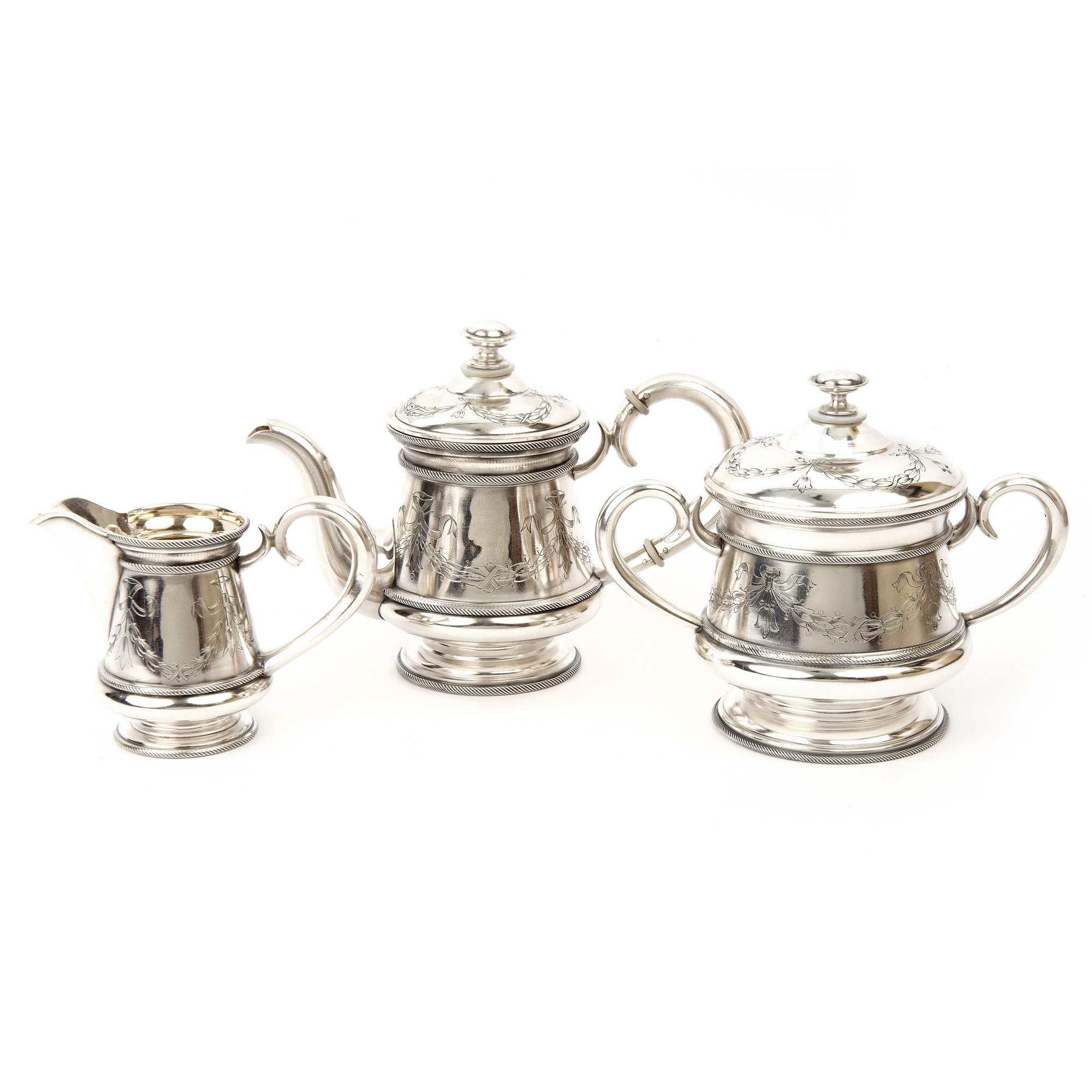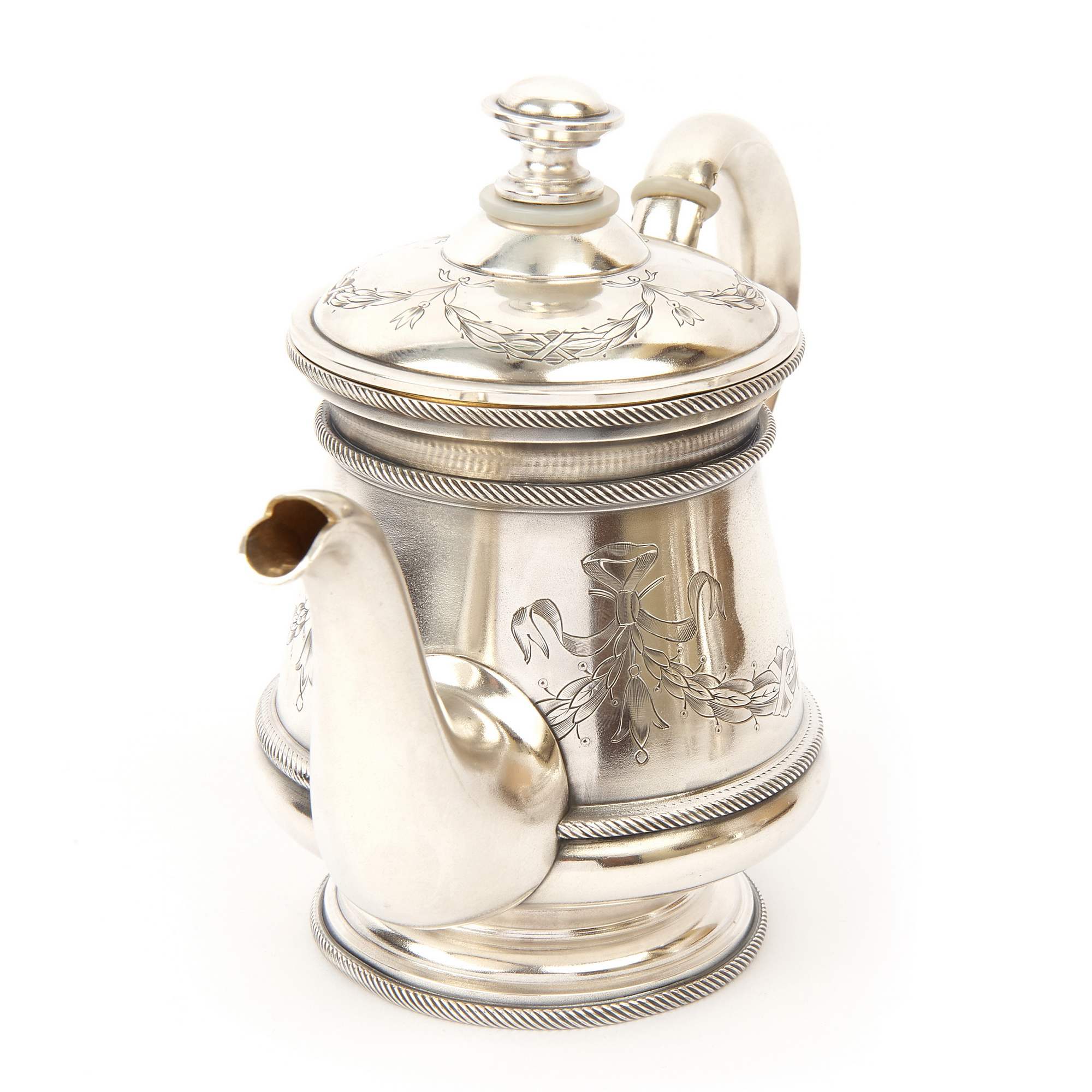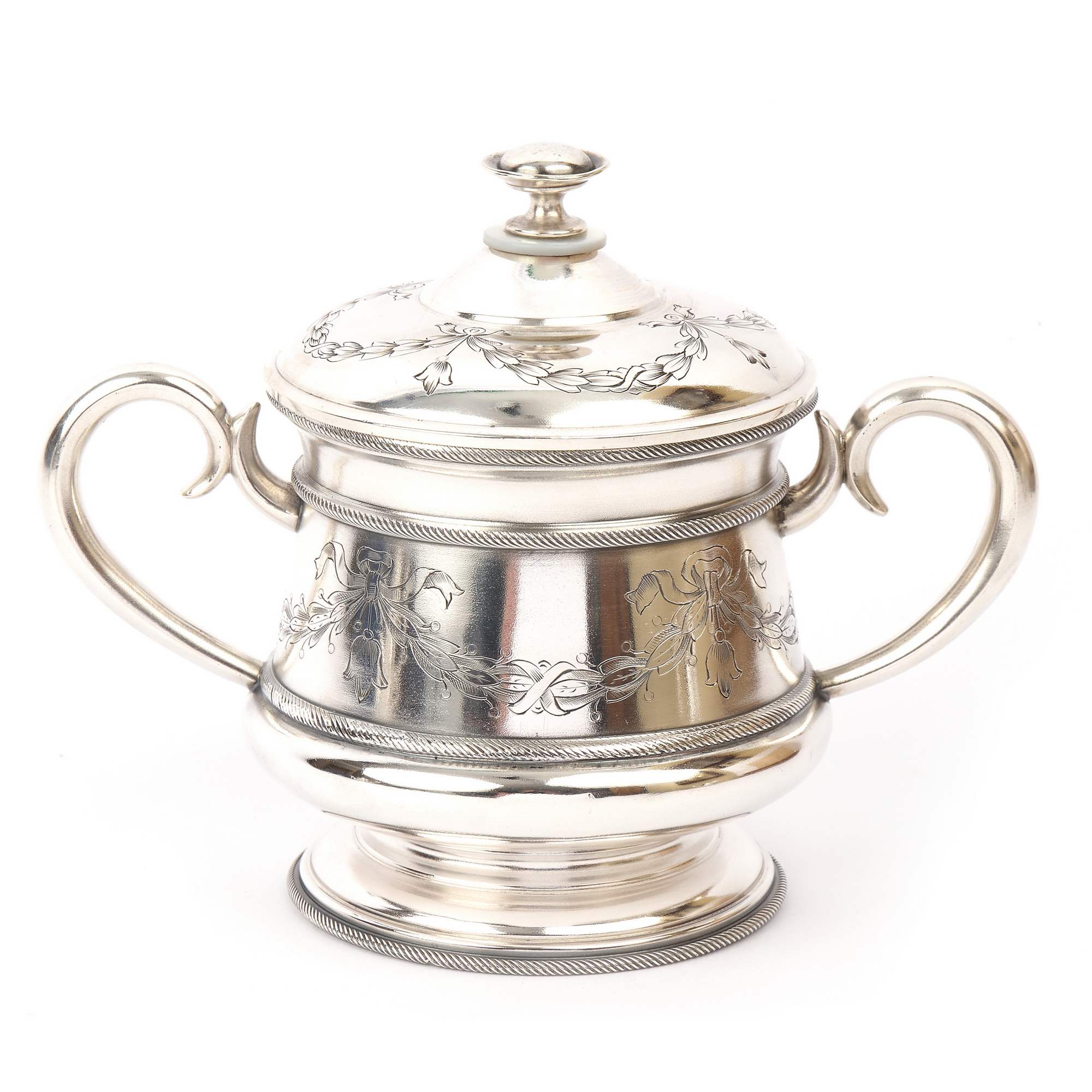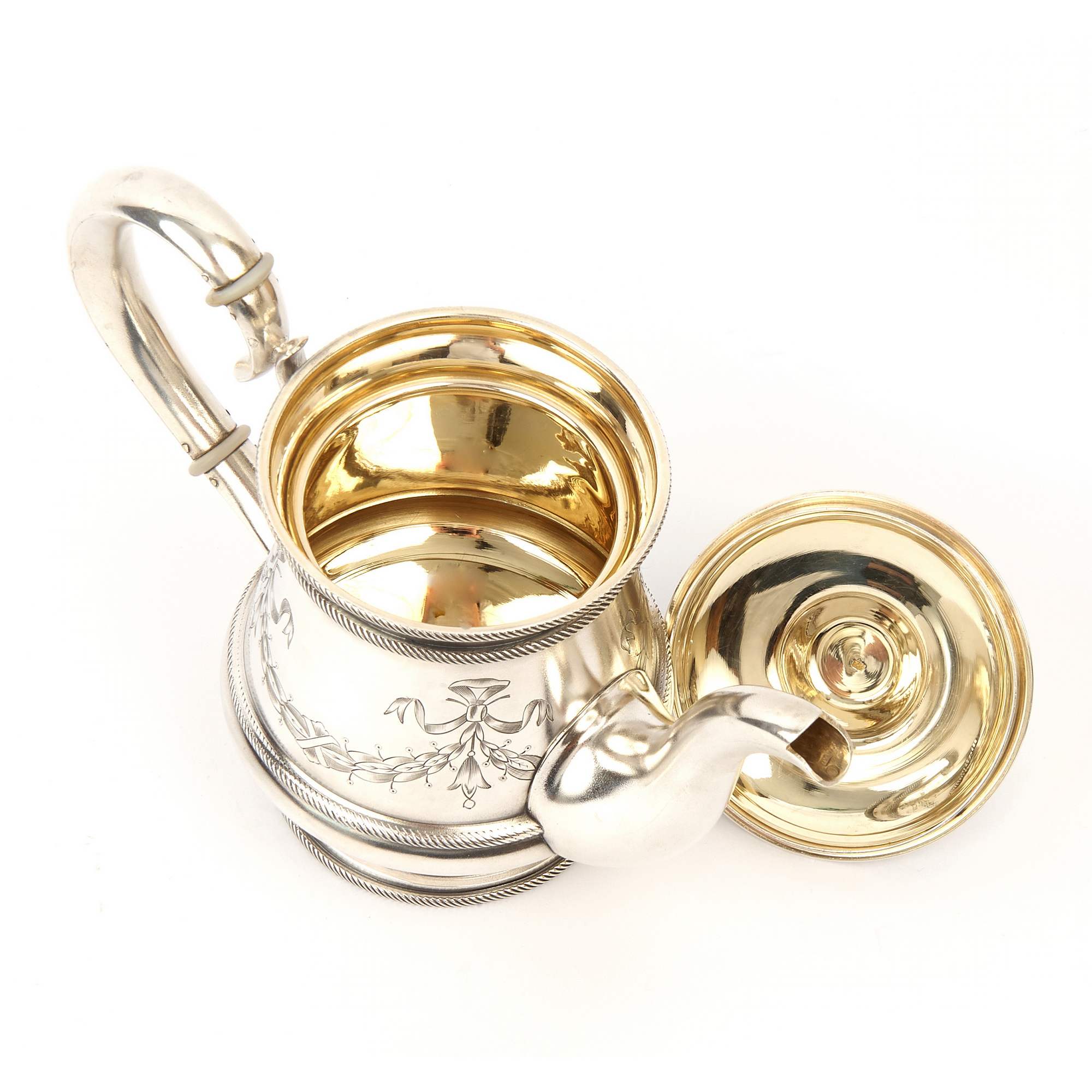Замечательный старинный чайный сервиз из трех предметов. Работа известной ювелирной фабрики Хлебникова.