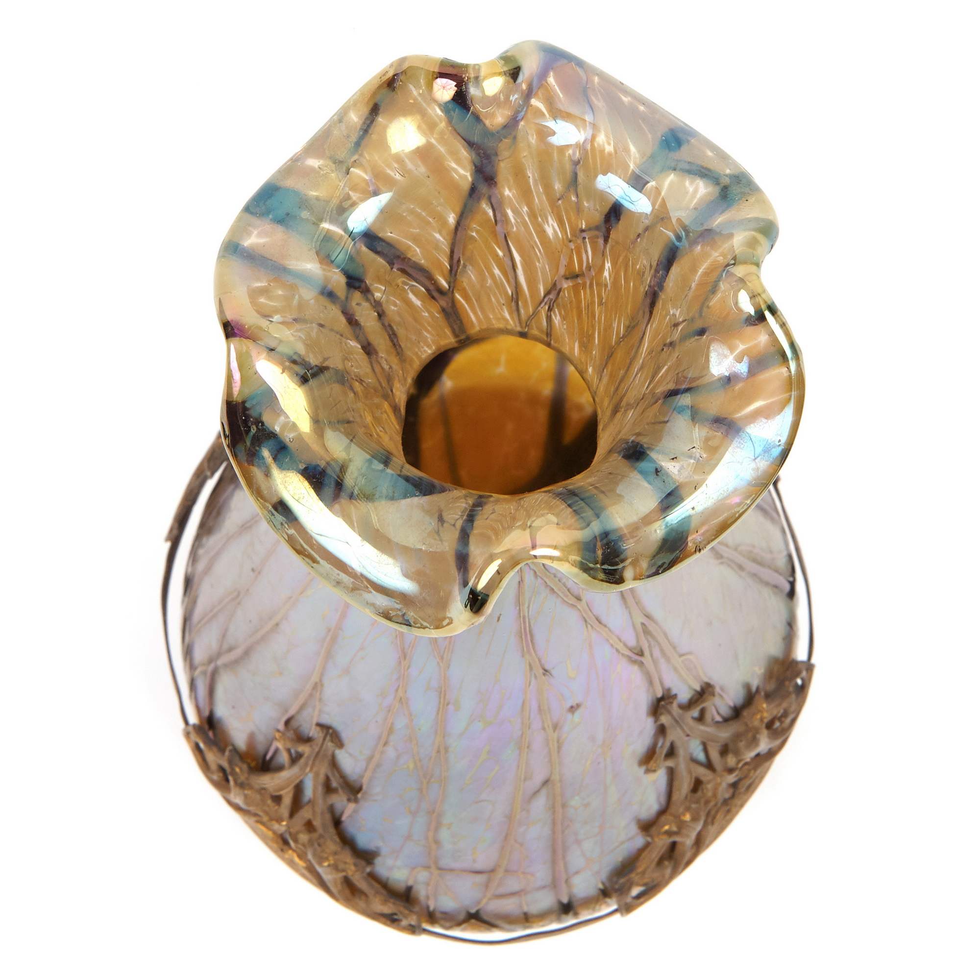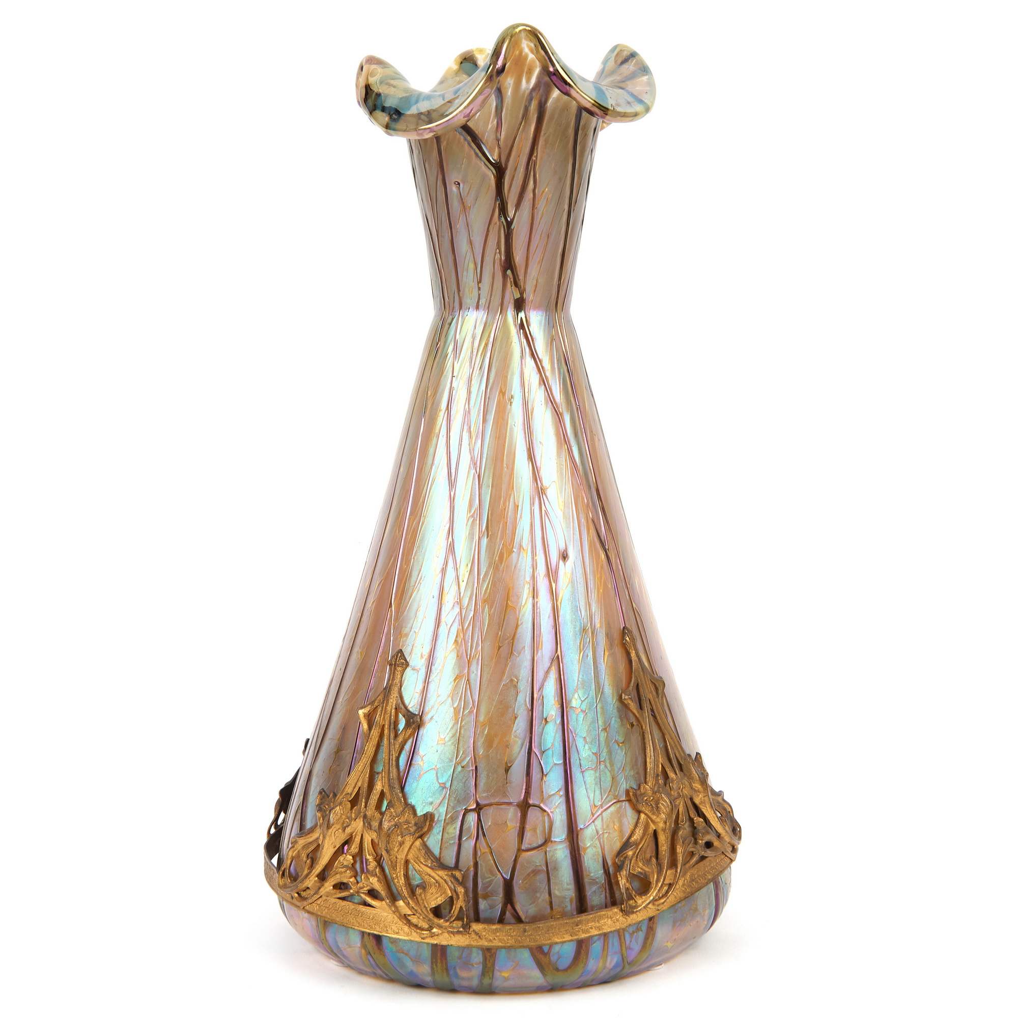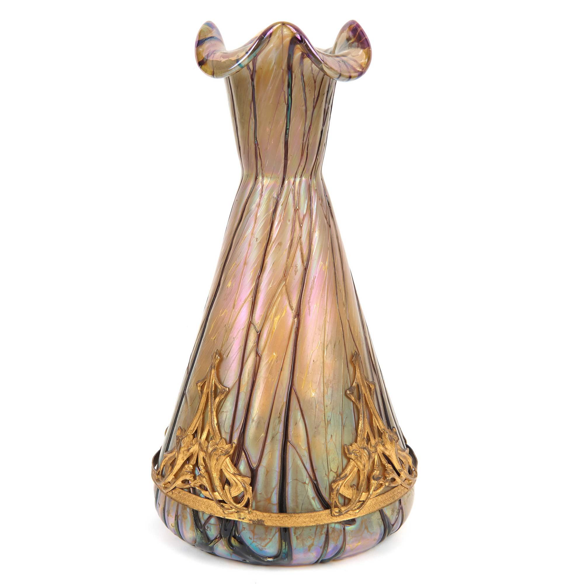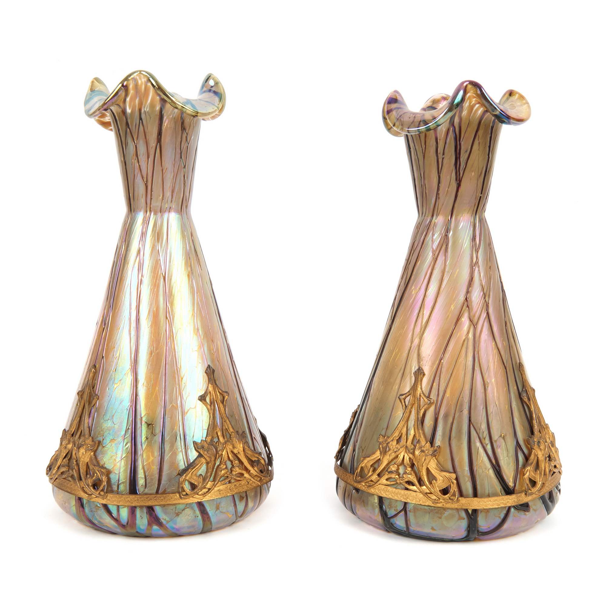 Очень красивые парные вазы эпохи модерна от ведущего чешского стекольного завода. Предприятие было основано в 1877 году, успешно развивалось и к началу XX века стало одним из лучших европейских производителей художественного стекла, на котором трудились свыше 400 человек. Отличное оборудование и высокое мастерство дизайнеров и рабочих позволяло применять в производстве широкий спектр технологий: от иризированного стекла, до гравировки и росписи эмалями. Впечатленные успехом, красотой и необычным дизайном произведений знаменитой фирмы Тиффани, мастера этой замечательной чешской фирмы разработали свою технологическую линейку «варки» стекла с добавлением в него разных компонентов, самоцветов; опалов, агатов и т. д. Добились прекрасных результатов и стали производить широкий спектр замечательных изделий, но уже по ценам доступным покупателям со средним достатком, сделав свою продукцию доступной широкому слою потребителей. Антиквариат. Отличная сохранность. Следы бытования.