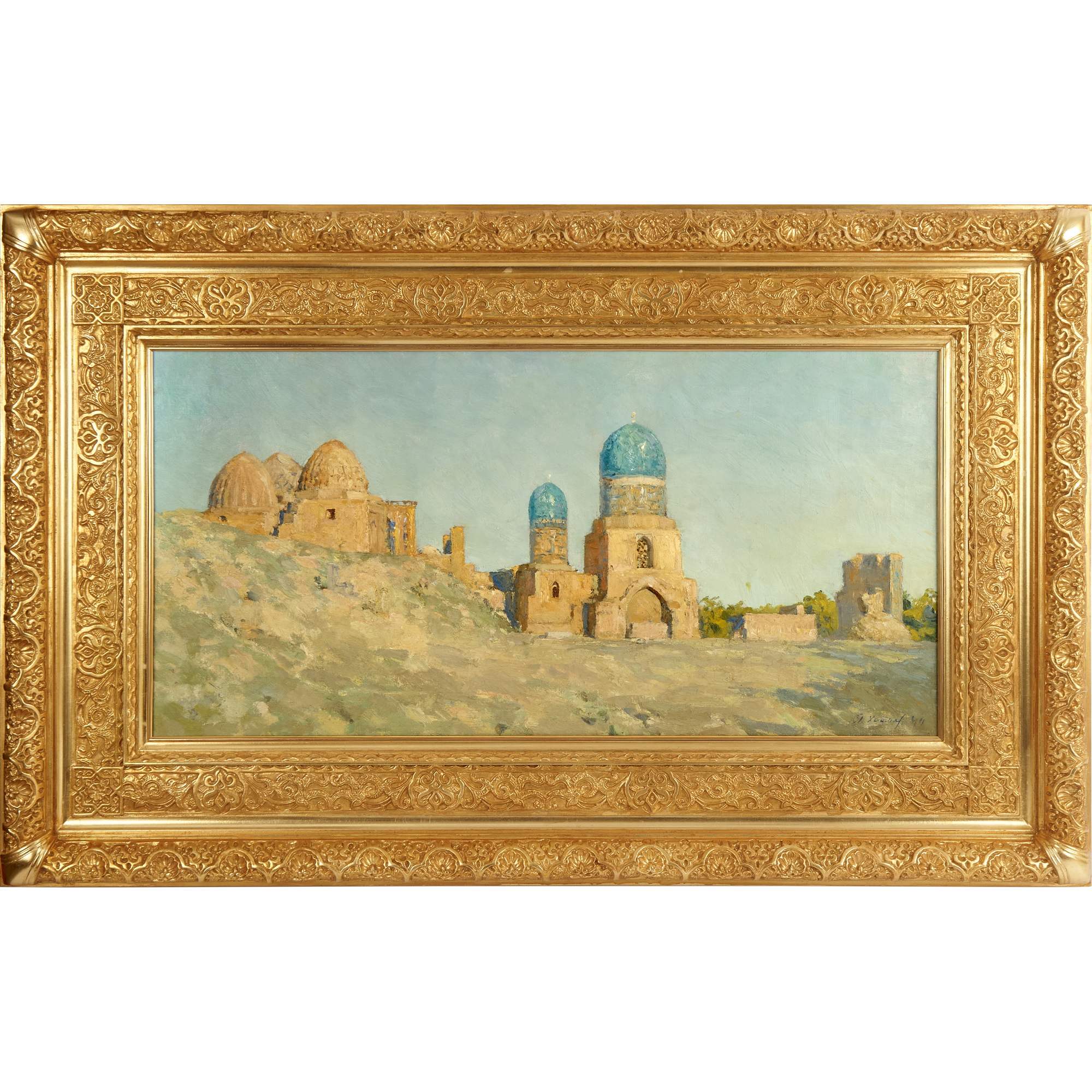 Замечательная картина с изображением ансамбля Шах-и-Зинда в Самарканде кисти известного советского художника Хаимова Якова Марковича. Запечатленный архитектурный ансамбль восточного средневековья передан качественно и исторически правдоподобно, чему способствует выверенная композиция.