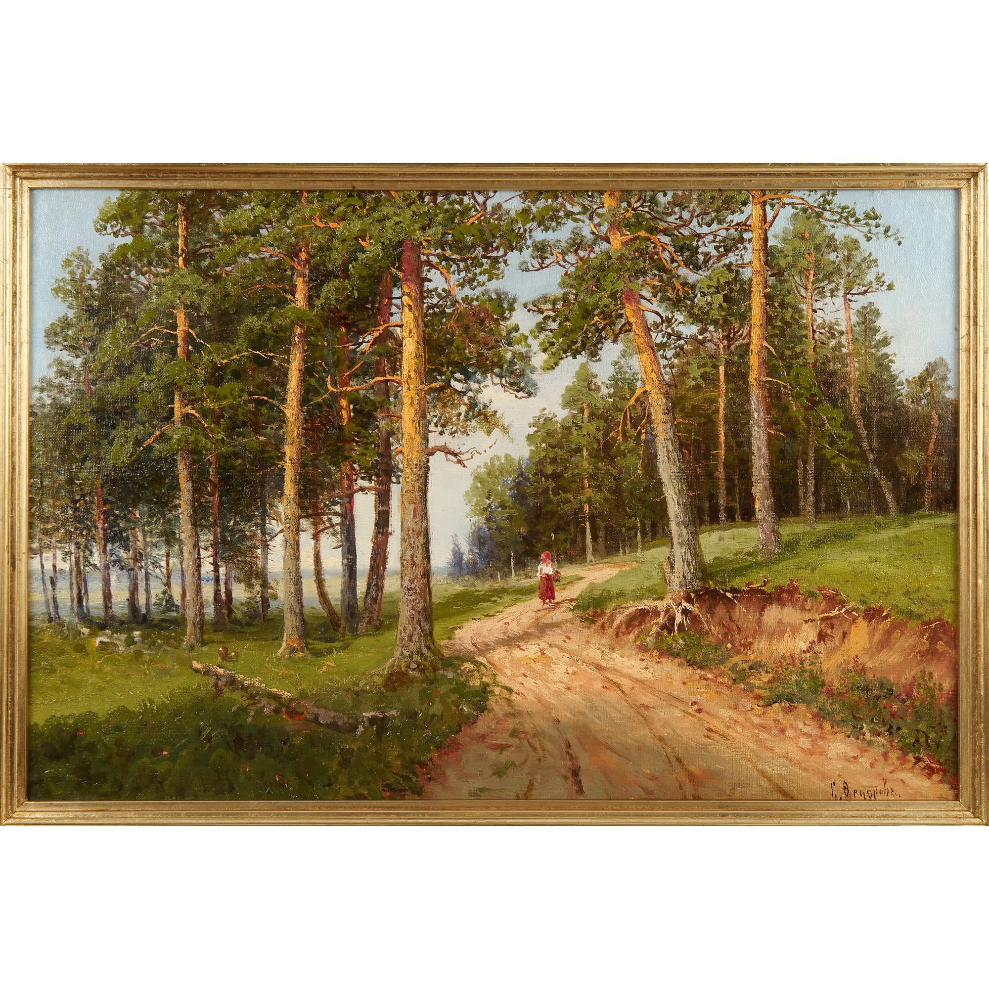 Красивая старинная картина, с песчаной дорогой в сосновом лесу. Картина дышит свежестью, жизнью, густым и приятным хвойным воздухом. Художник, мастерски передавший захватывающую красоту русской природы - Семен Федоров, известный русский художник-пейзажист конца XIX века. Родился в крестьянской семье, служил кадровым военным – участвовал в русско-японской войне. Живописью занимался для души, принимал участие в выставках. Ключевую роль в его судьбе сыграл президент Императорской Академии художеств Великий князь Владимир Александрович, высоко оценивший одну из работ художника. Великому князю столь понравился пейзаж Федорова, что он приказал перевести его в запас и принять в ИАХ, в мастерскую великого пейзажиста И.И. Шишкина и Ю.Ю. Клевера. От учителей выдающийся мастер унаследовал любовь к лесному пейзажу, наполненному светом, пышными деревьями и удивительный талант, наполнять дыханием живой родной природы свои произведения. Важной темой в творчестве художника стали родные пейзажи, не только бескрайние просторы полей и лесов России, но и церкви, часовни, монастыри: известны его работы, посвященные Валаамскому монастырю и его окрестностям, выполненные в лучших традициях русской живописной реалистической школы. Хорошая сохранность. Антиквариат.