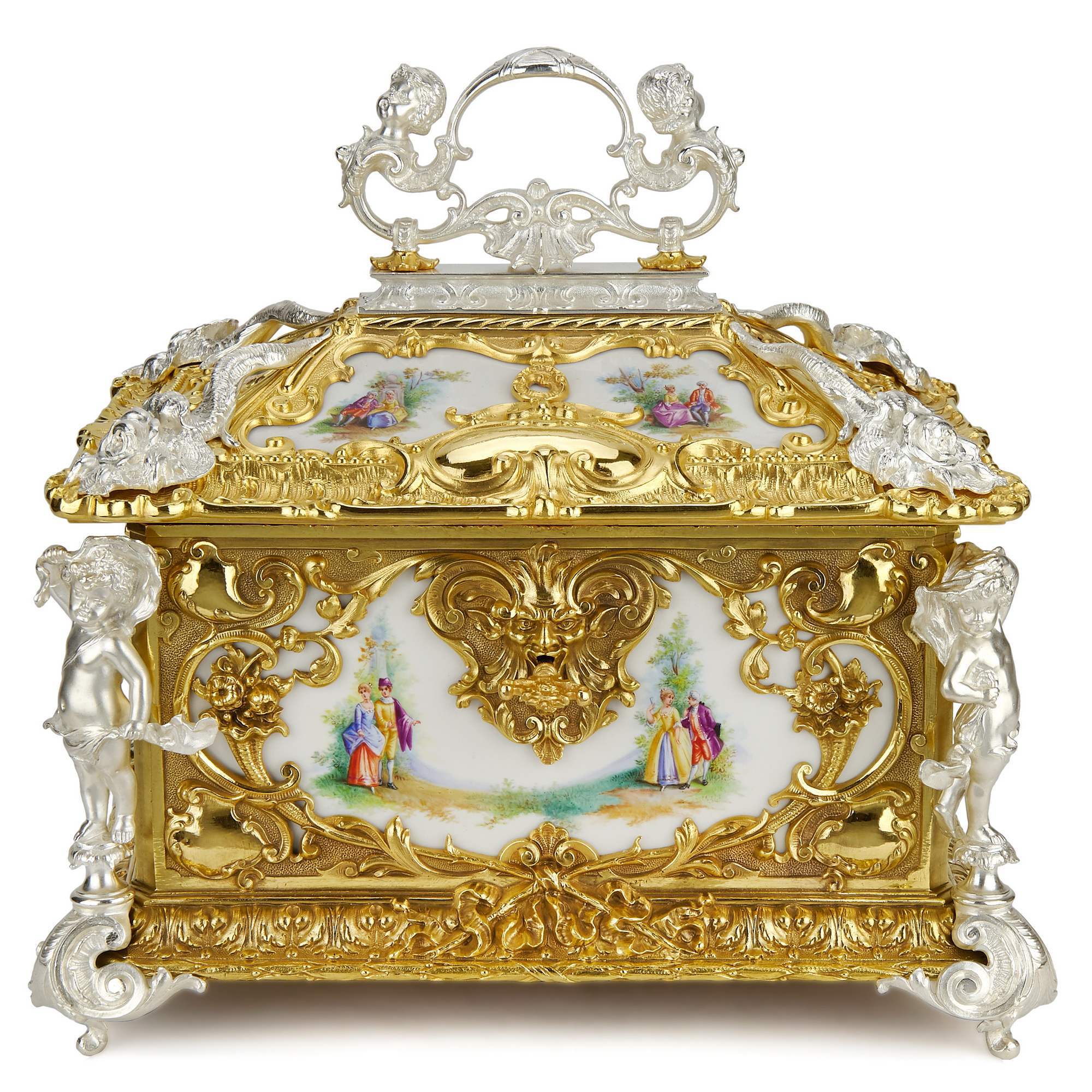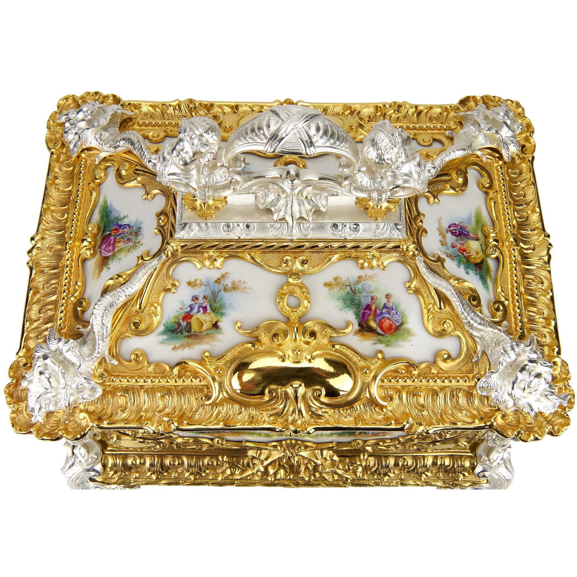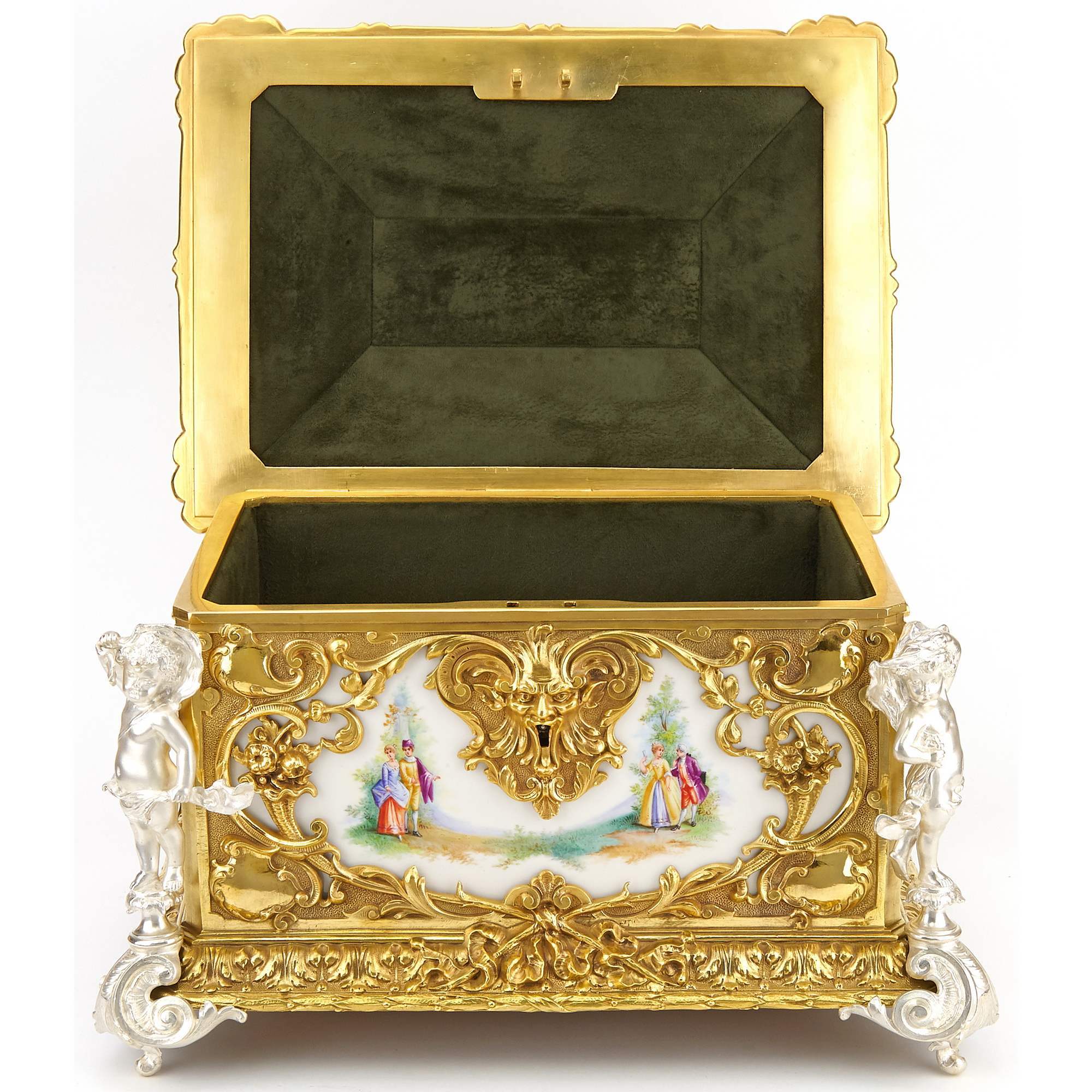 Роскошный, большой, старинный ларец для драгоценностей с восьмью фарфоровыми пластами с изображением «галантных сцен» в богатом обрамлении из золоченой и серебреной бронзы. Закрывается на ключик. Антиквариат. Прекрасная сохранность. Внутри произведена замена ткани на новый натуральный бархат, для удобства пользования.