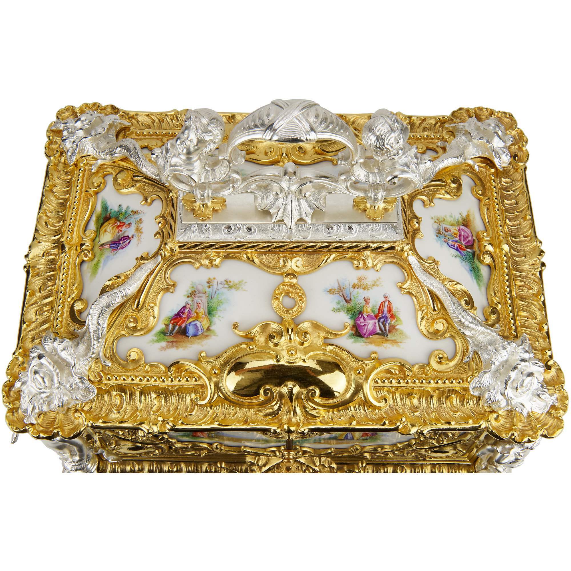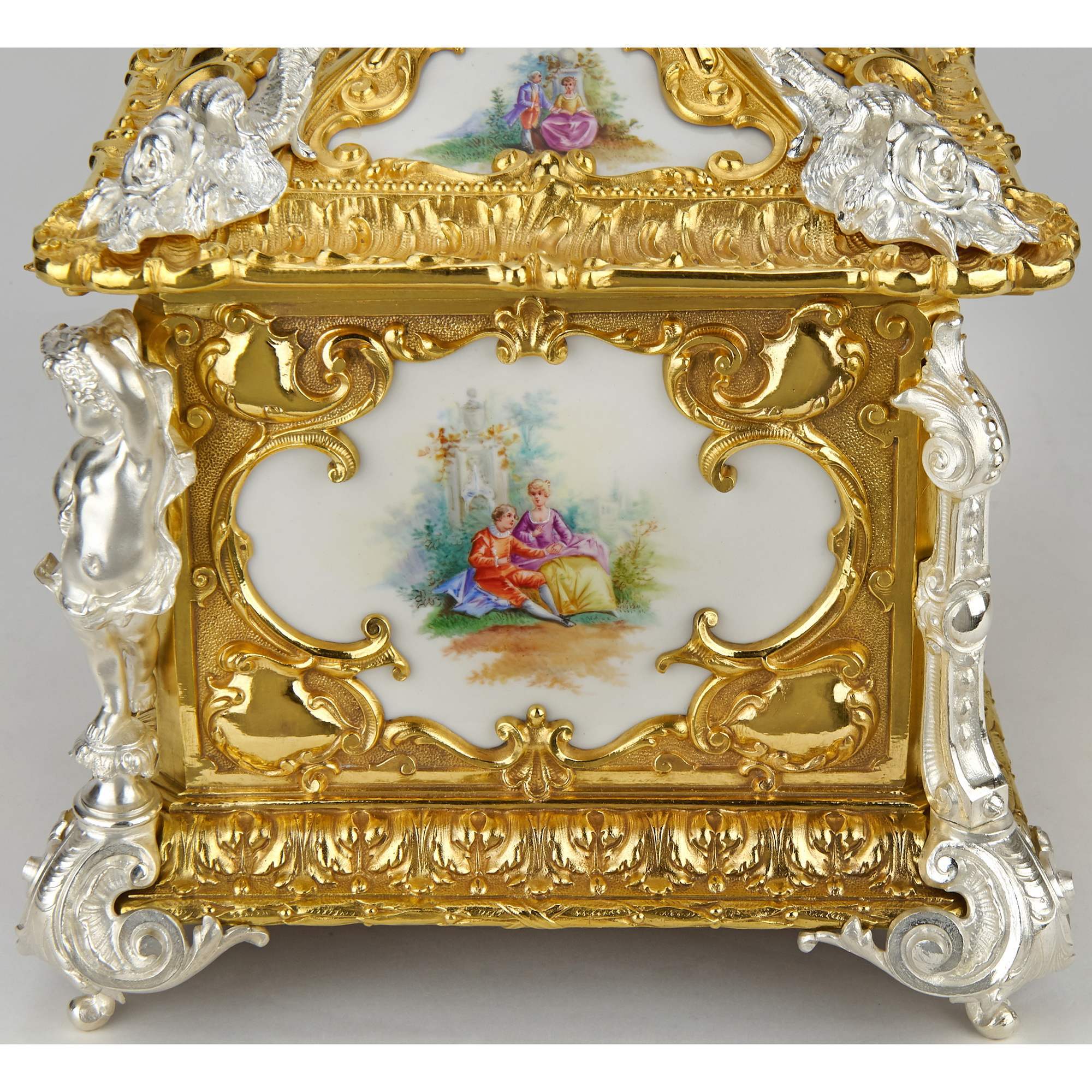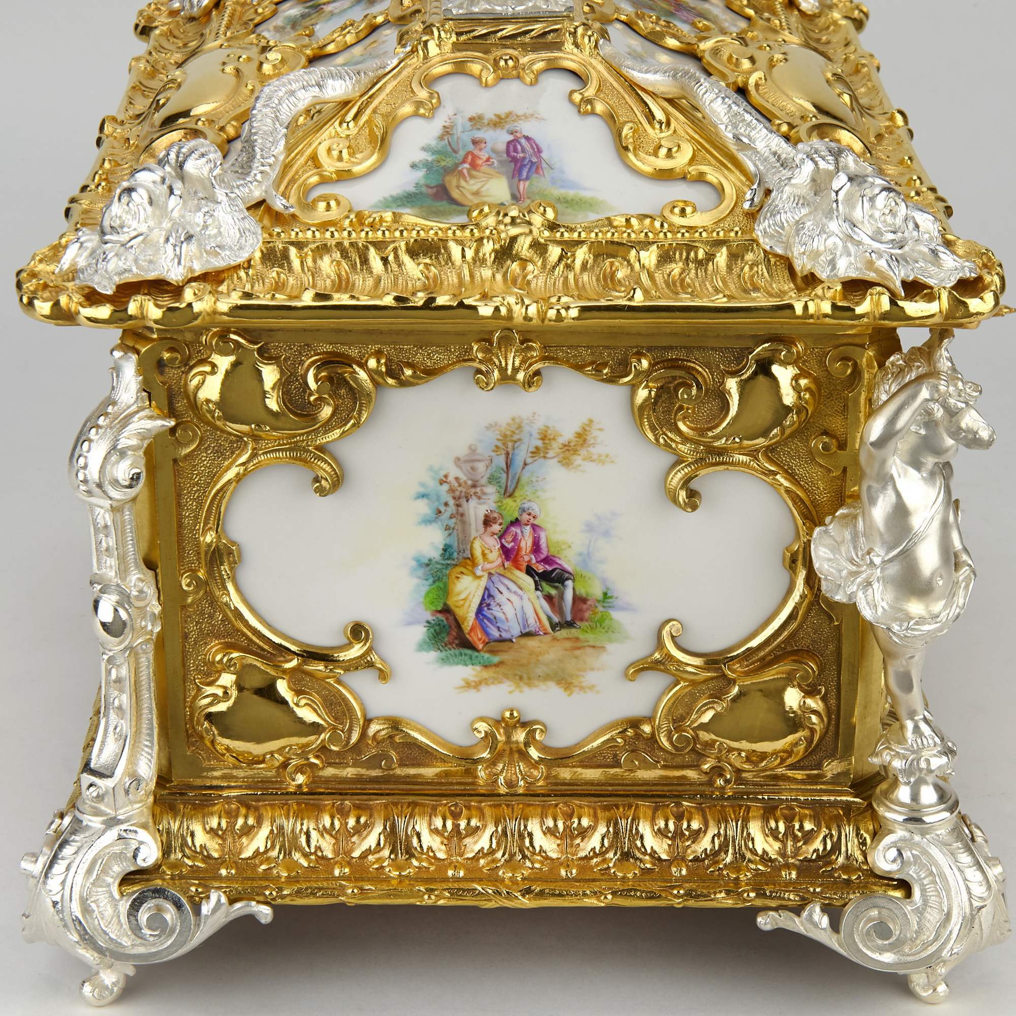 Фарфор, надглазурная полихромная роспись. Бронза, золочение, серебрение. Редкость.