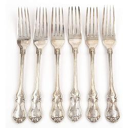 Комплект из шести старинных, красивейших столовых вилок. Изготовлены русским мастером серебряного дела Юденом Адомом в Санкт-Петербурге в 1856-м году.