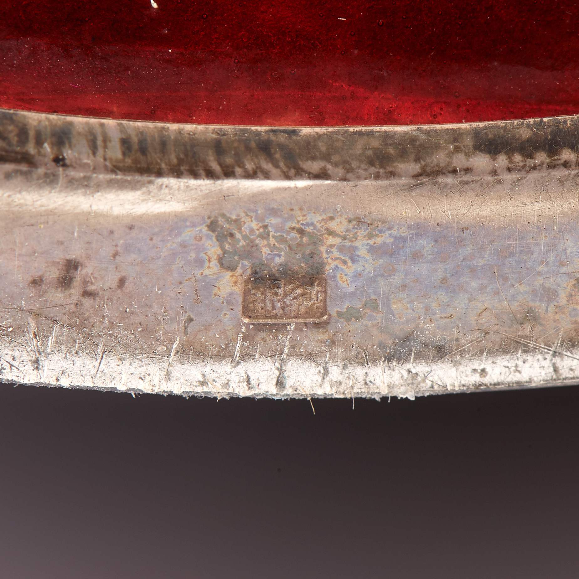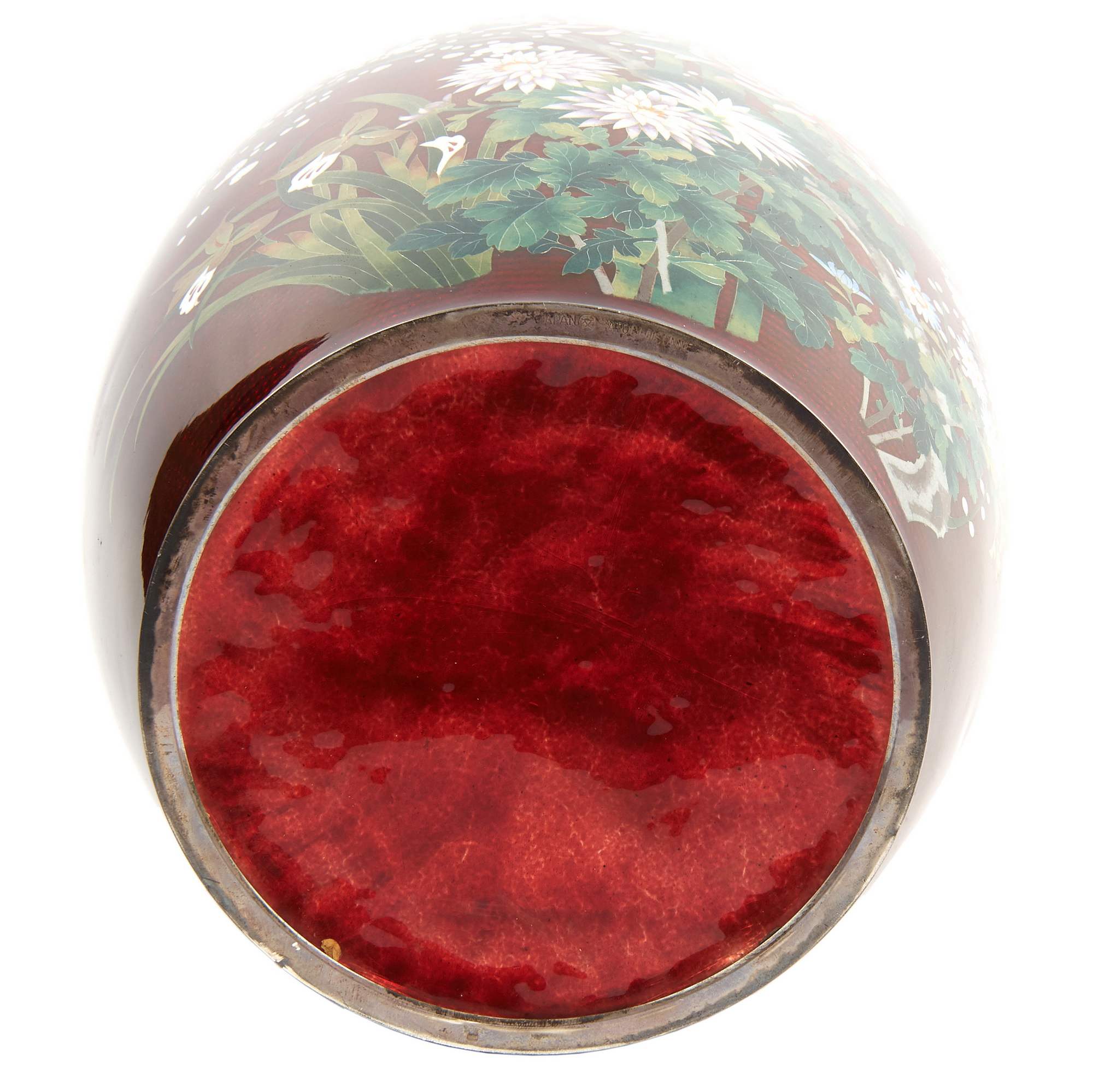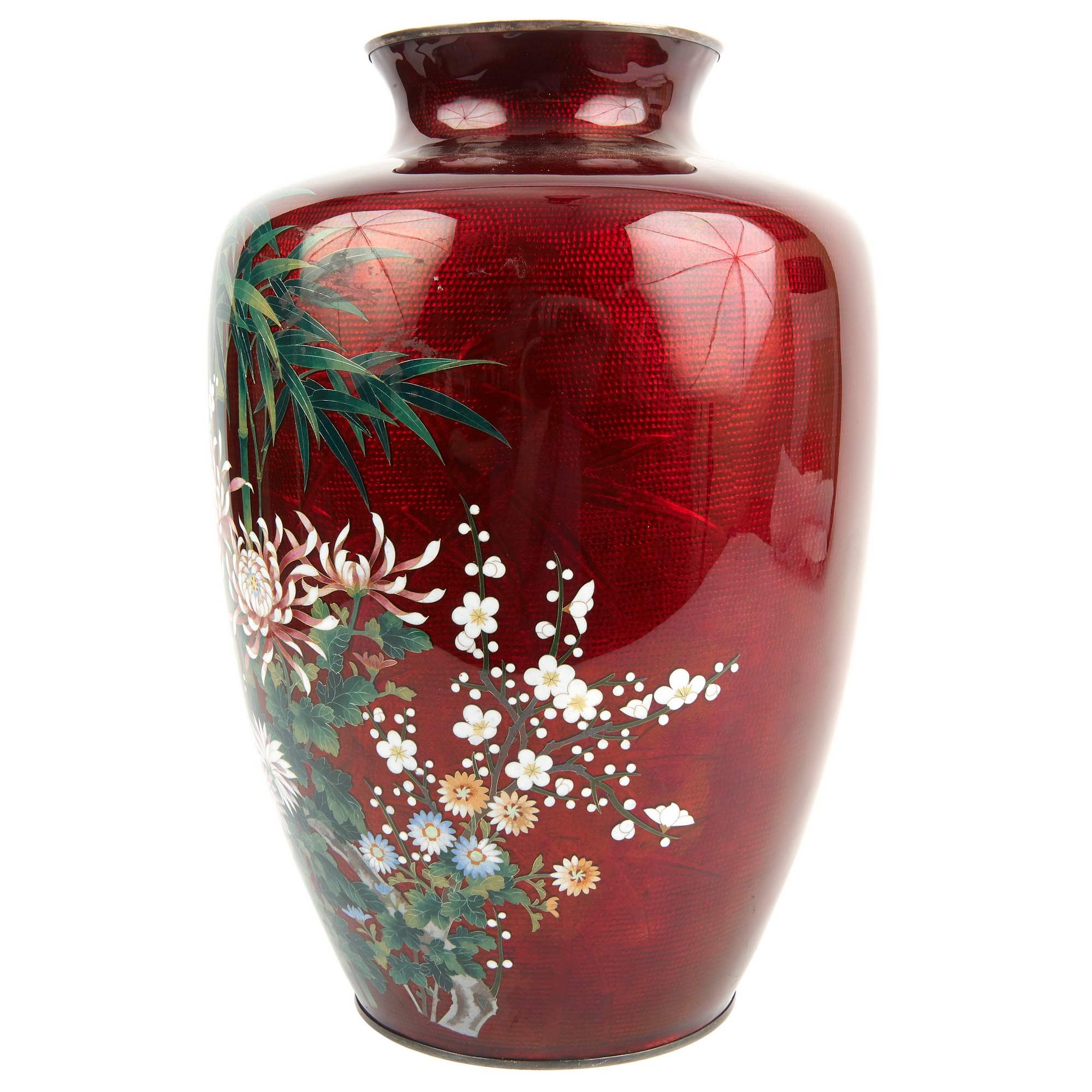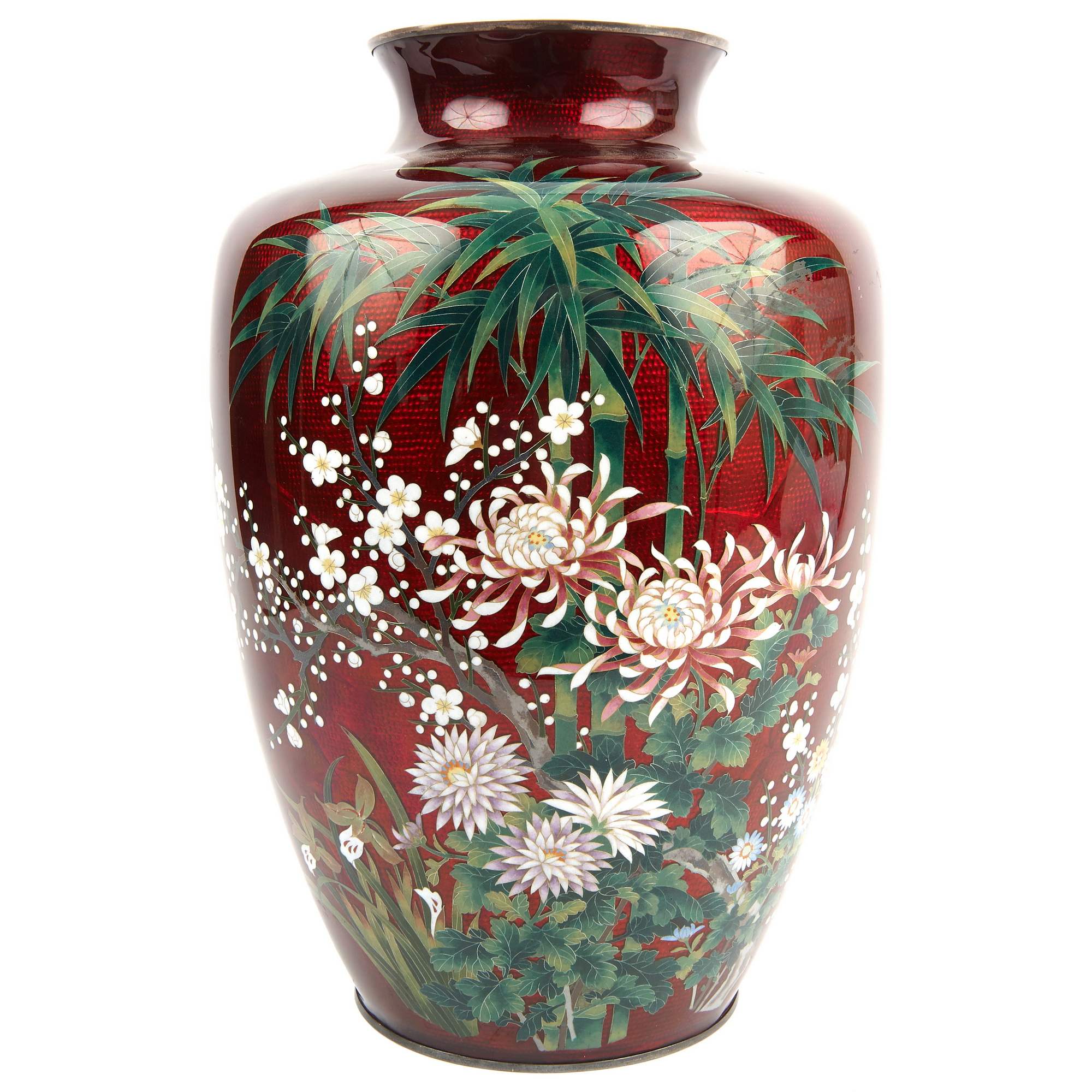 Великолепная, красивейшая старинная ваза из белого металла с высоким содержанием серебра с эмалью в японском стиле с изображением цветов. Изделия в стиле «акасукэ», к числу которых относится представленная ваза, украшались на основе красной (тёмно-вишнёвой) эмали, очень высоко оцененной на западе и получившей название «рубиновое клуазоне, золотой рубин». Рисунки выполнены эмалями в оригинальных техниках, именуемых «сиппо», занимающих особое место в декоративно-прикладном искусстве как Японии, так и мира в целом. В эпоху, когда Япония и остальной мир взаимно открывали друг друга, художественные изделия японских мастеров выполняли высокую миссию, представляя миру Страну восходящего солнца через ее культуру. При этом представленная ваза отмечена также сюжетом, традиционно наполненным символическим смыслом. Слива - символ брака и счастья, пион - означает мужество, храбрость, честь, а также богатство и процветание. Цветы ириса символизируют мужество и упорство, а анемоны выражают нежность и надежду. Листья бамбука благодаря стойкости растения стали символом силы, долголетия и роста. Отличительной особенностью данной вазы является прекрасное владение сложнейшими техниками эмалирования «сиппо» мастерами известной японской компании Сато Бундзабуро, яркая декоративность изделия, и, что немаловажно и редко, прекрасная сохранность. Изделия фирмы украшают многие известные коллекции японского искусства и музейные собрания.