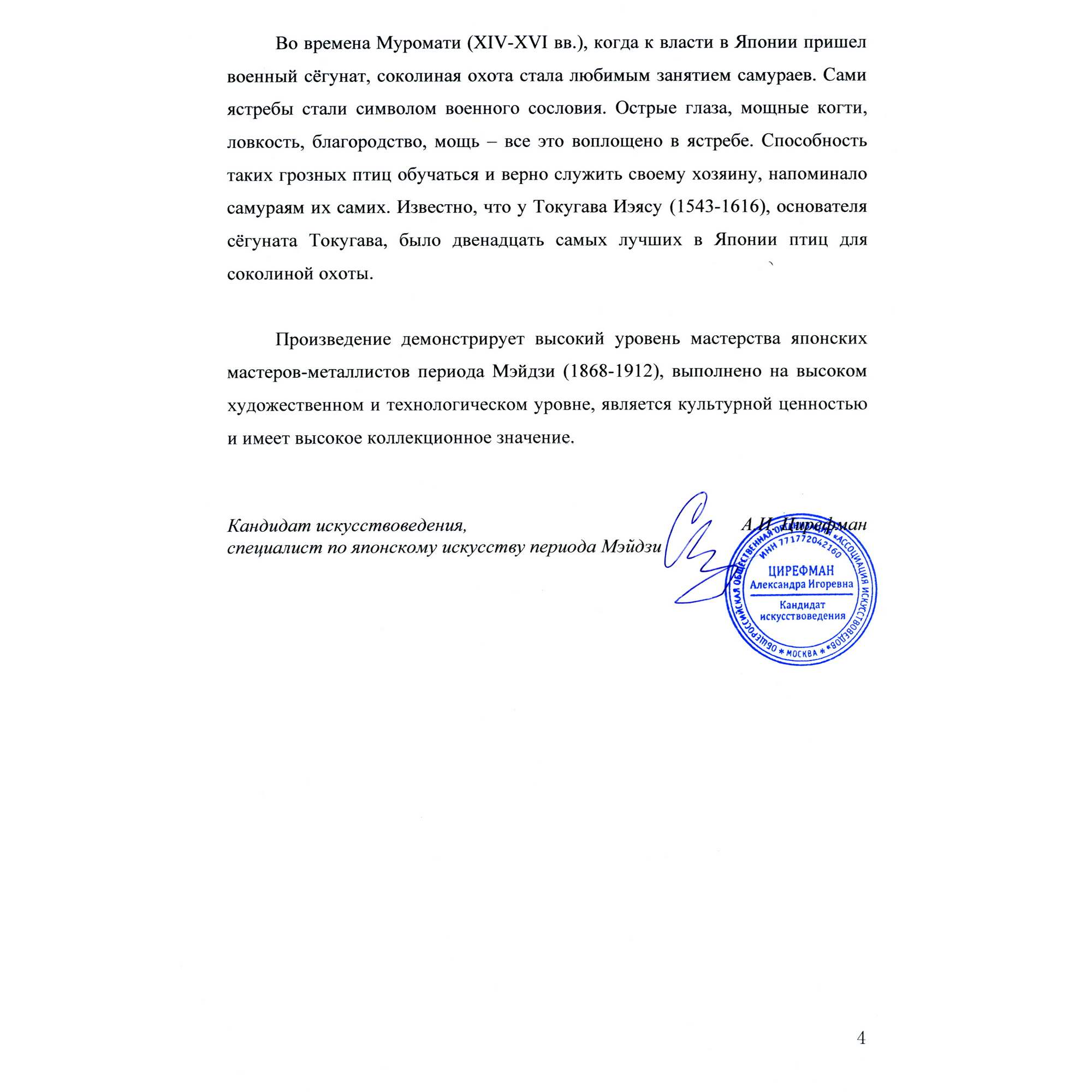 Экспертное заключение специалиста по японскому искусству периода Мейдзи А.И. Цирефан.